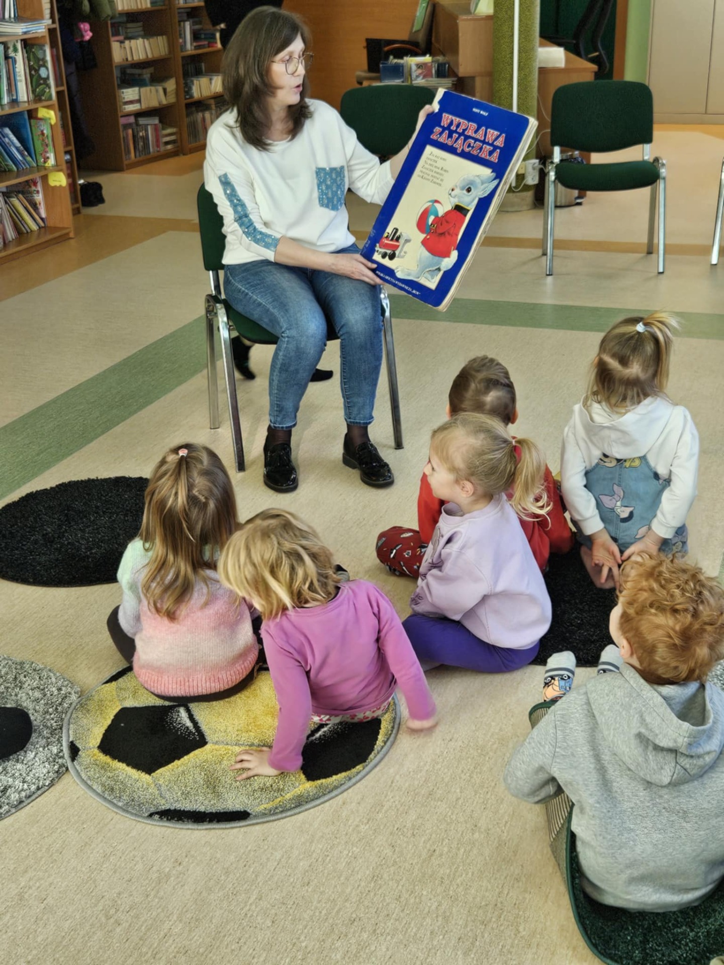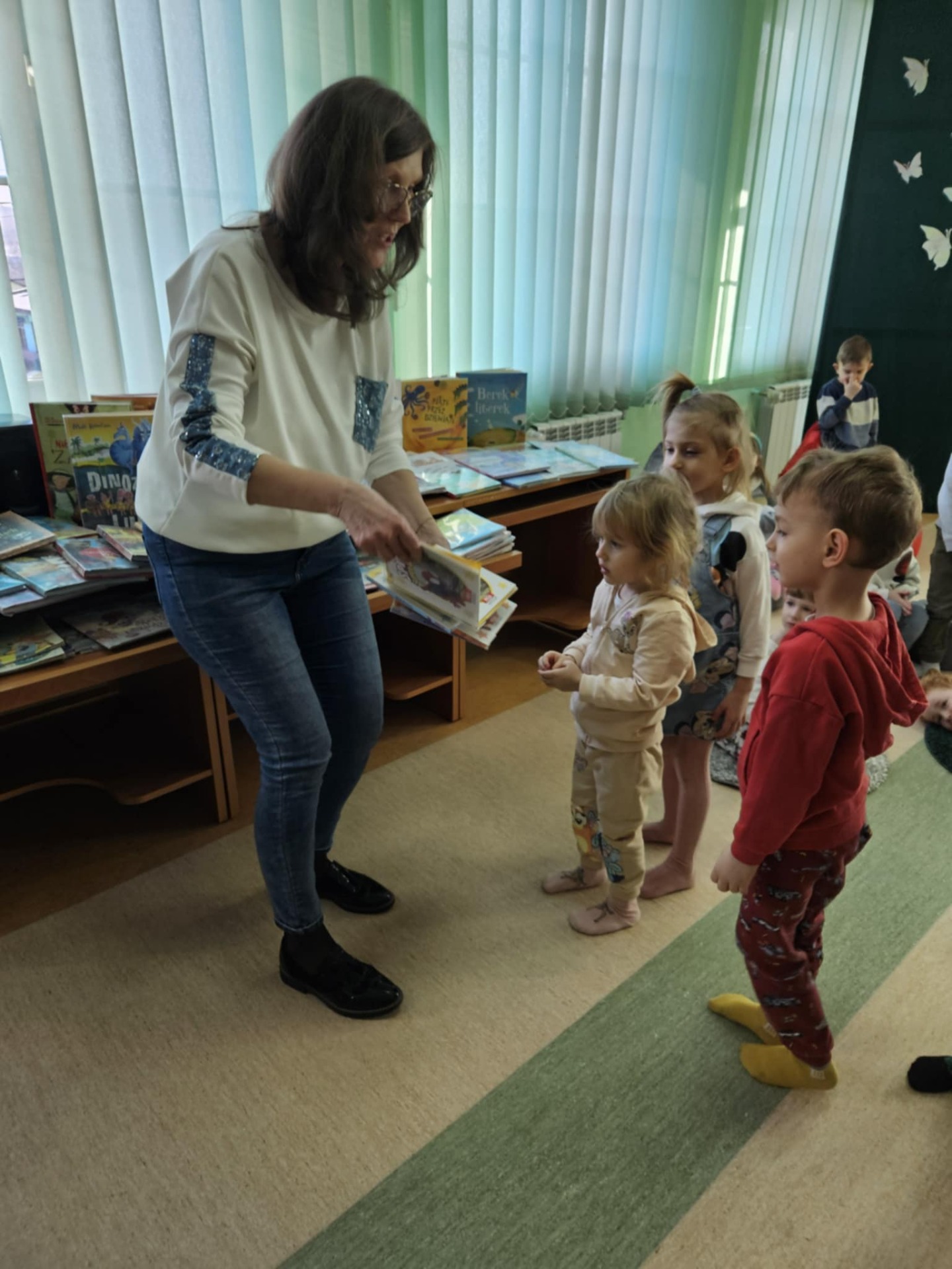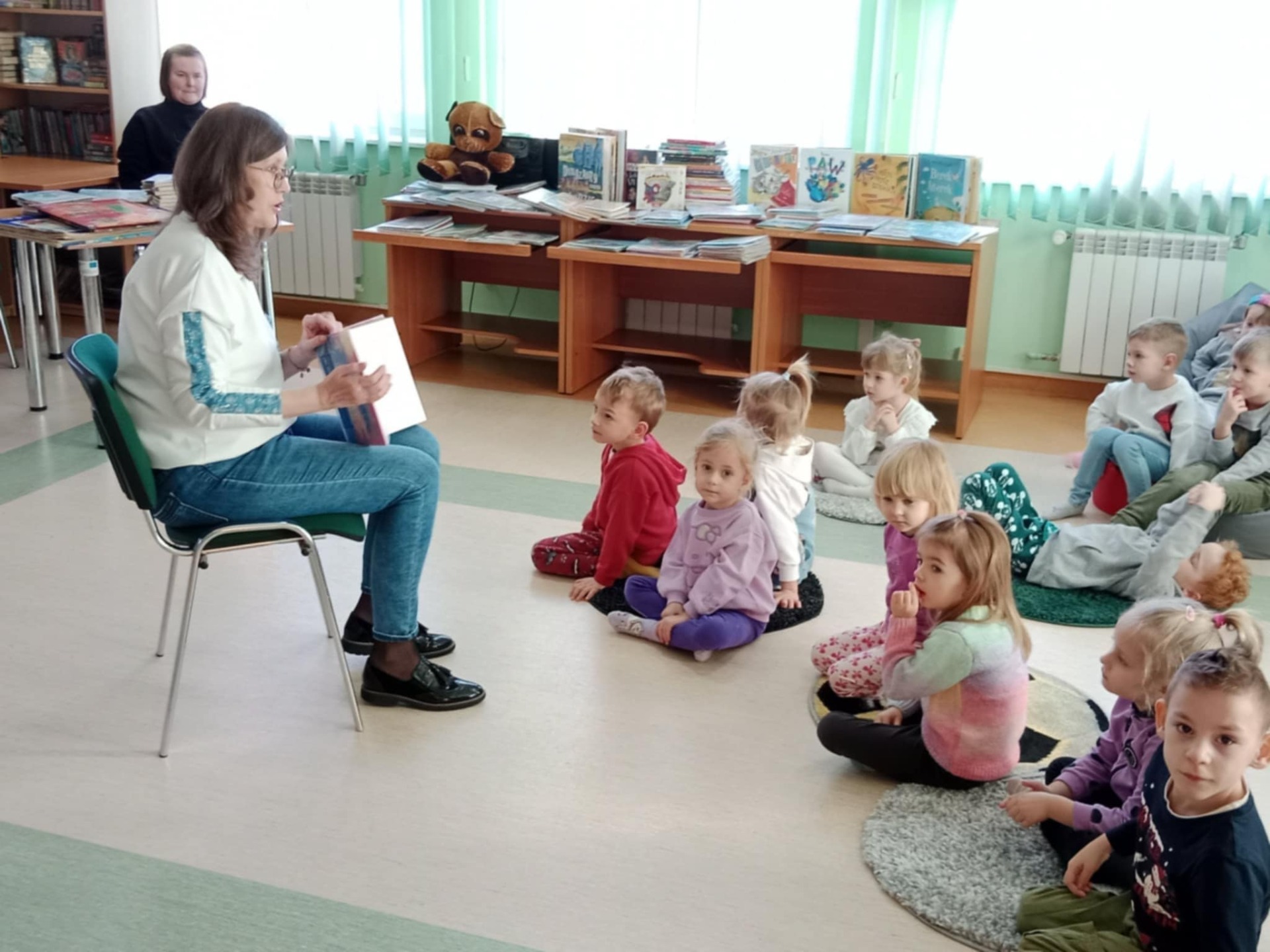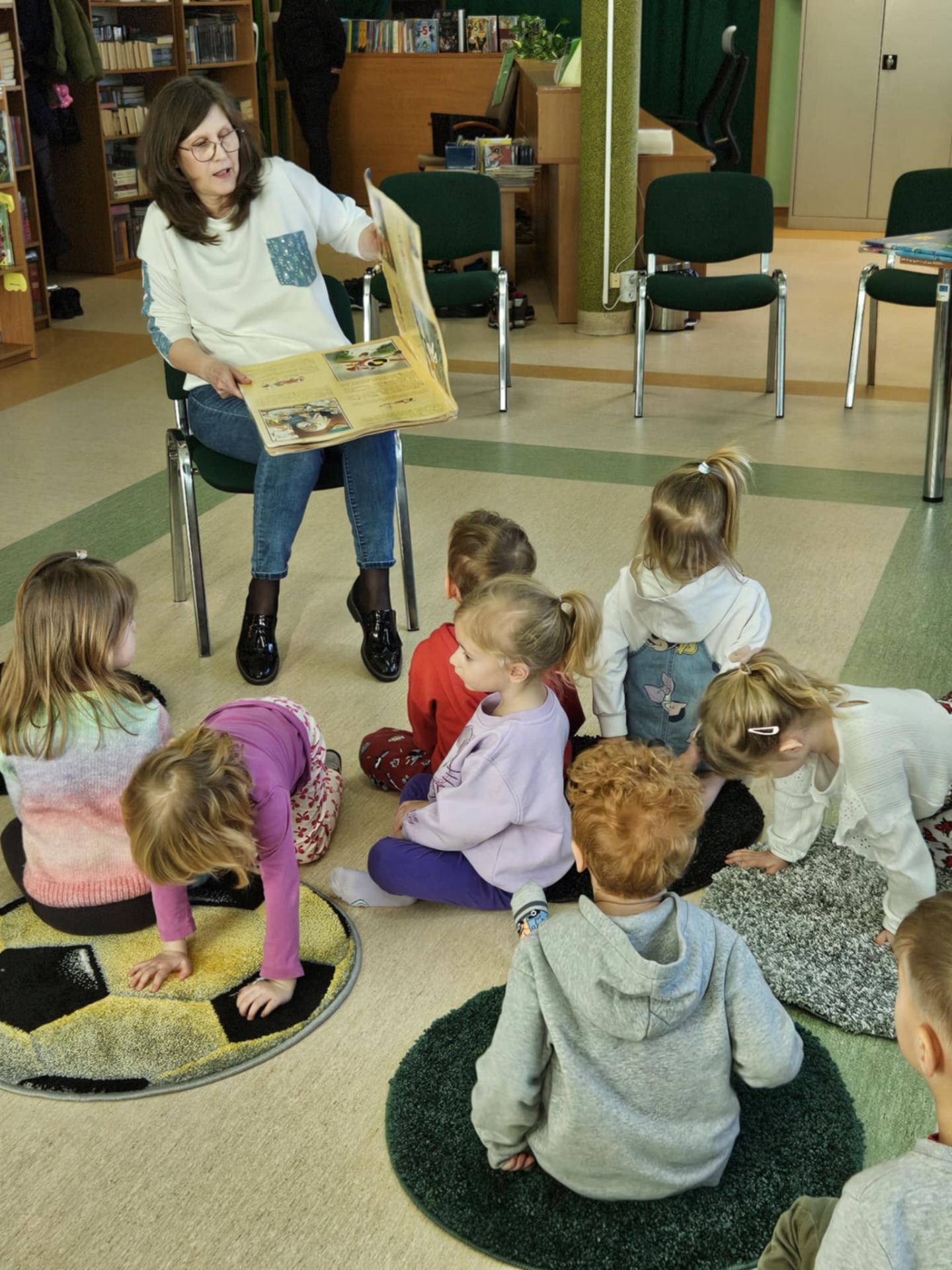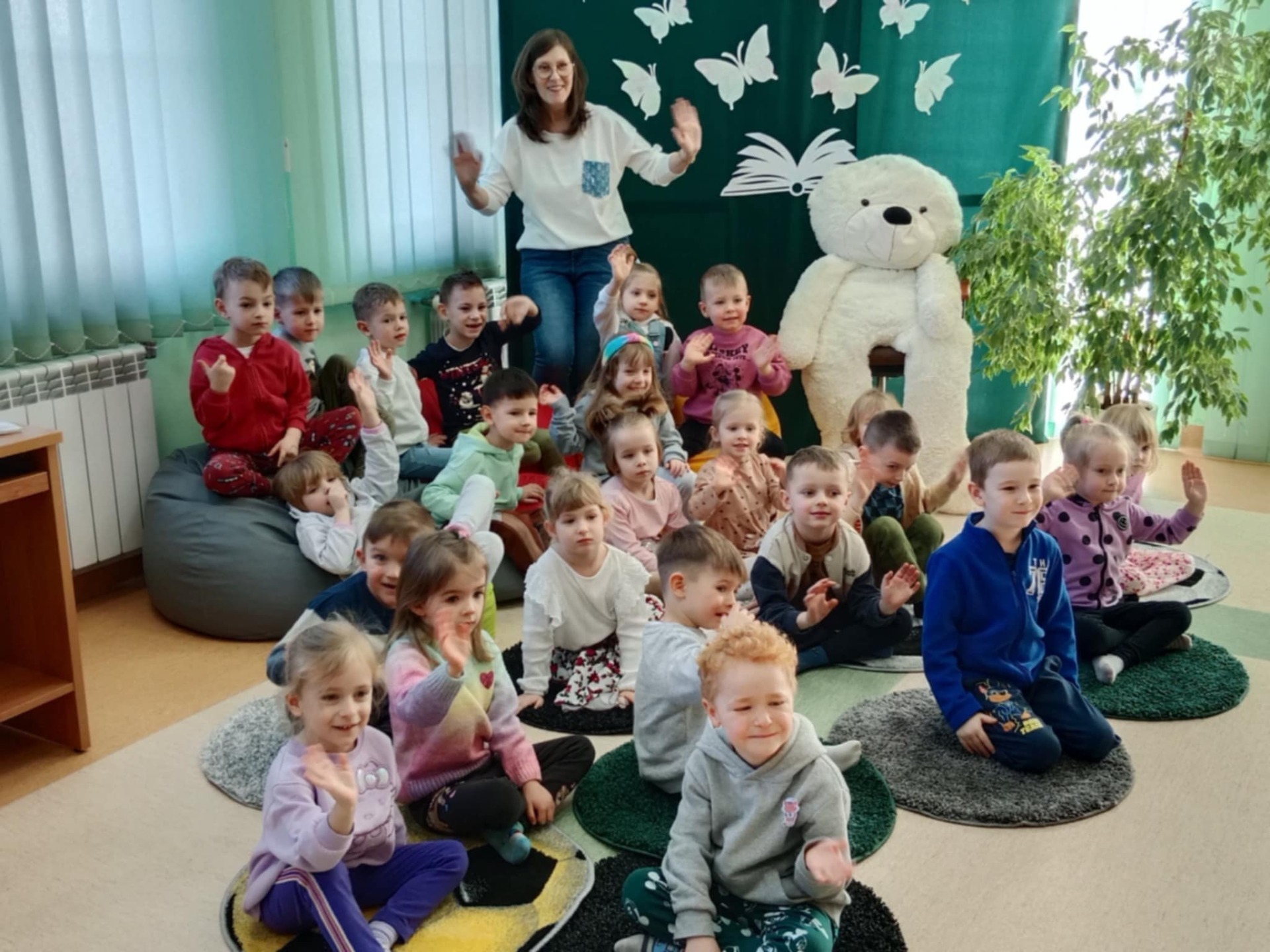 Przedszkolaki z dużym zainteresowaniem wysłuchały też bajki czytanej przez panią dyrektor, a następnie wzięły udział w wesołych zabawach i zagadkach związanych z książkami oraz ich bohaterami. Dzieci z radością przeglądały kolorowe książeczki, poznając świat literatury w przyjaznej atmosferze.