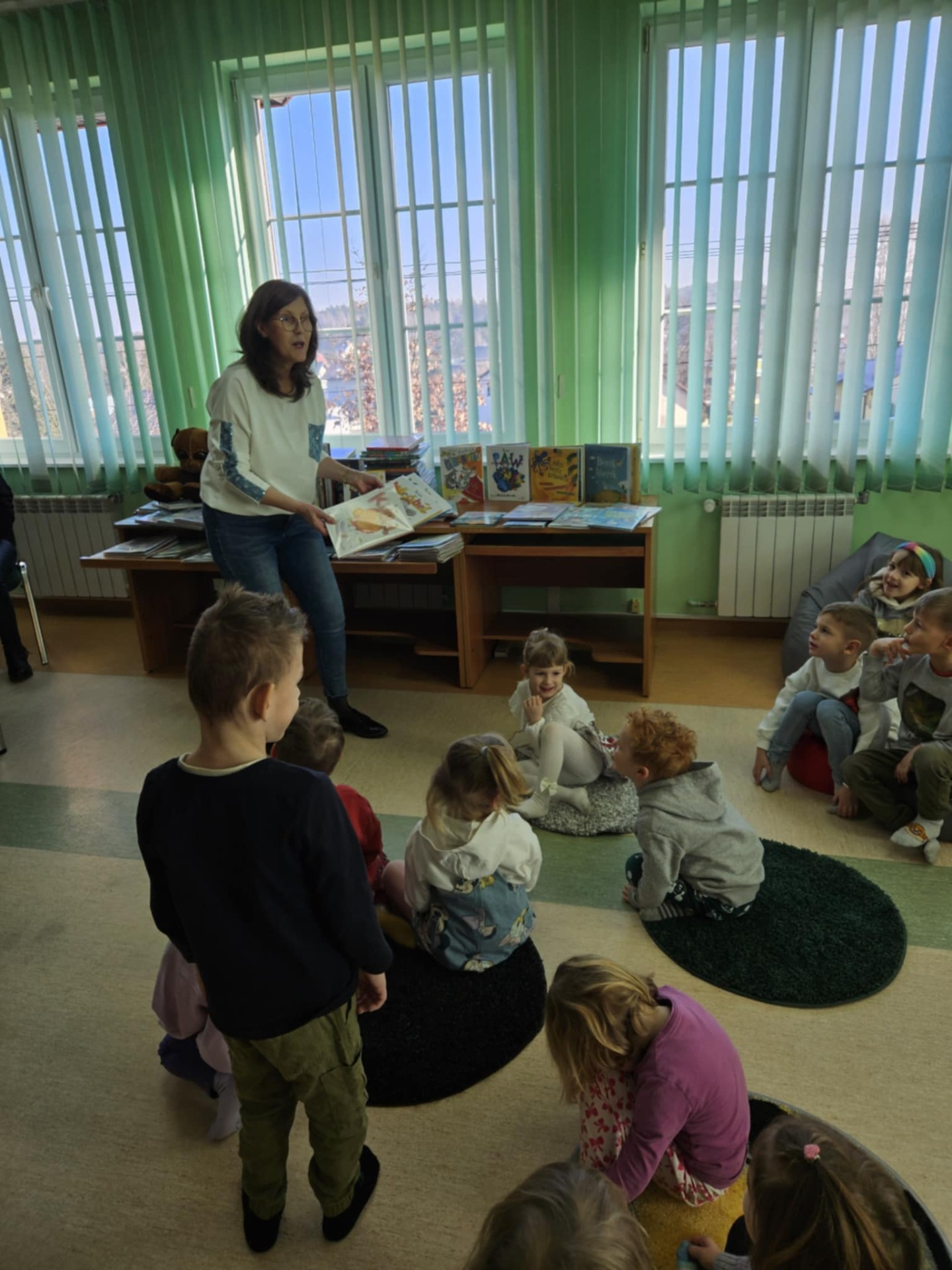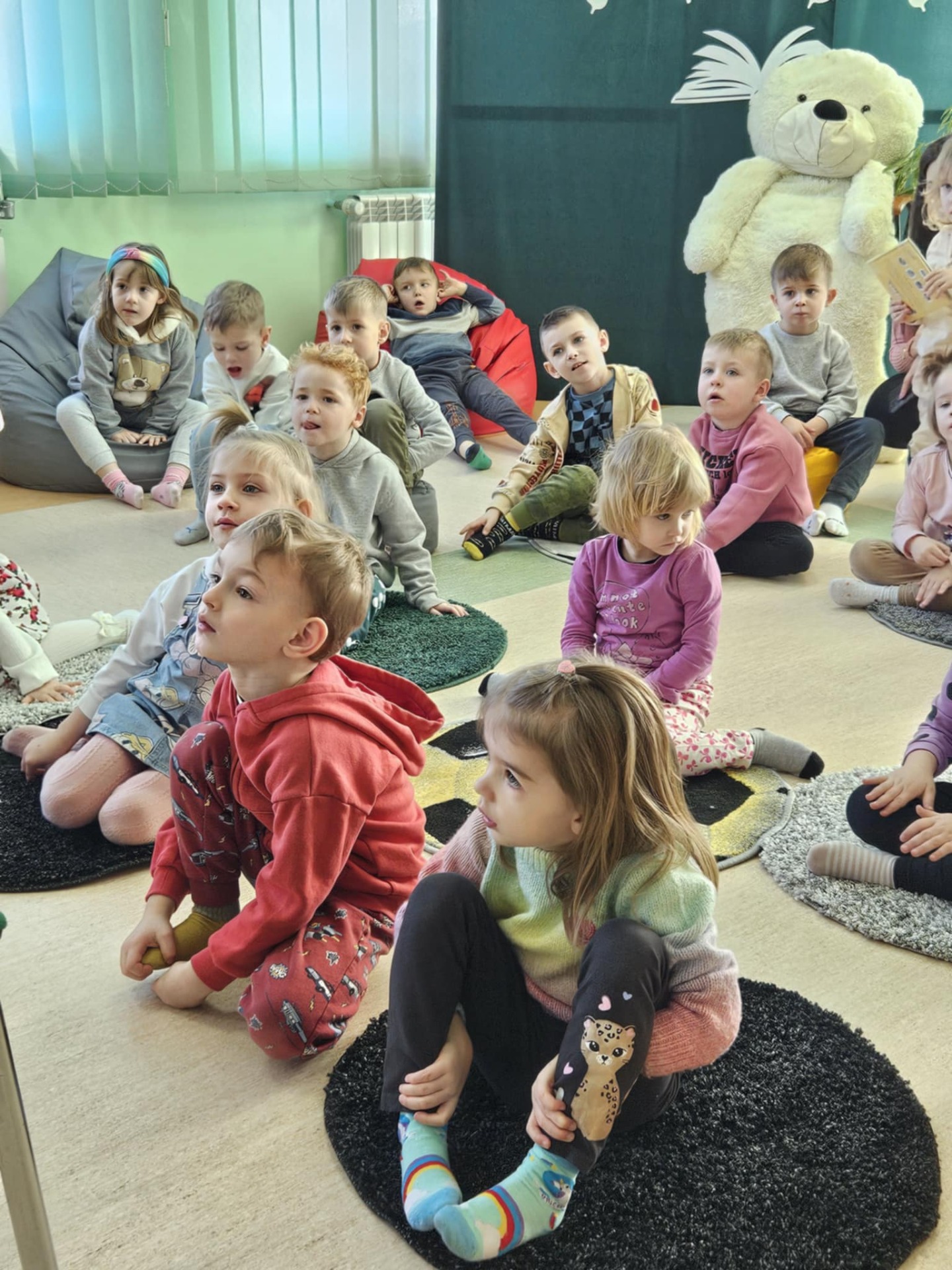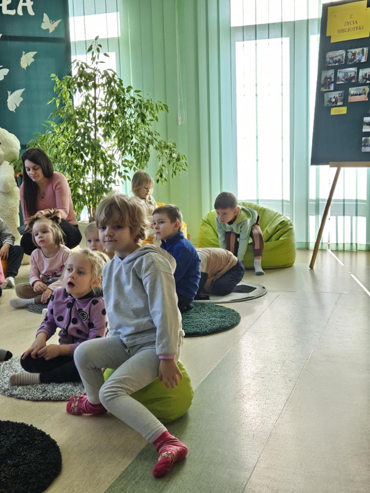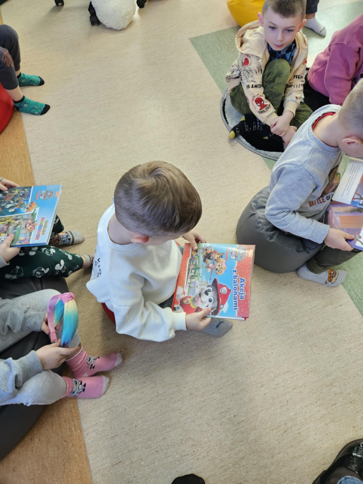 Przedszkolaki z dużym zainteresowaniem wysłuchały też bajki czytanej przez panią dyrektor, a następnie wzięły udział w wesołych zabawach i zagadkach związanych z książkami oraz ich bohaterami. Dzieci z radością przeglądały kolorowe książeczki, poznając świat literatury w przyjaznej atmosferze.