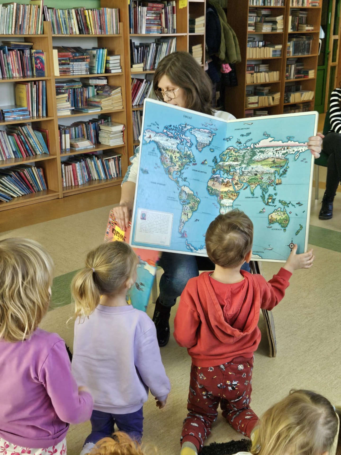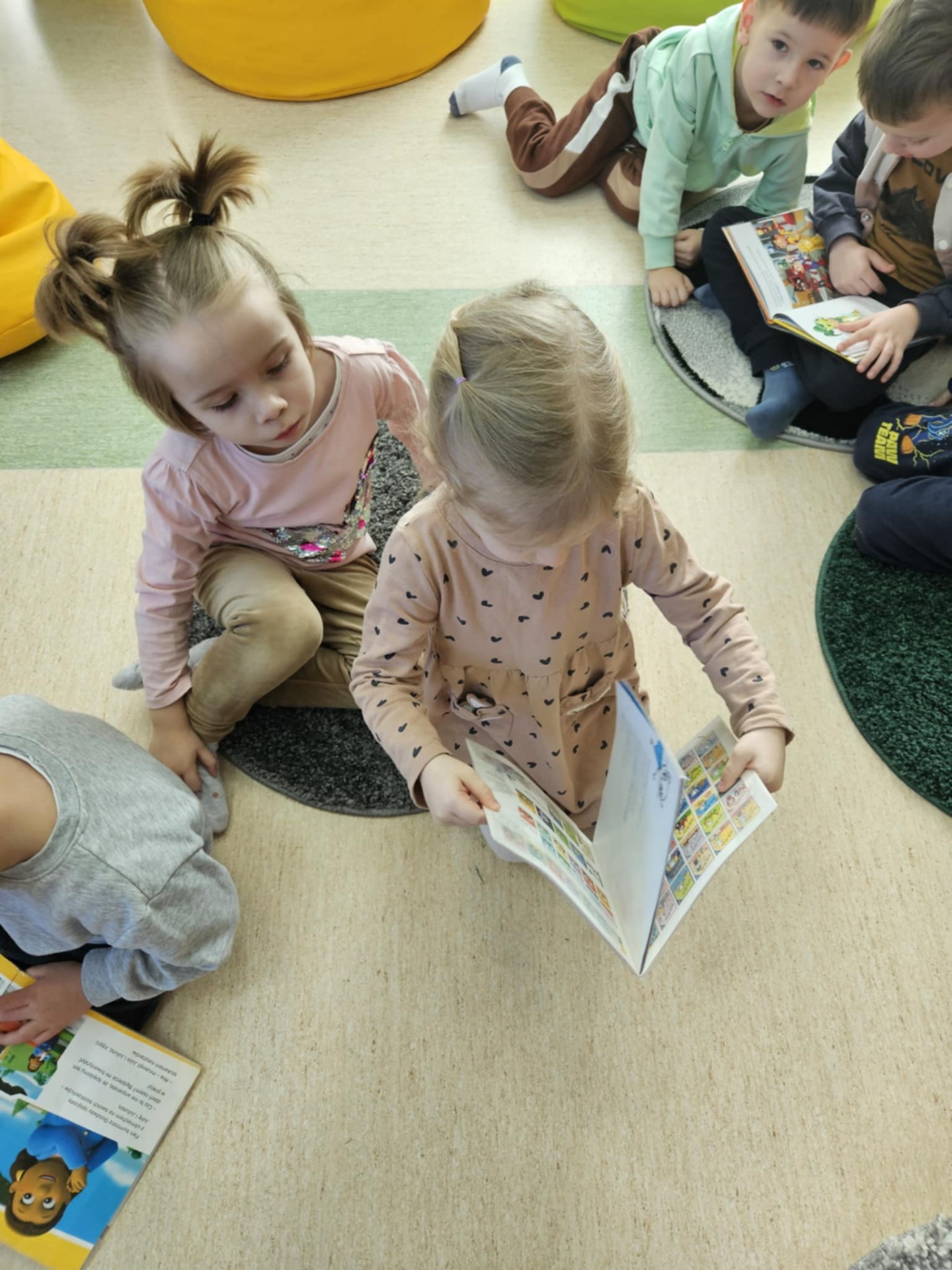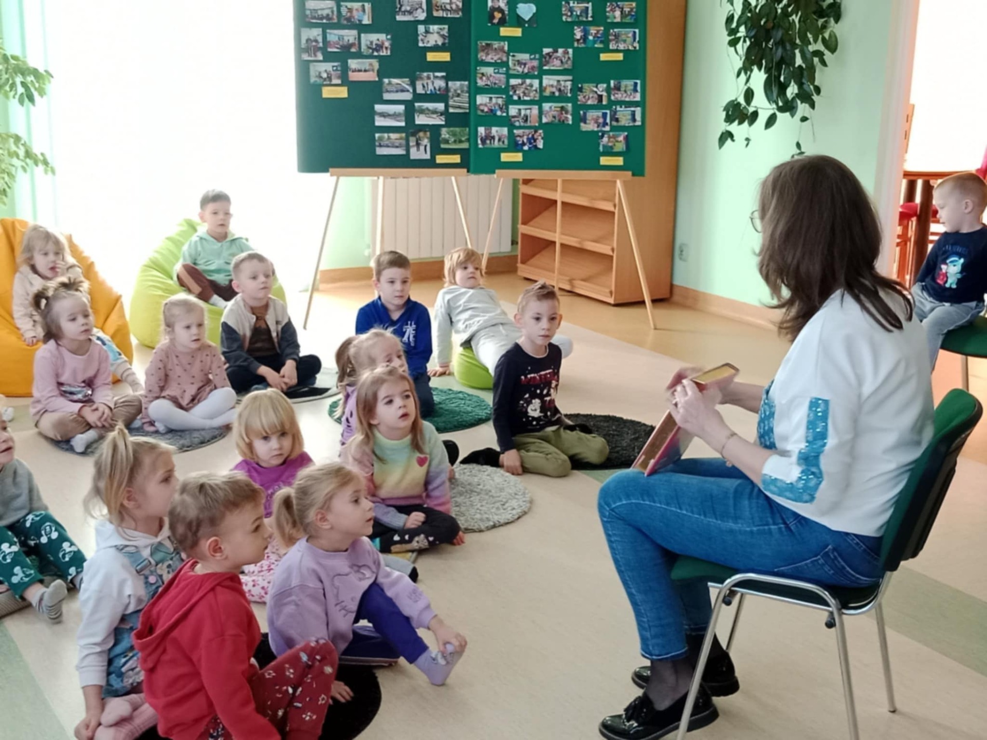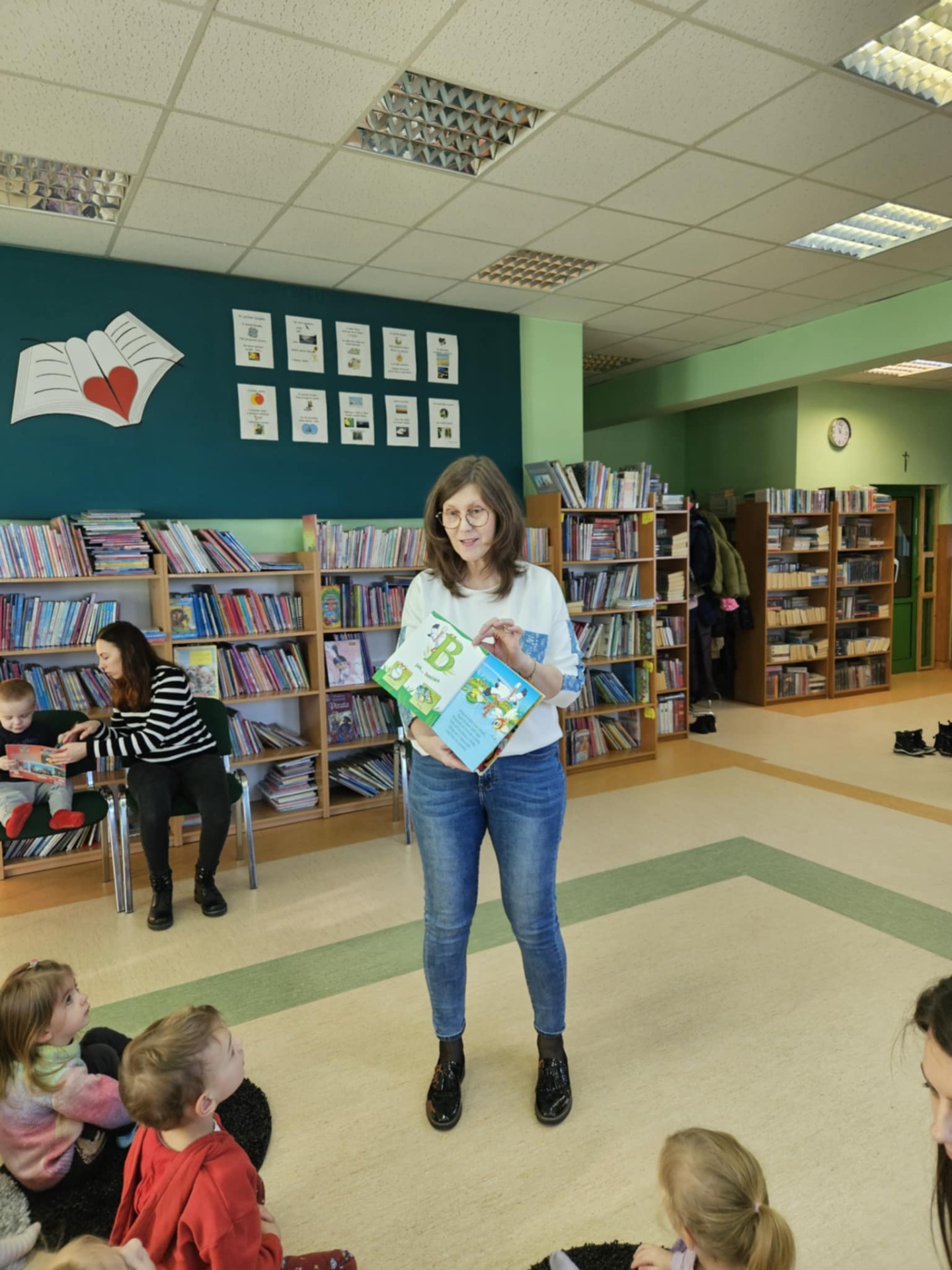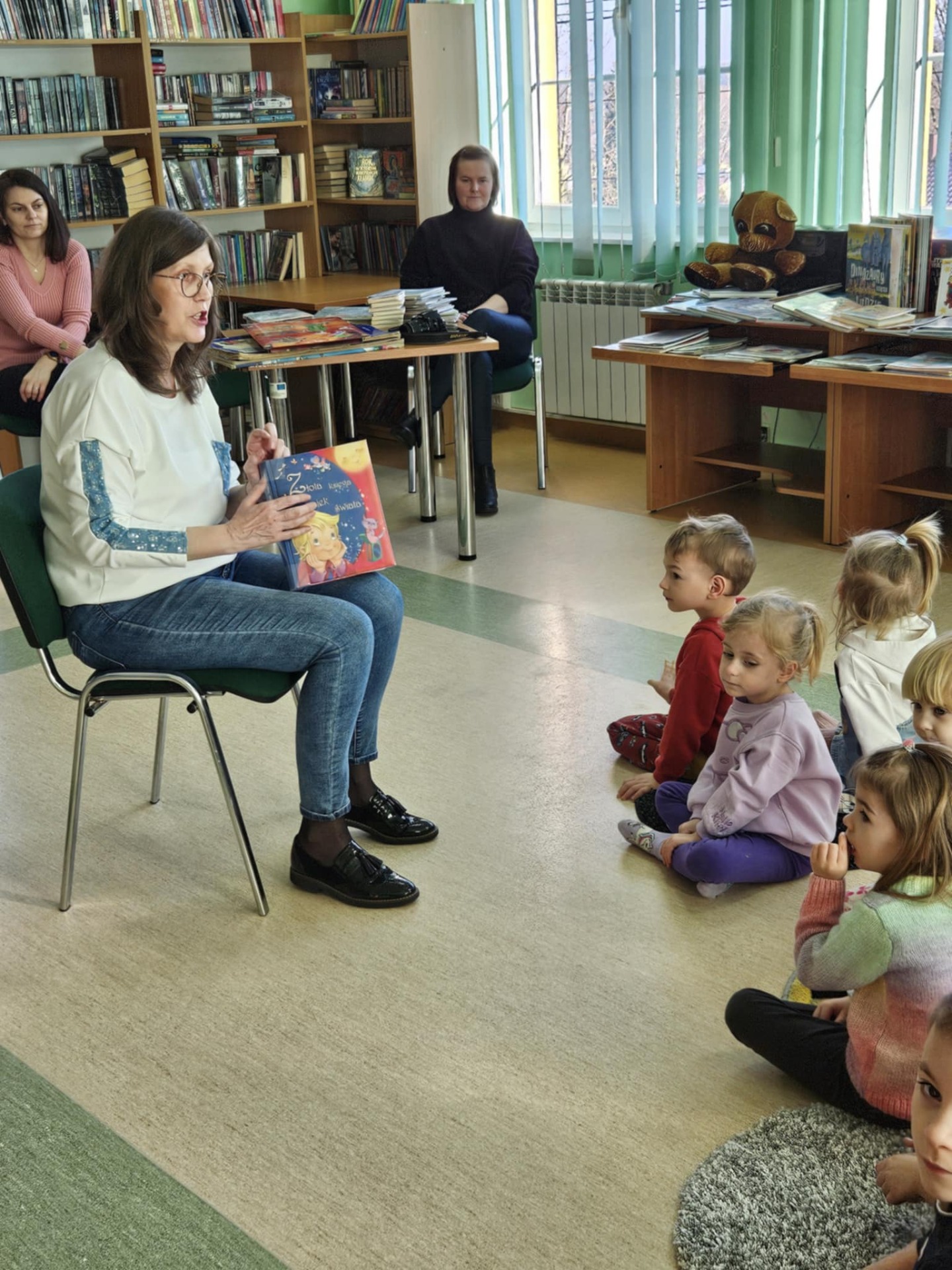 Przedszkolaki z dużym zainteresowaniem wysłuchały też bajki czytanej przez panią dyrektor, a następnie wzięły udział w wesołych zabawach i zagadkach związanych z książkami oraz ich bohaterami. Dzieci z radością przeglądały kolorowe książeczki, poznając świat literatury w przyjaznej atmosferze.