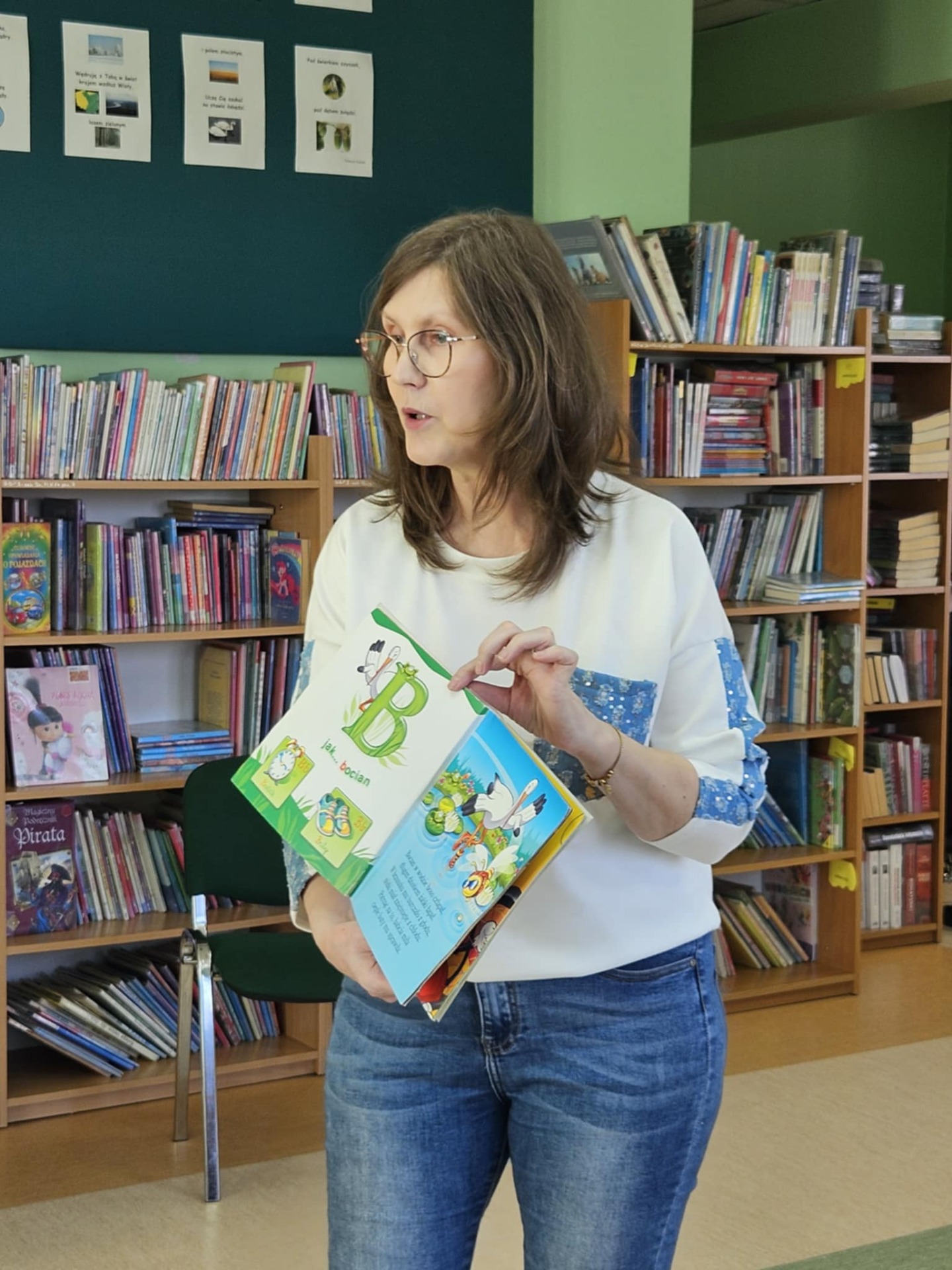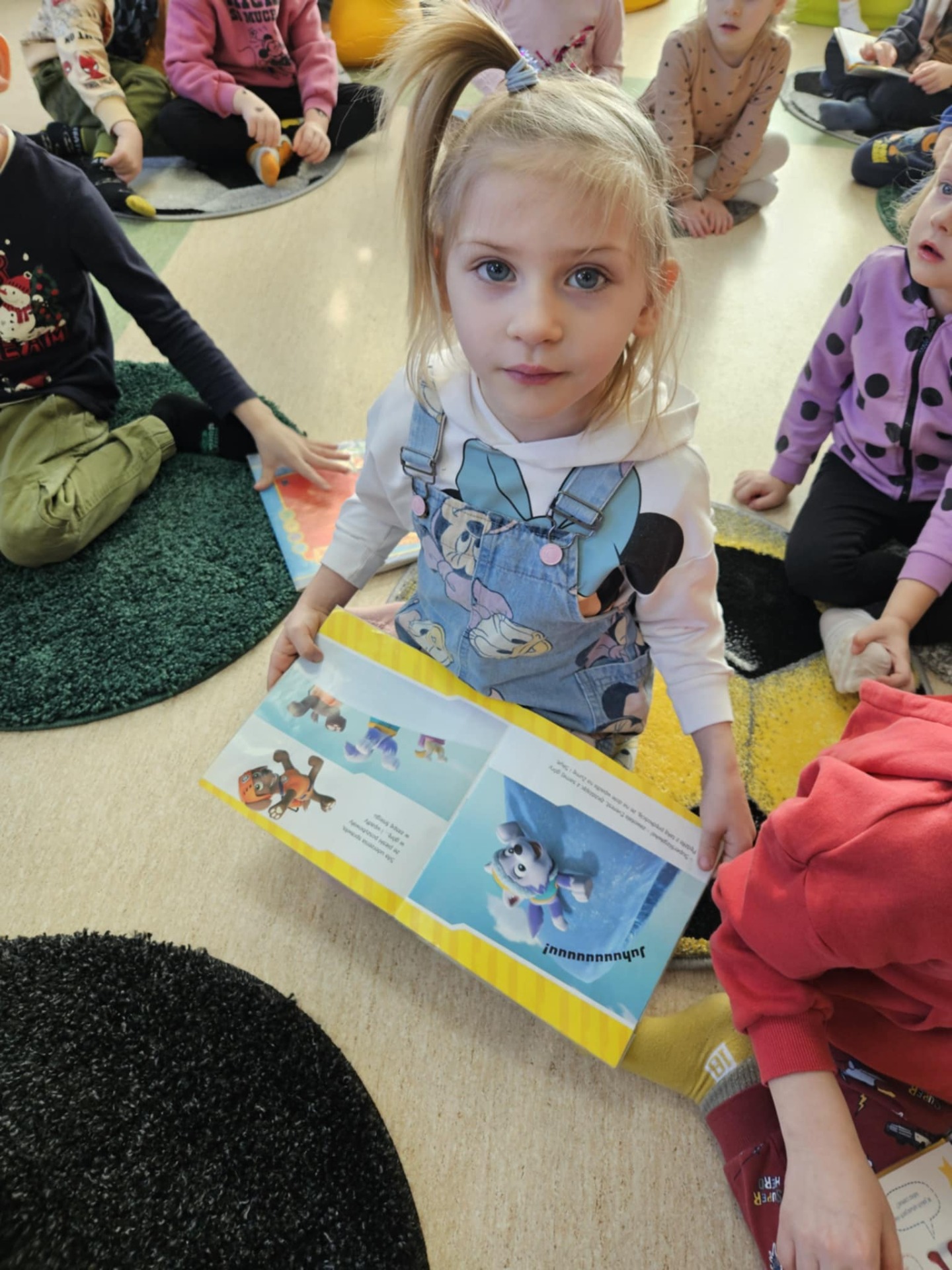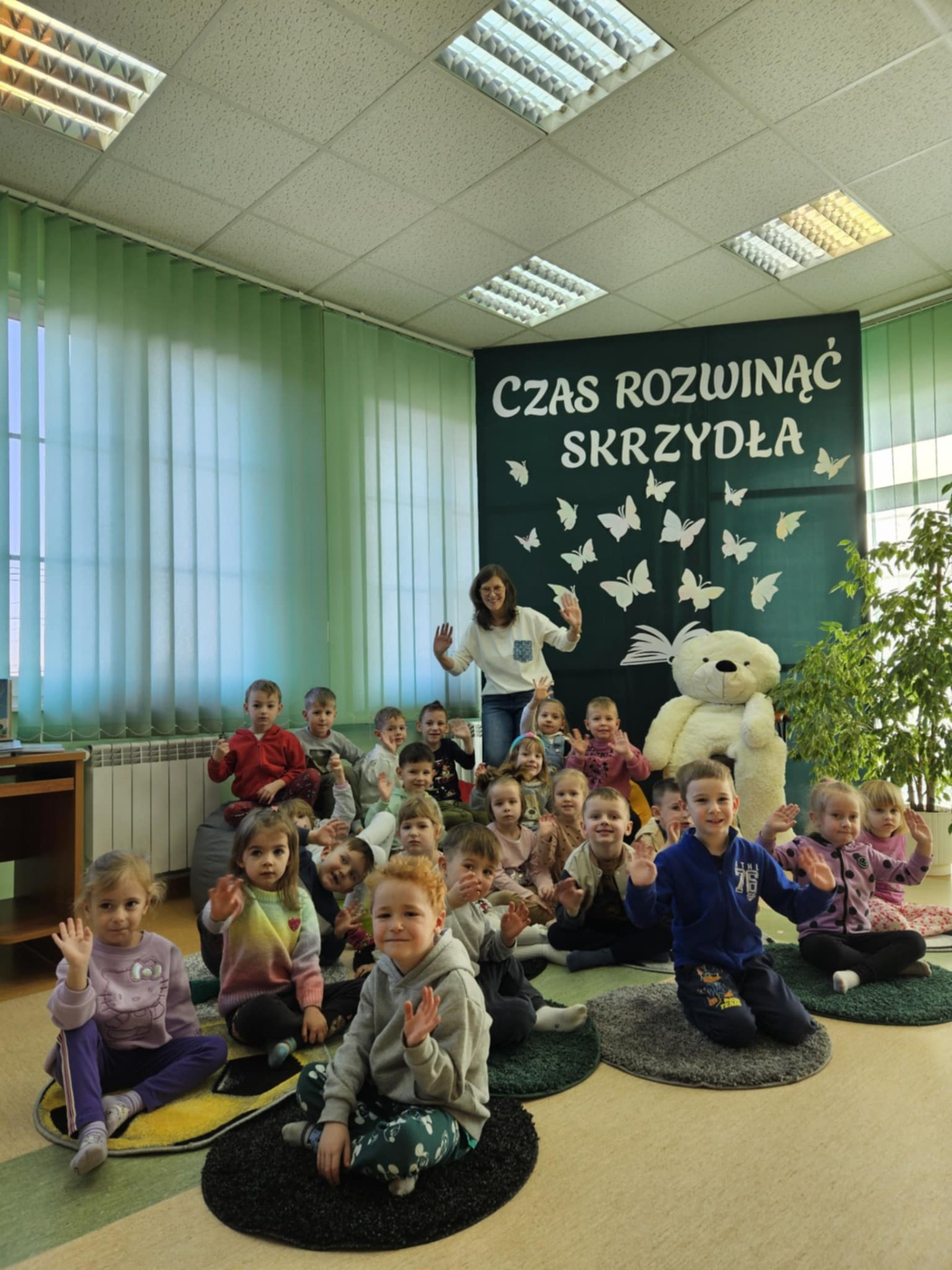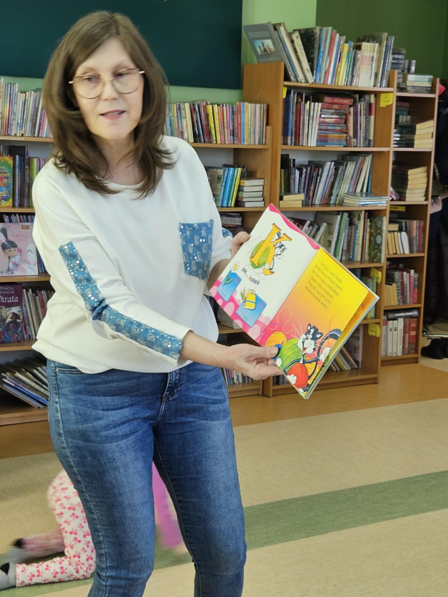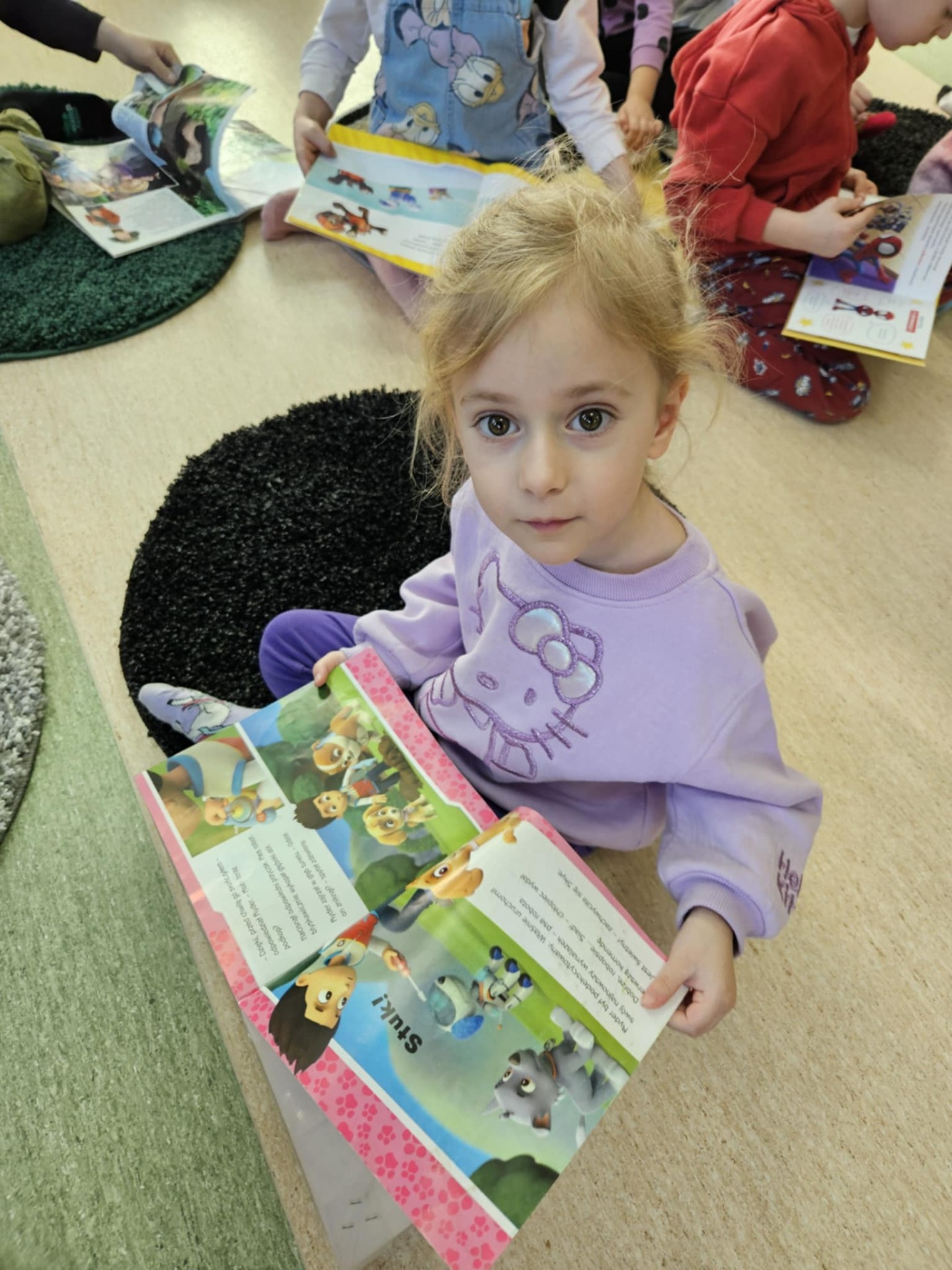 Przedszkolaki z dużym zainteresowaniem wysłuchały też bajki czytanej przez panią dyrektor, a następnie wzięły udział w wesołych zabawach i zagadkach związanych z książkami oraz ich bohaterami. Dzieci z radością przeglądały kolorowe książeczki, poznając świat literatury w przyjaznej atmosferze.