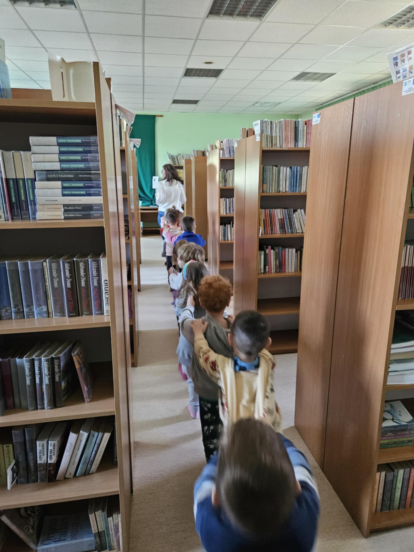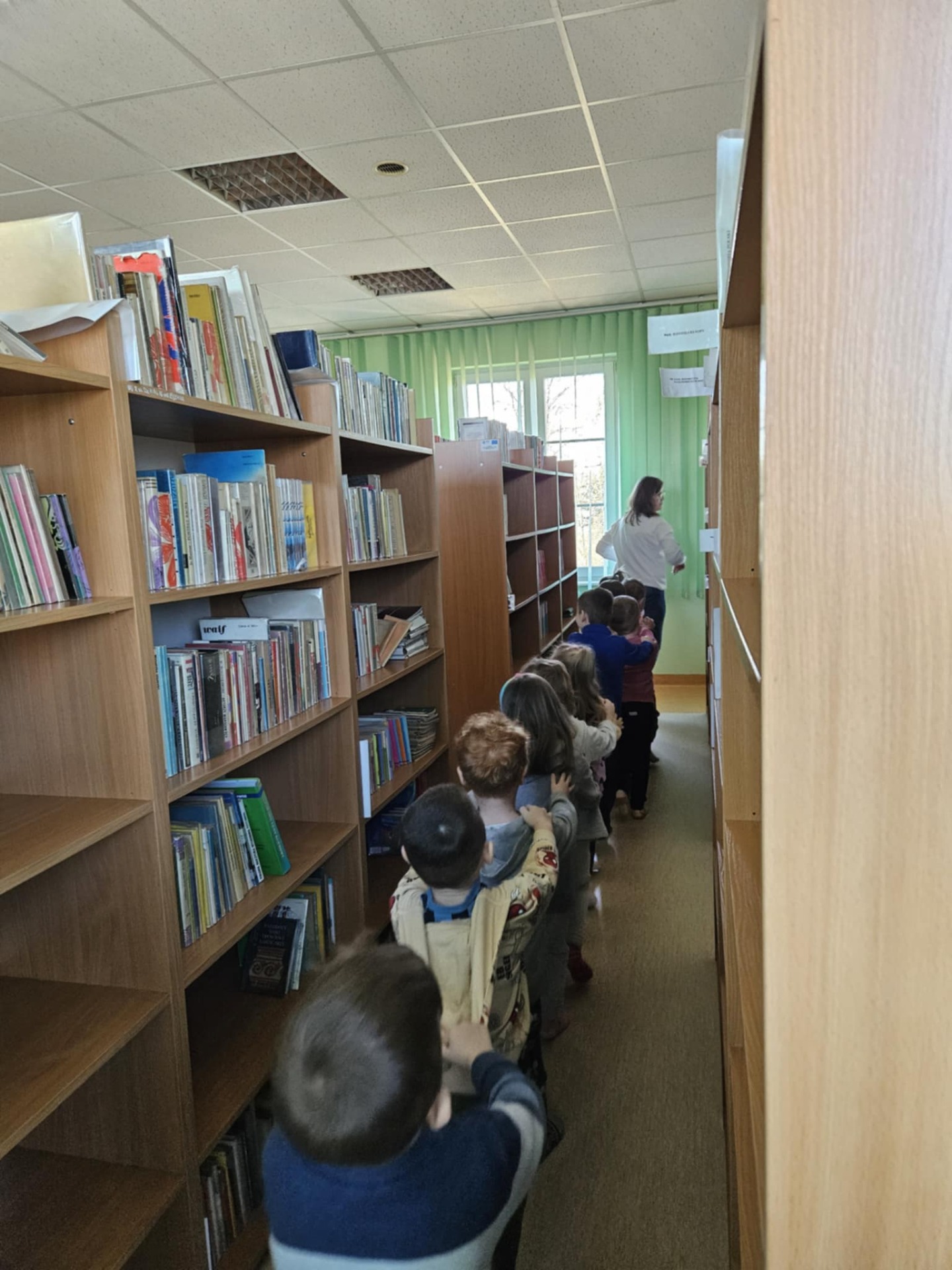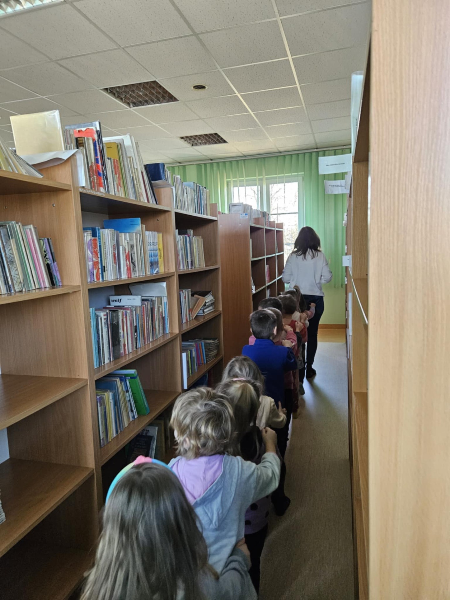 Na zakończenie wizyty przedszkolaki „wyruszyły pociągiem”, aby zwiedzić biblioteczne półki wypełnione książkami.