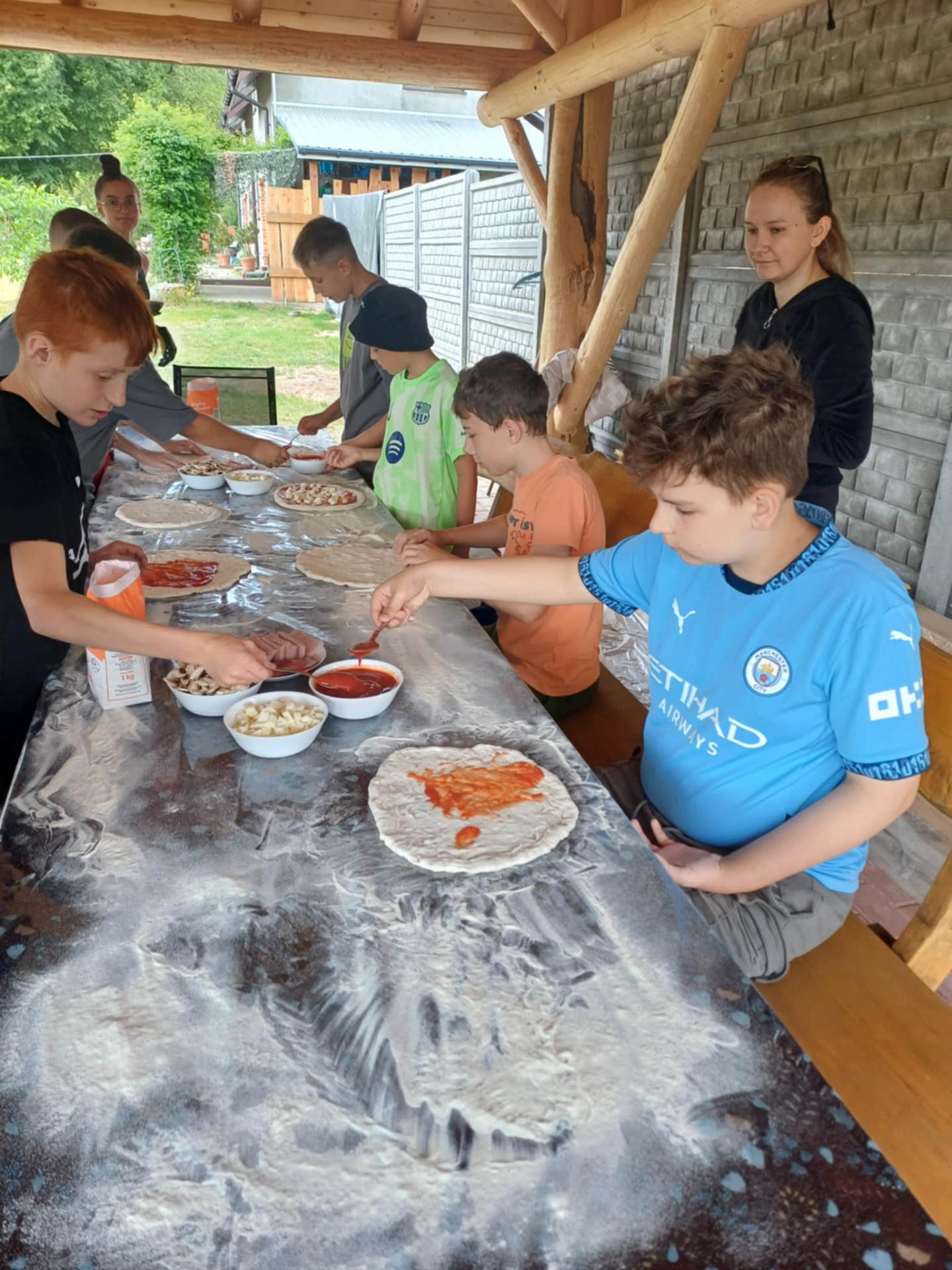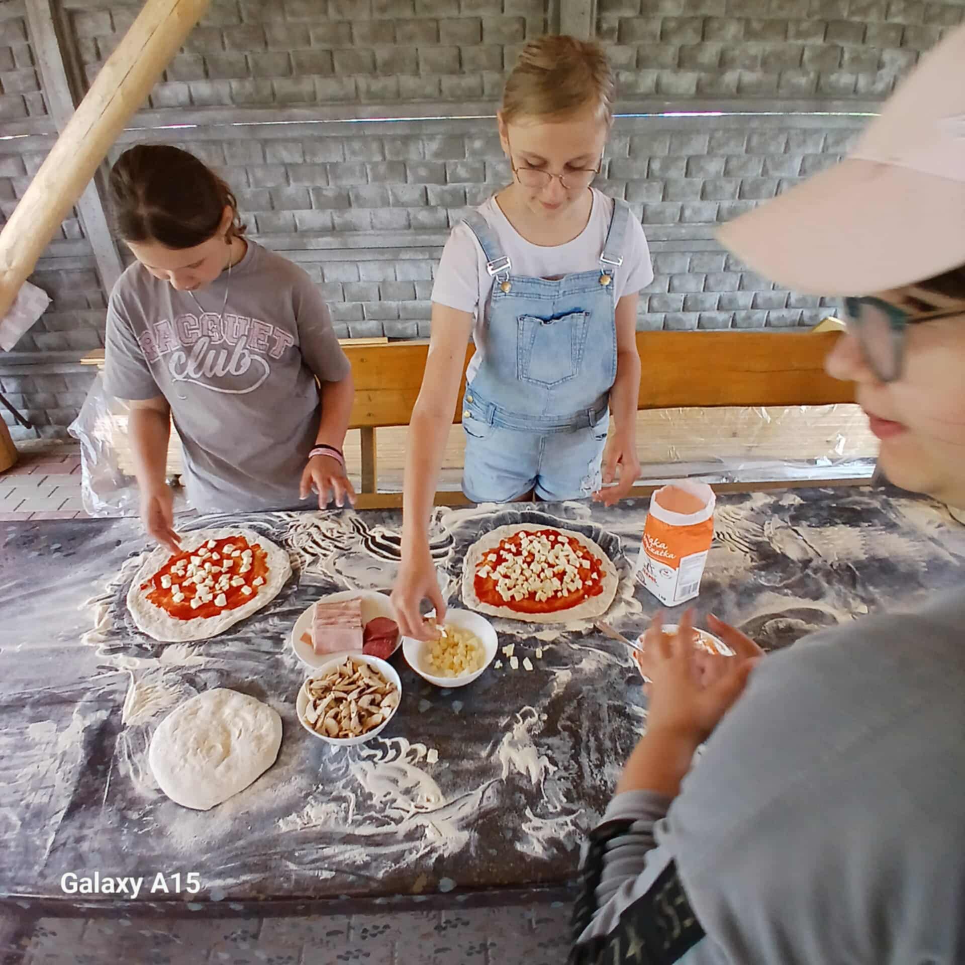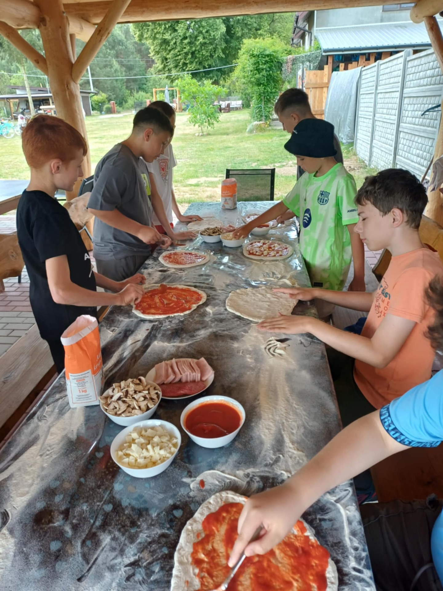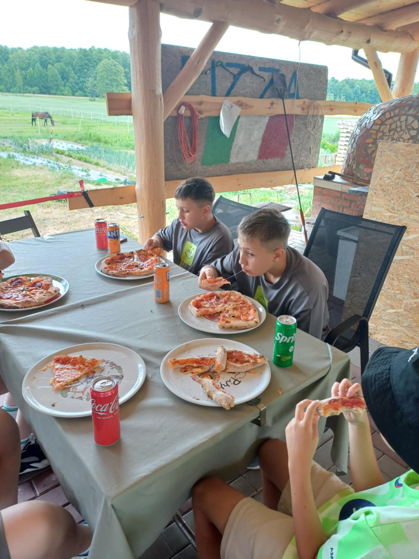 We wtorek, 24 czerwca 2025 r., uczniowie klasy 5b wraz z opiekunami wyruszyli na wycieczkę rowerową do pizzerii Napoli Nord w Józefinie. Po dotarciu na miejsce i krótkim odpoczynku rozpoczęły się warsztaty robienia i wypiekania pizzy. Każdy z uczestników otrzymał ciasto i po krótkiej instrukcji robił swoją pizzę, dodając wybrane przez siebie dodatki. Następnie z pomocą pana Toniego wkładał pizzę do pieca. Po upieczeniu mogliśmy delektować się smakiem prawdziwej włoskiej pizzy. Najedzeni i wypoczęci wyruszyliśmy w drogę powrotną do szkoły, która wiodła przez następujące miejscowości: Józefin – Władysławów- Gutkowice Nowiny- Górniak – Kopiec – Czechowice- Żelechlinek. Na zakończenie wycieczki zjedliśmy pyszne włoskie lody. Wycieczka była okazją do integracji zespołu klasowego, poznania terenu naszej gminy i tak ważnej dla zdrowia aktywności fizycznej, a warsztaty wypieku pizzy przybliżyły uczniom pracę pizzermana. Wszyscy zgodnie stwierdzili, że była to nasza pierwsza, ale nie ostatnia wycieczka rowerowa.