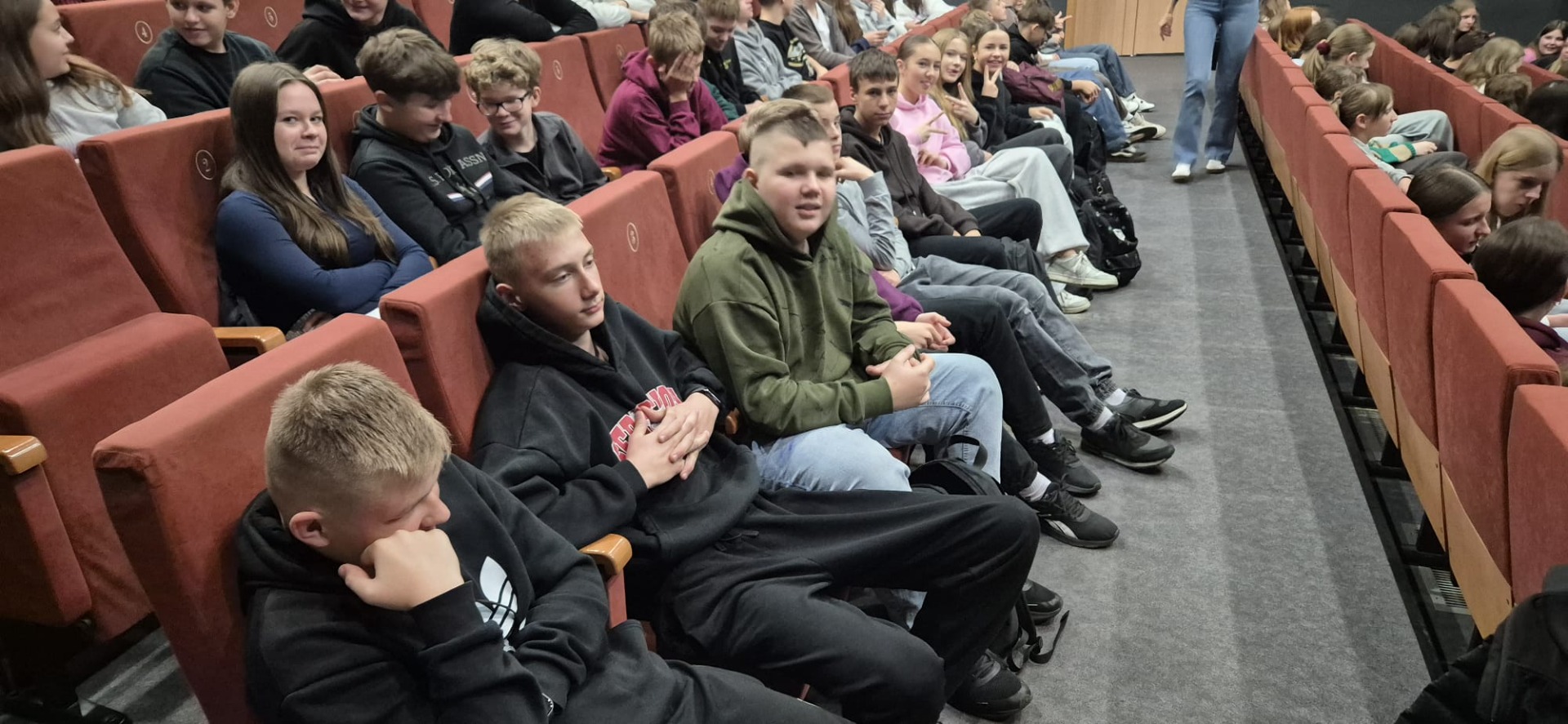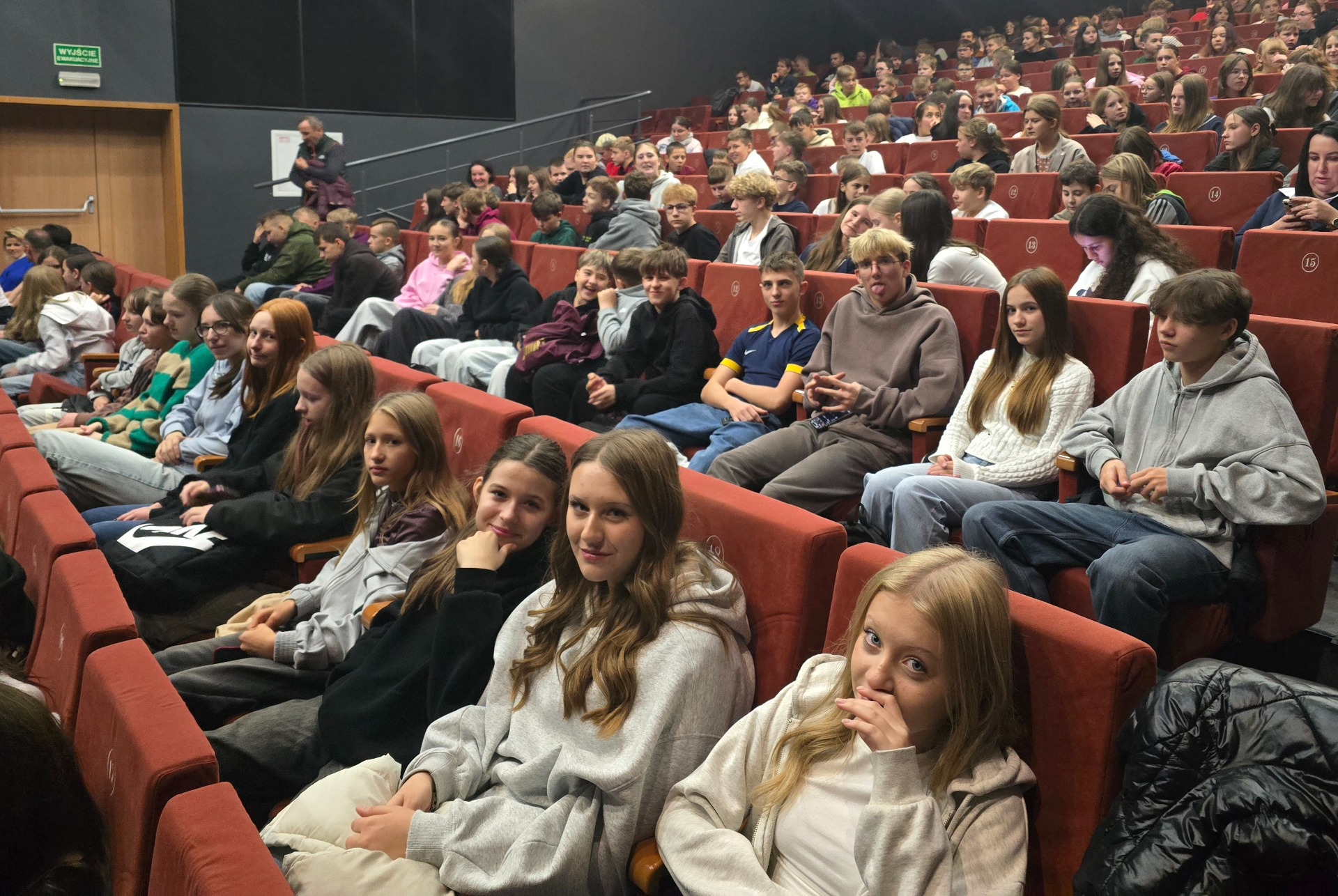 W dniu 17 października 2025 r. uczniowie klasy 8a i 8b pod opieką wychowawców: p. P. Kostrzewy i p. L. Jarosińskiego udali się do Miejskiego Domu Kultury w Rawie Mazowieckiej, aby obejrzeć spektakl teatralny pt. „Zemsta” w wykonaniu artystów Teatru Nowoczesnego z Krakowa.