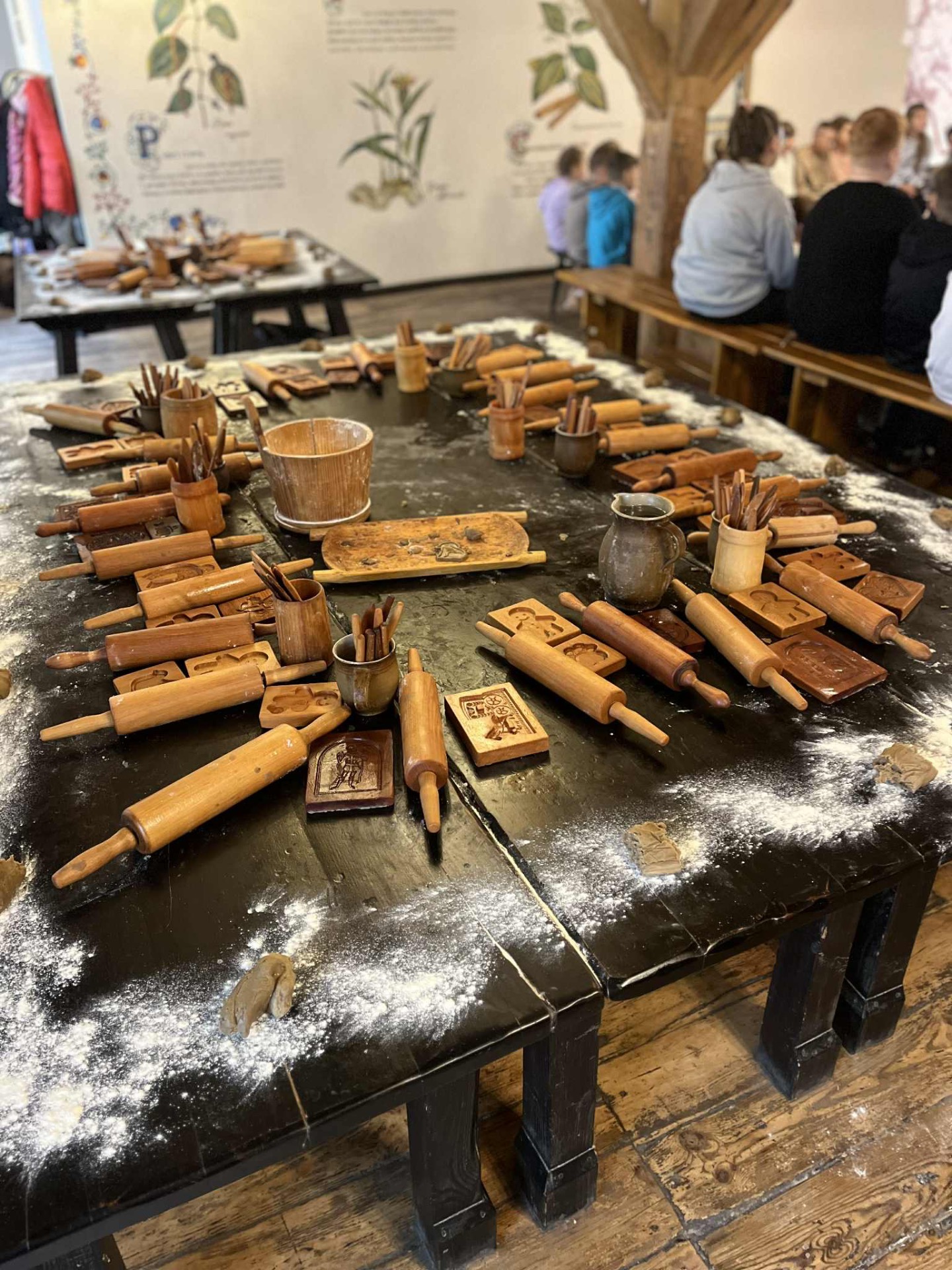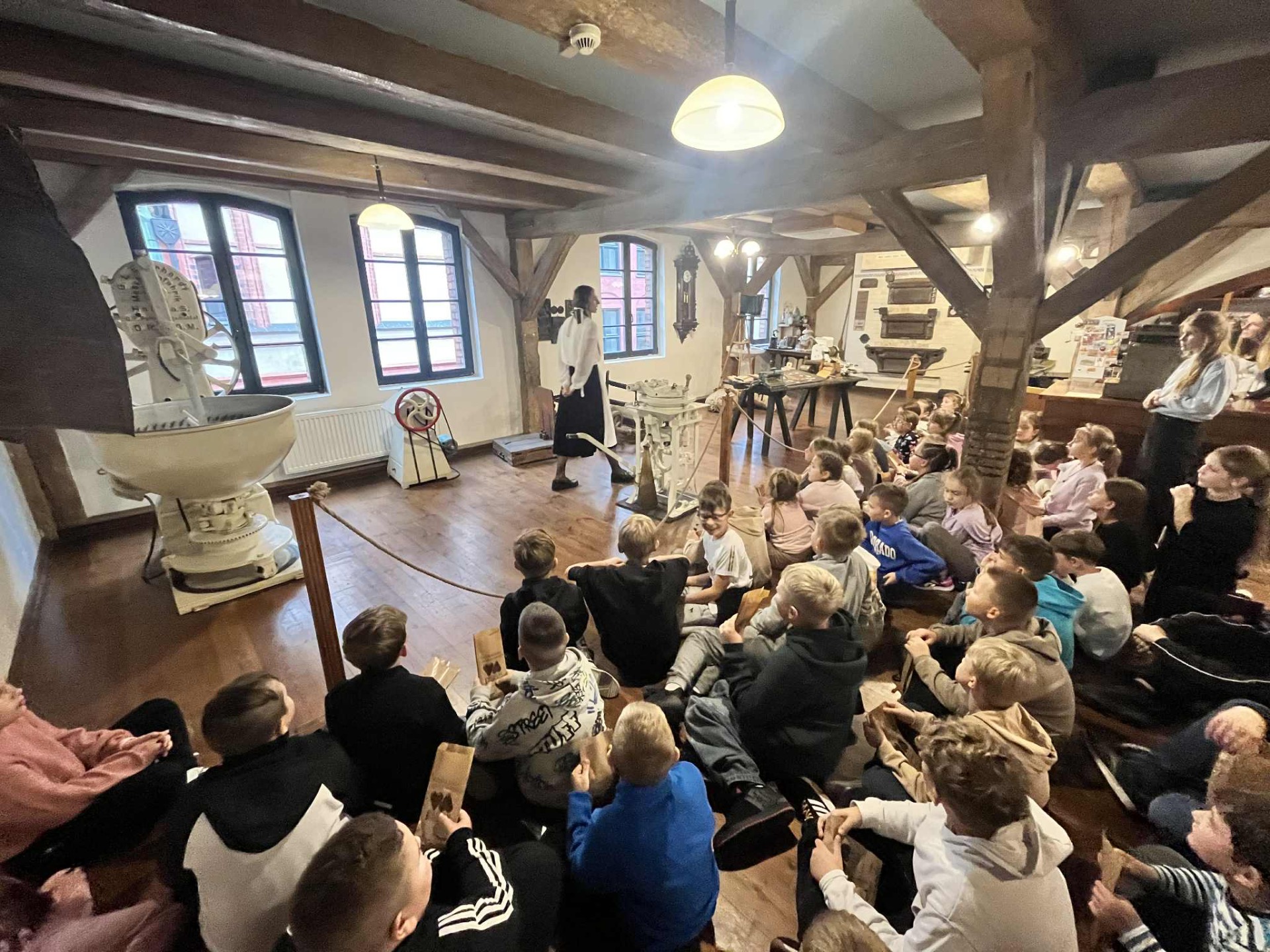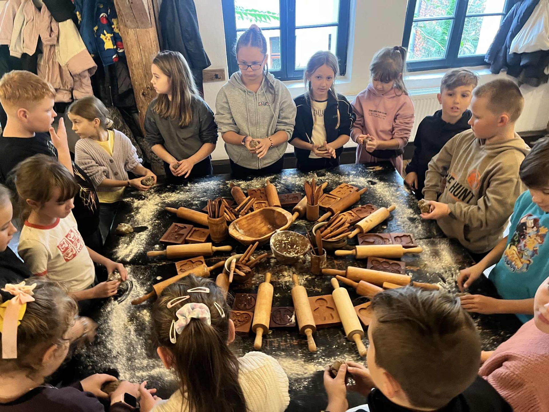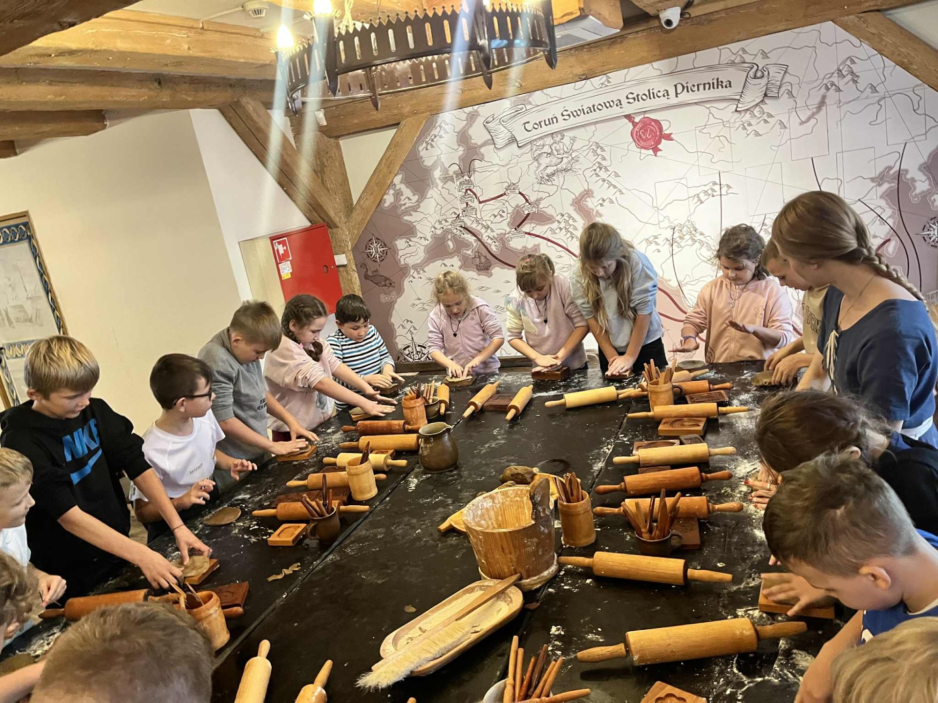 Kolejnym etapem była wizyta w Żywym Muzeum Piernika, gdzie uczniowie wzięli udział w warsztatach piernikarskich. W odtworzonej XVI-wiecznej piernikarni poznali starą recepturę i narzędzia sprzed 500 lat. Pod okiem mistrzów, mówiących gwarą toruńską, samodzielnie przesiewali mąkę, ucierali przyprawy, wyrabiali ciasto i formowali własne pierniki, które po wypieczeniu zabrali ze sobą.