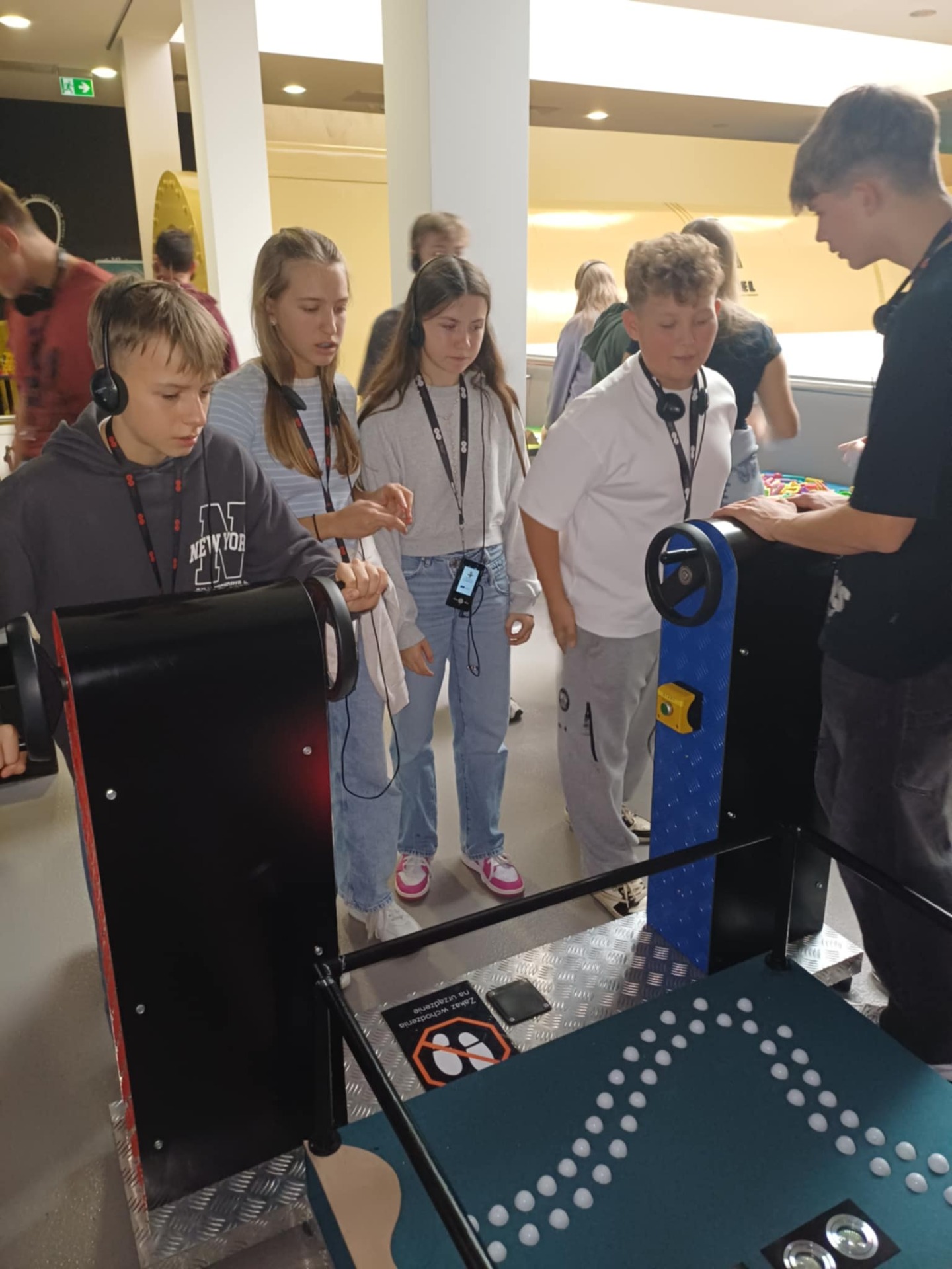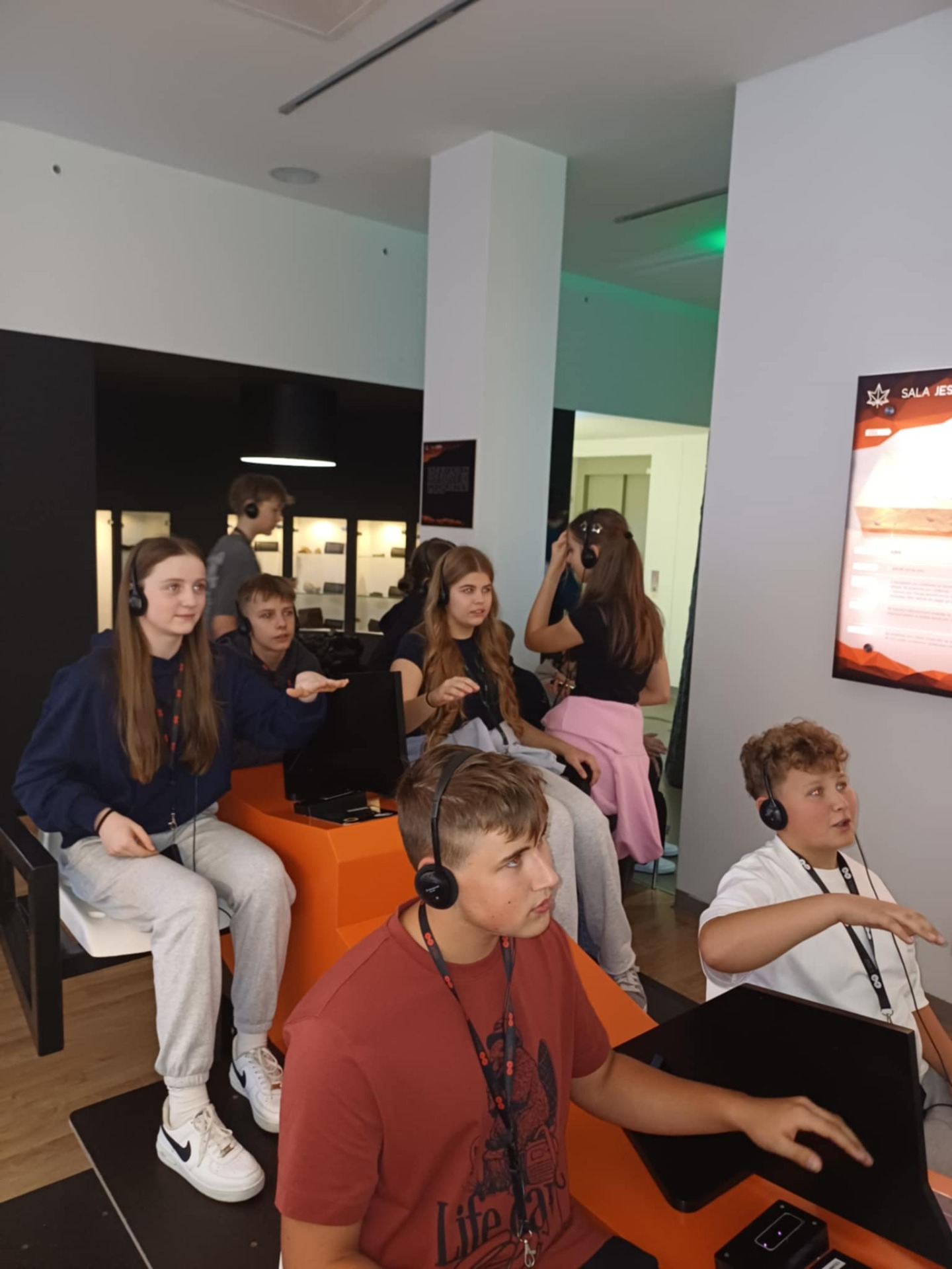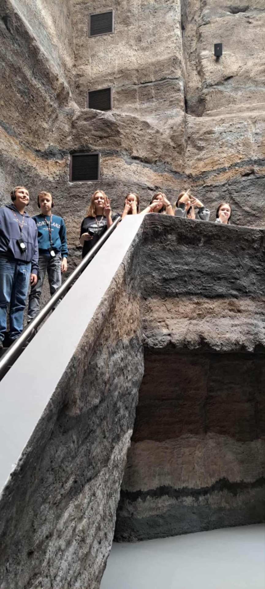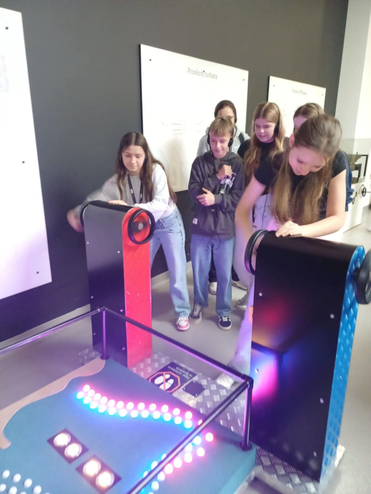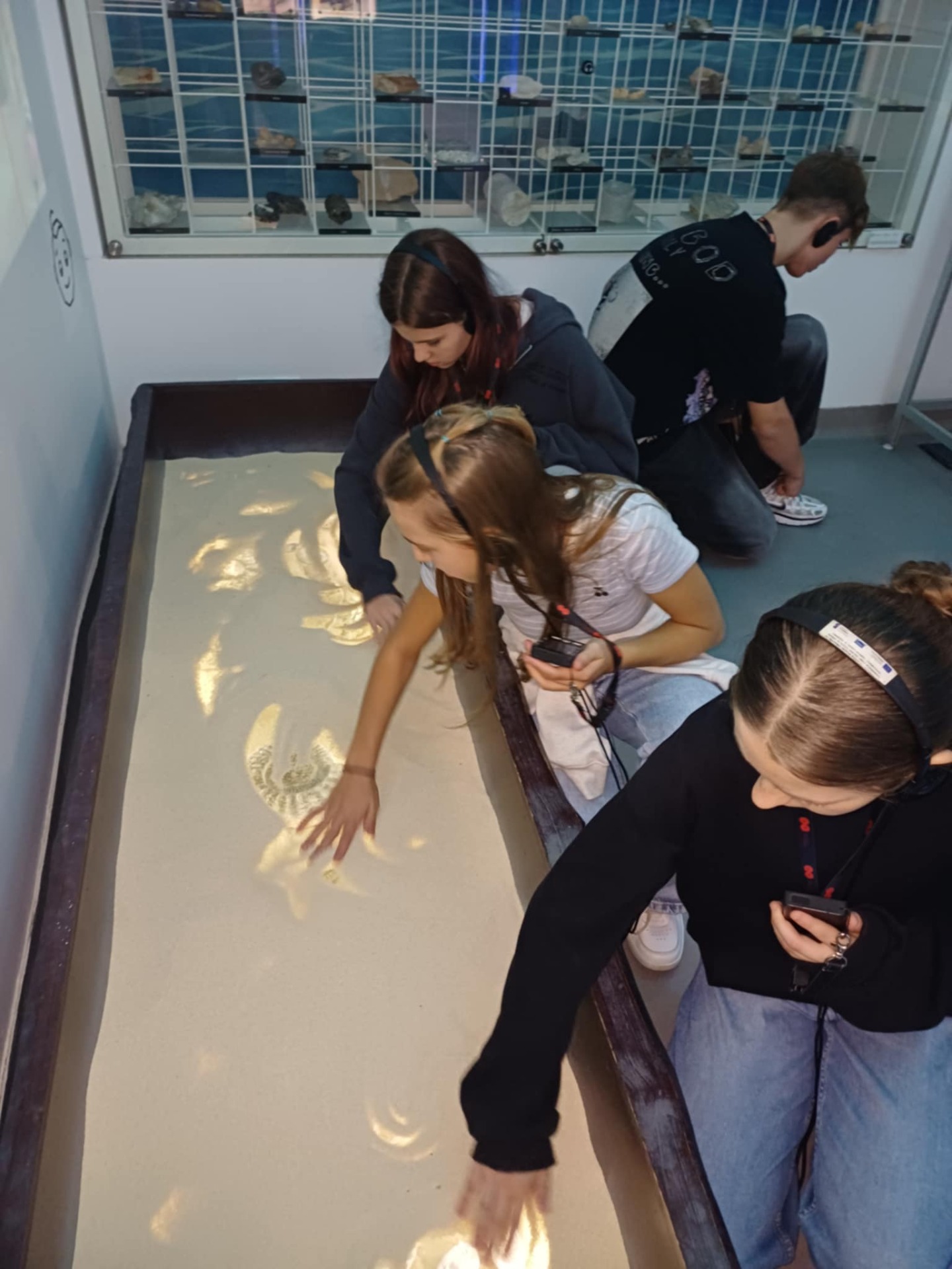 Na początku zwiedziliśmy pierwsze w Polsce muzeum węgla i energii „Giganty Mocy”, w którym poznaliśmy historie powstawania i wydobywania węgla brunatnego oraz produkcji z niego energii elektrycznej. Wystawa łączy naukę z zabawą poprzez interaktywne stoiska, multimedialne ekrany oraz wiele różnych gier. Wyposażeni w audio przewodniki ruszyliśmy na zwiedzanie i odbyliśmy swoistą podróż w czasie. Podczas zwiedzania wystawy uczniowie przeprowadzali doświadczenia z zakresu fizyki i zjawisk elektryczności. Spacerowali po dnie morza i odwiedzili las tropikalny, dowiedzieli się przy tym o poszczególnych fazach formowania się złóż węgla brunatnego. Eksperymentowali w generatorze odpowiedzialnym za wytwarzanie prądu, sterowali procesem wytwarzania energii oraz podziwiali szczątki mamuta, żyjącego niegdyś na obszarze dzisiejszej odkrywki węgla brunatnego w Bełchatowie.