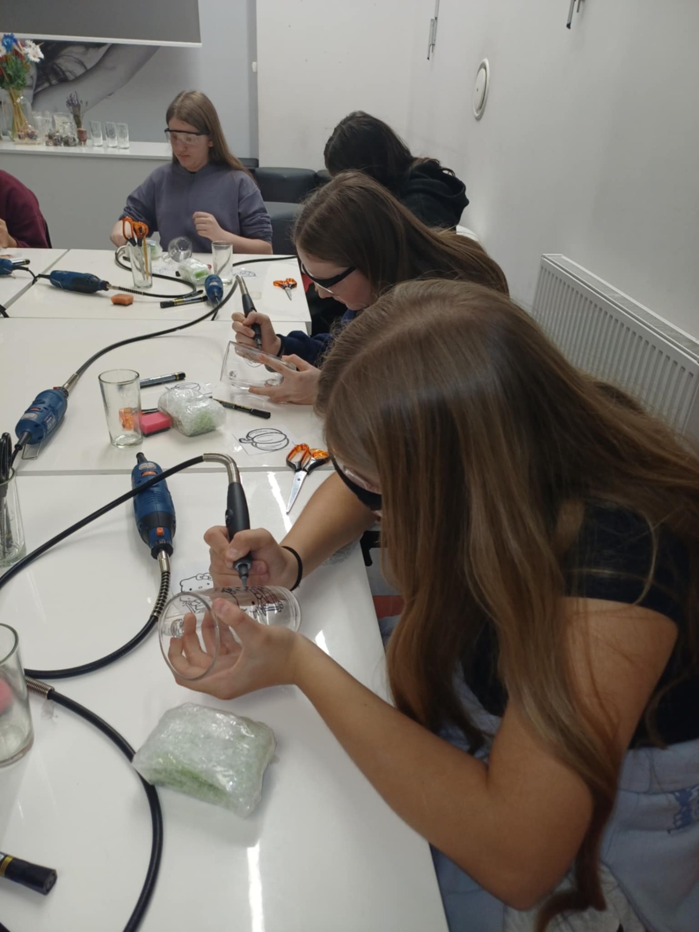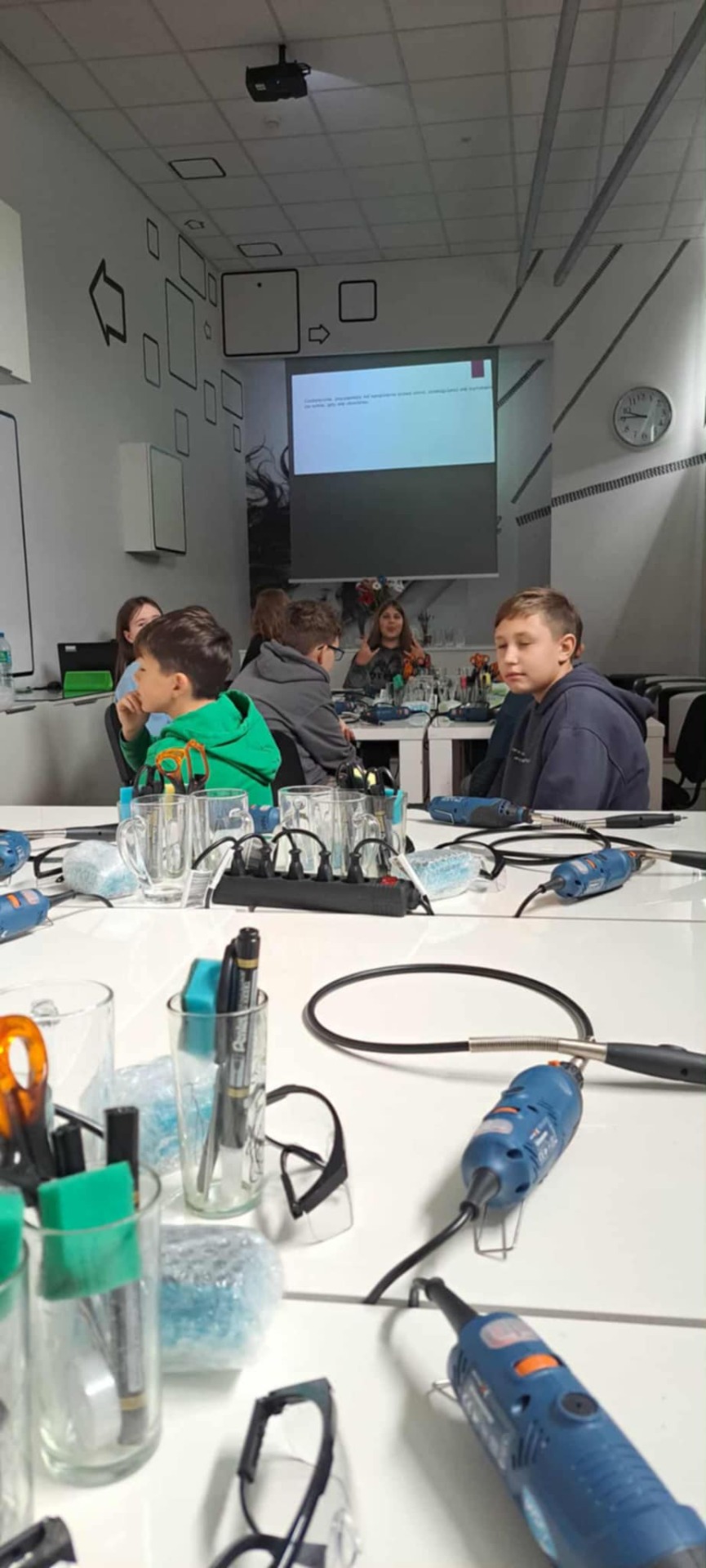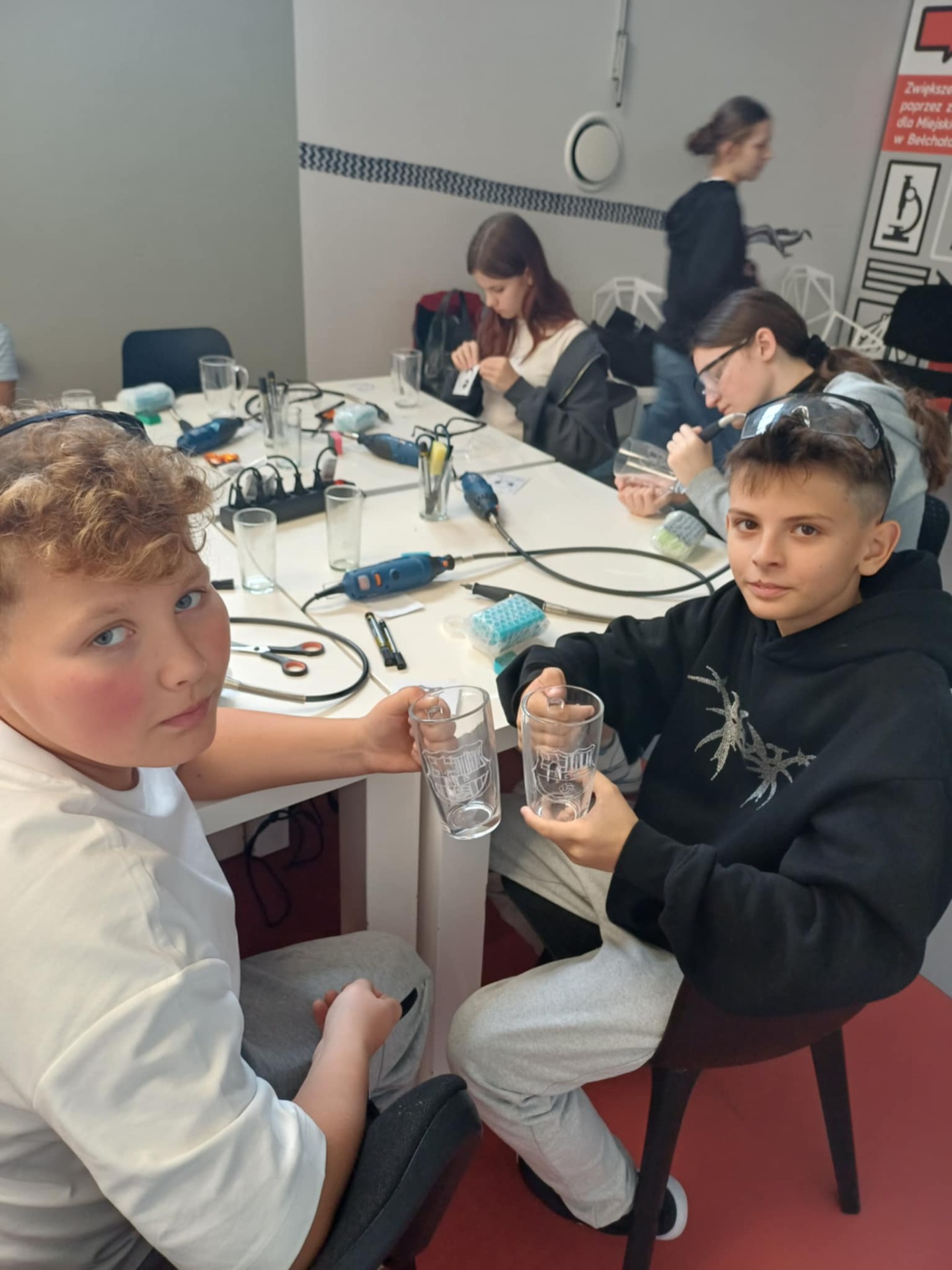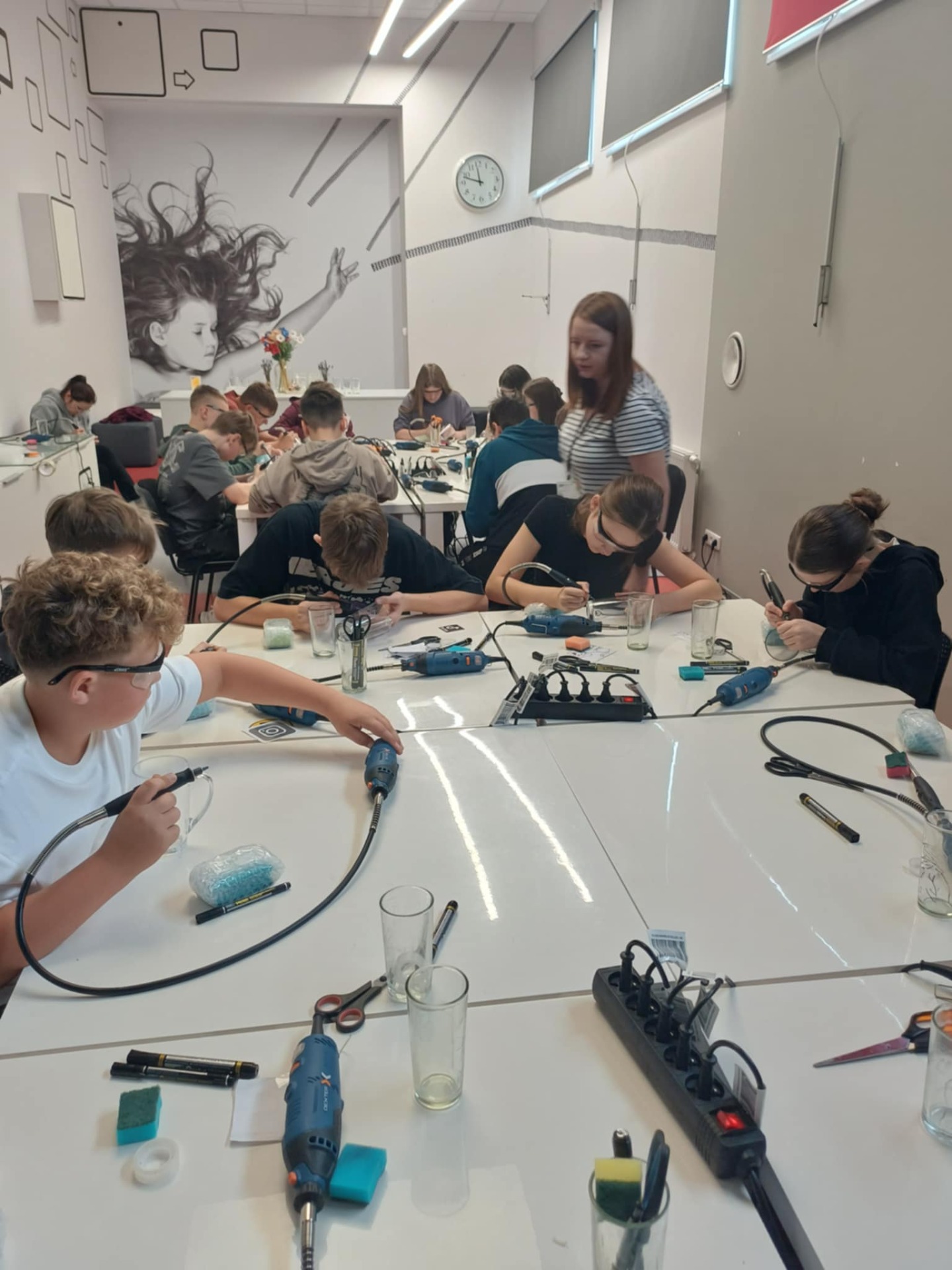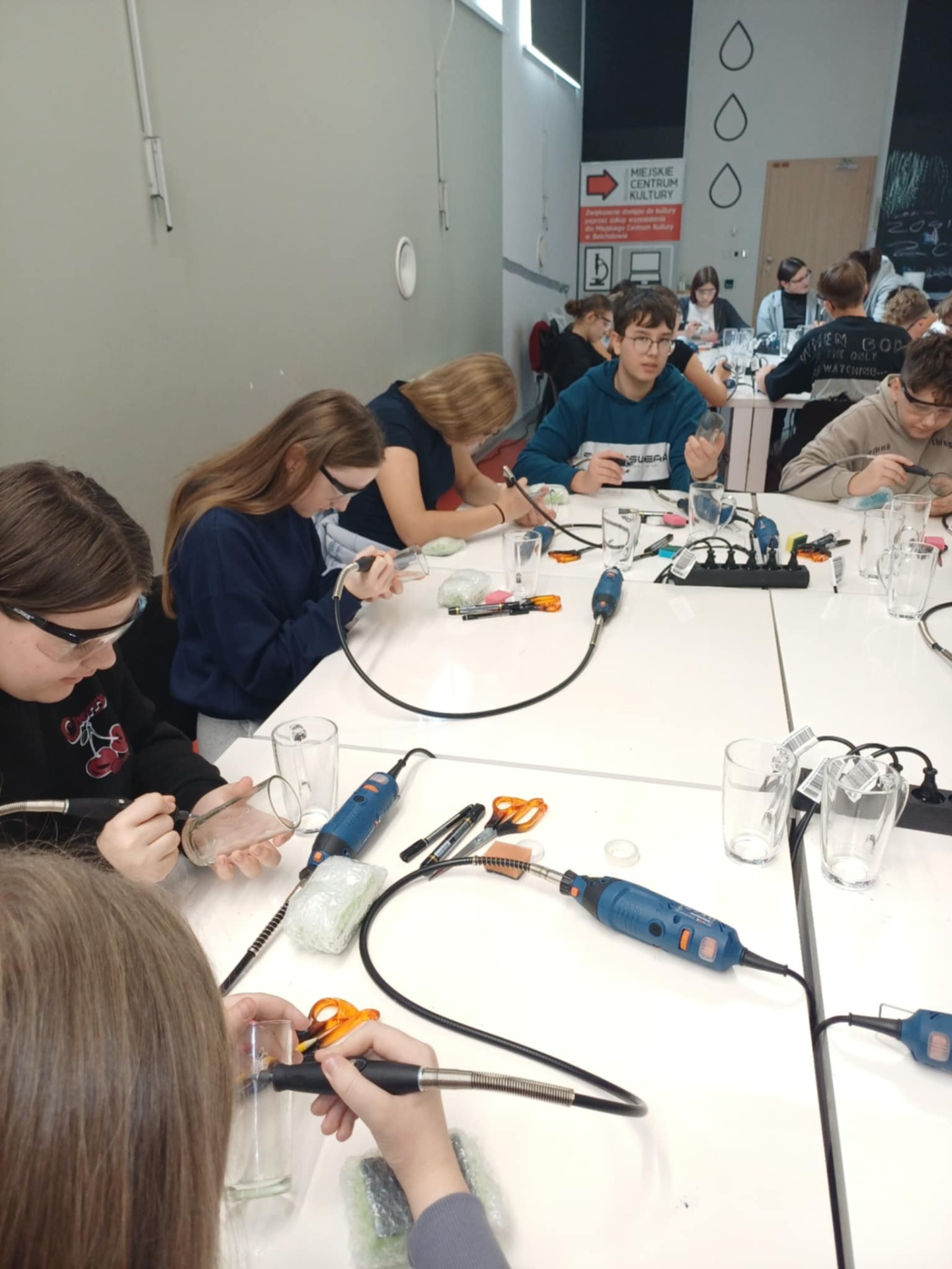 Druga część pobytu w muzeum to udział w warsztatach „Od piasku do szkła”, podczas których dowiedzieli się, z czego produkuje się szkło, jakie są jego rodzaje i zastosowanie oraz na czym polega praca hutnika w hucie szkła. W części praktycznej każdy z uczestników sam wygrawerował wybraną ozdobę na szklance, którą następnie zabrał do domu. Uczniom bardzo podobało się ozdabianie szkła, pracowali z dużym zaangażowaniem i skupieniem, tworząc piękne rysunki na szklankach.