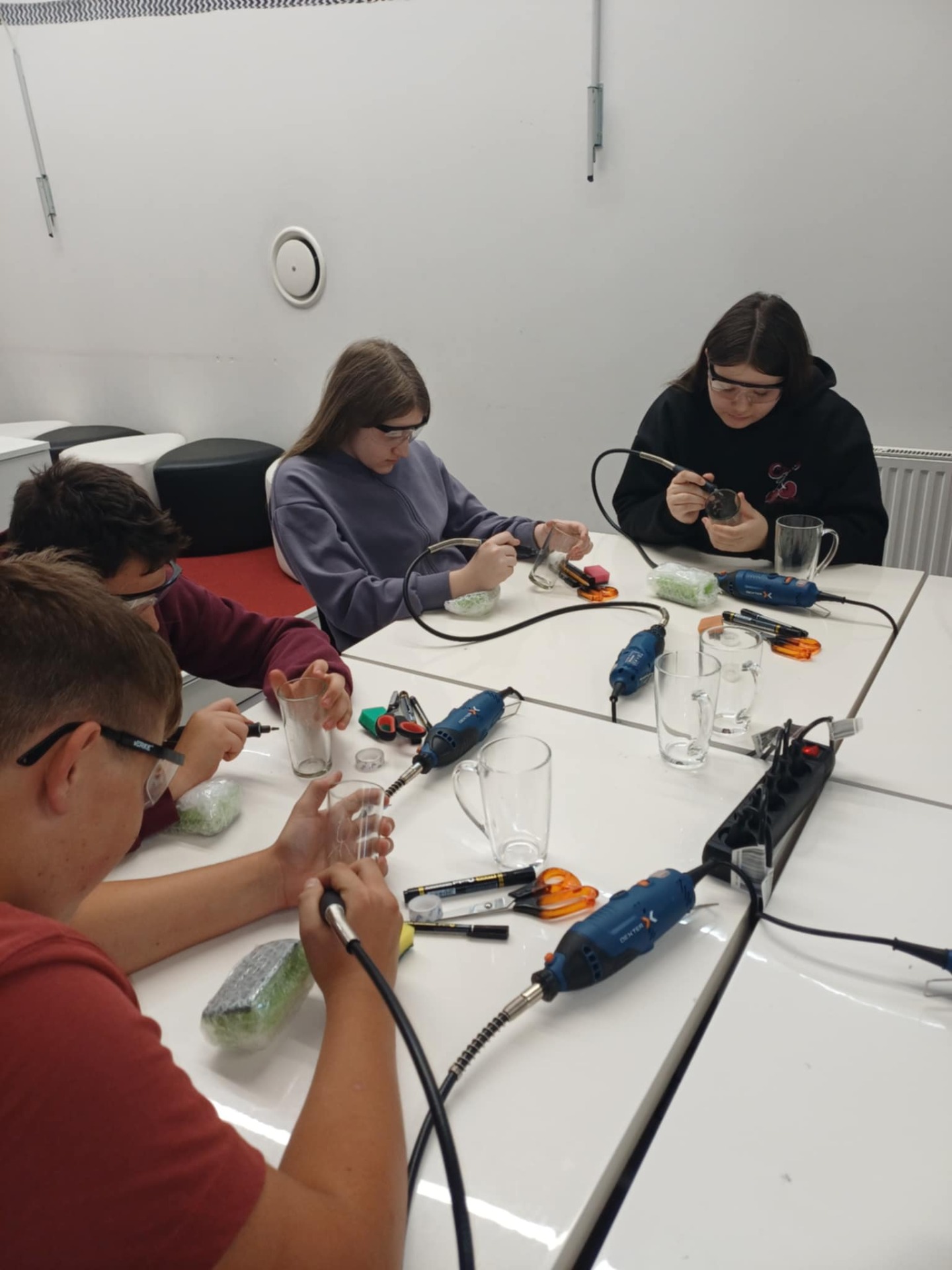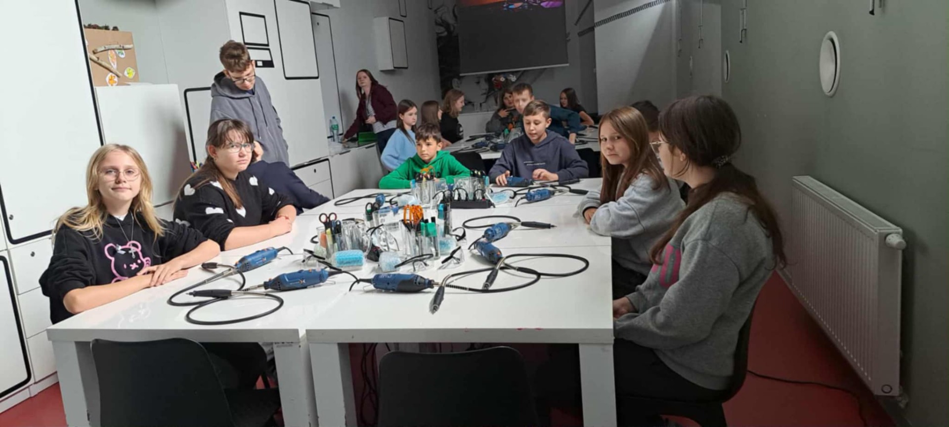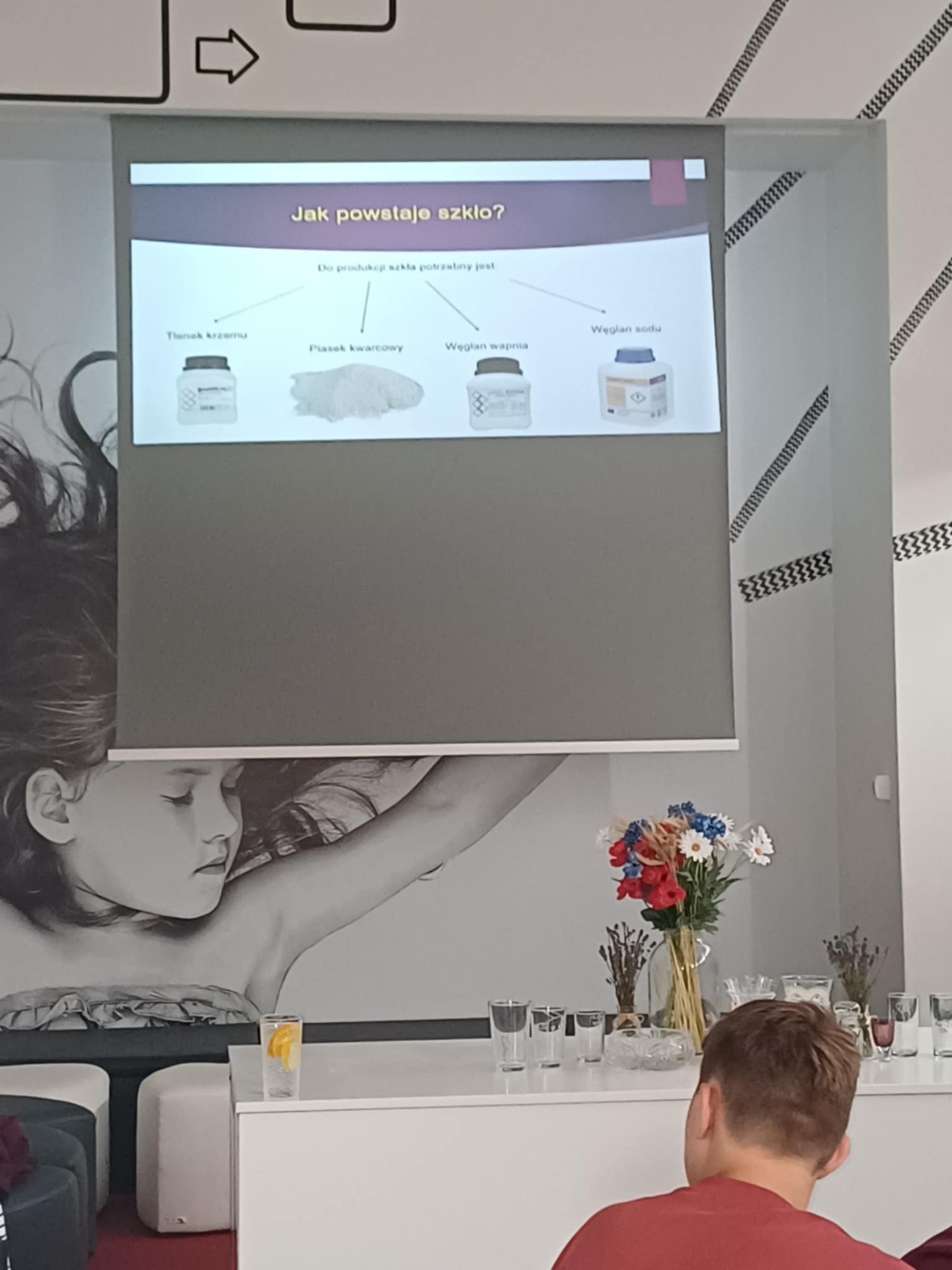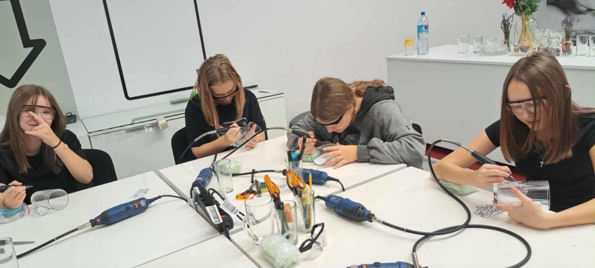 Druga część pobytu w muzeum to udział w warsztatach „Od piasku do szkła”, podczas których dowiedzieli się, z czego produkuje się szkło, jakie są jego rodzaje i zastosowanie oraz na czym polega praca hutnika w hucie szkła. W części praktycznej każdy z uczestników sam wygrawerował wybraną ozdobę na szklance, którą następnie zabrał do domu. Uczniom bardzo podobało się ozdabianie szkła, pracowali z dużym zaangażowaniem i skupieniem, tworząc piękne rysunki na szklankach.