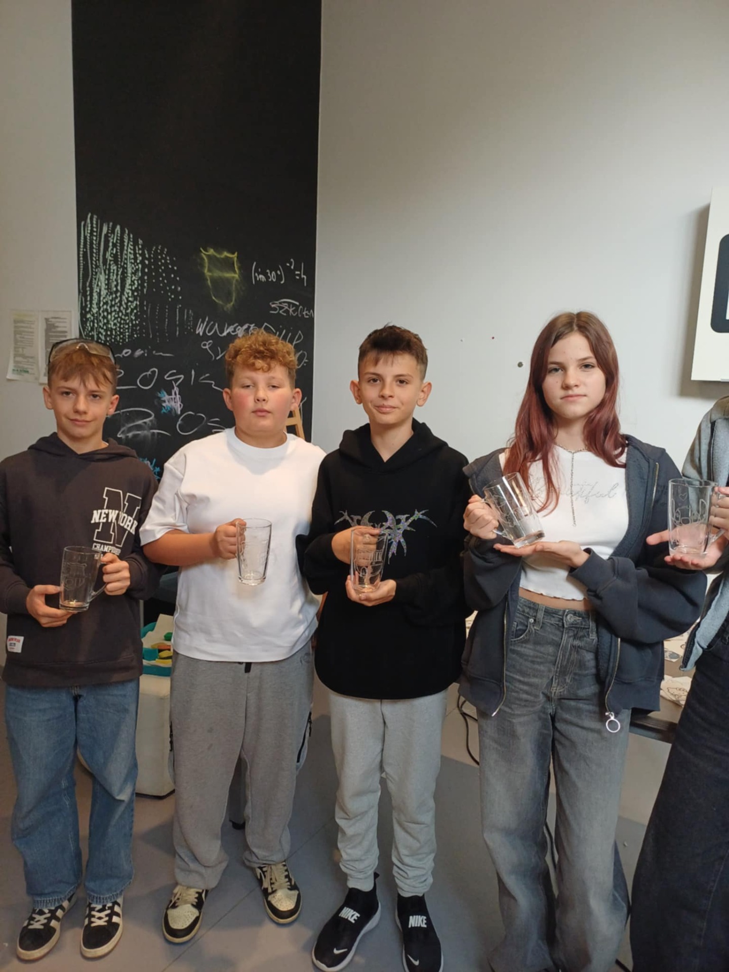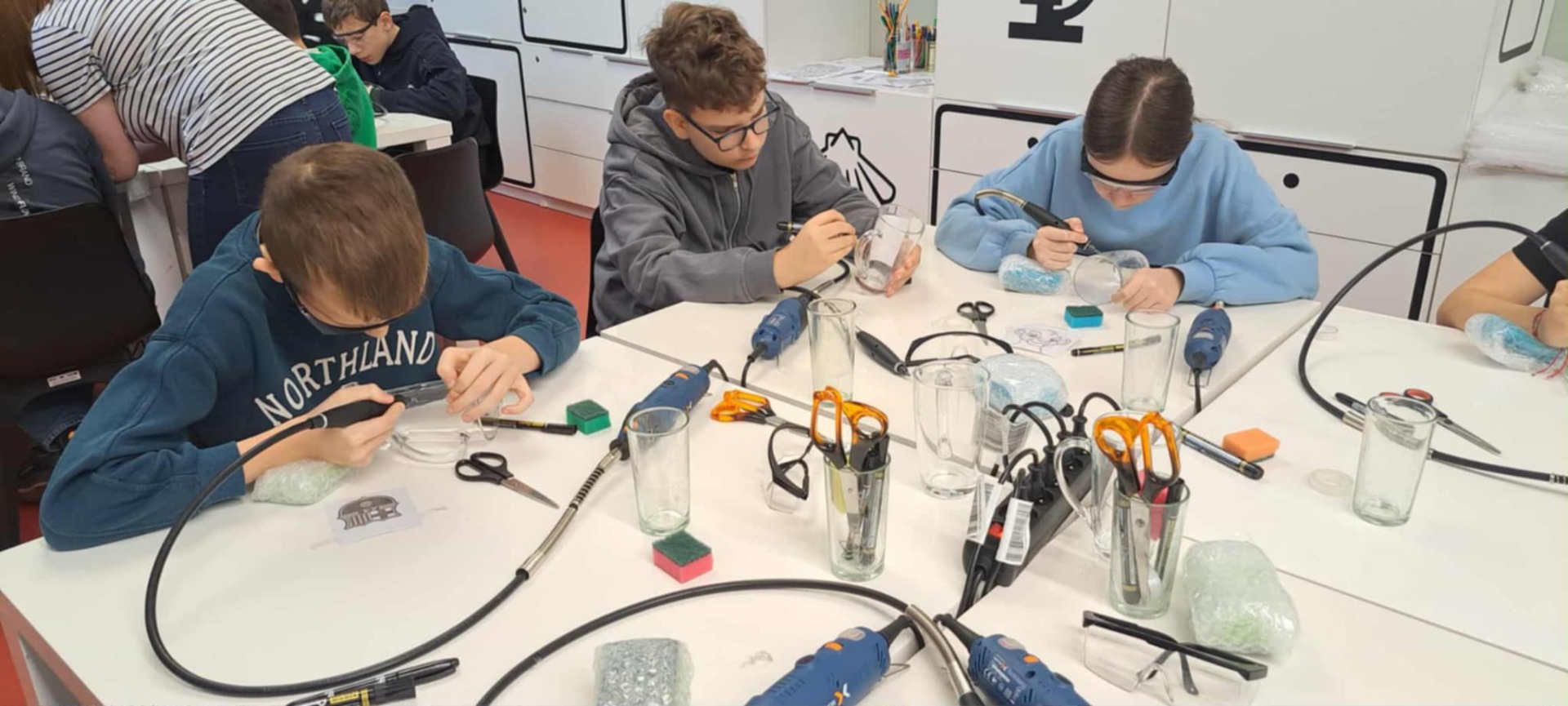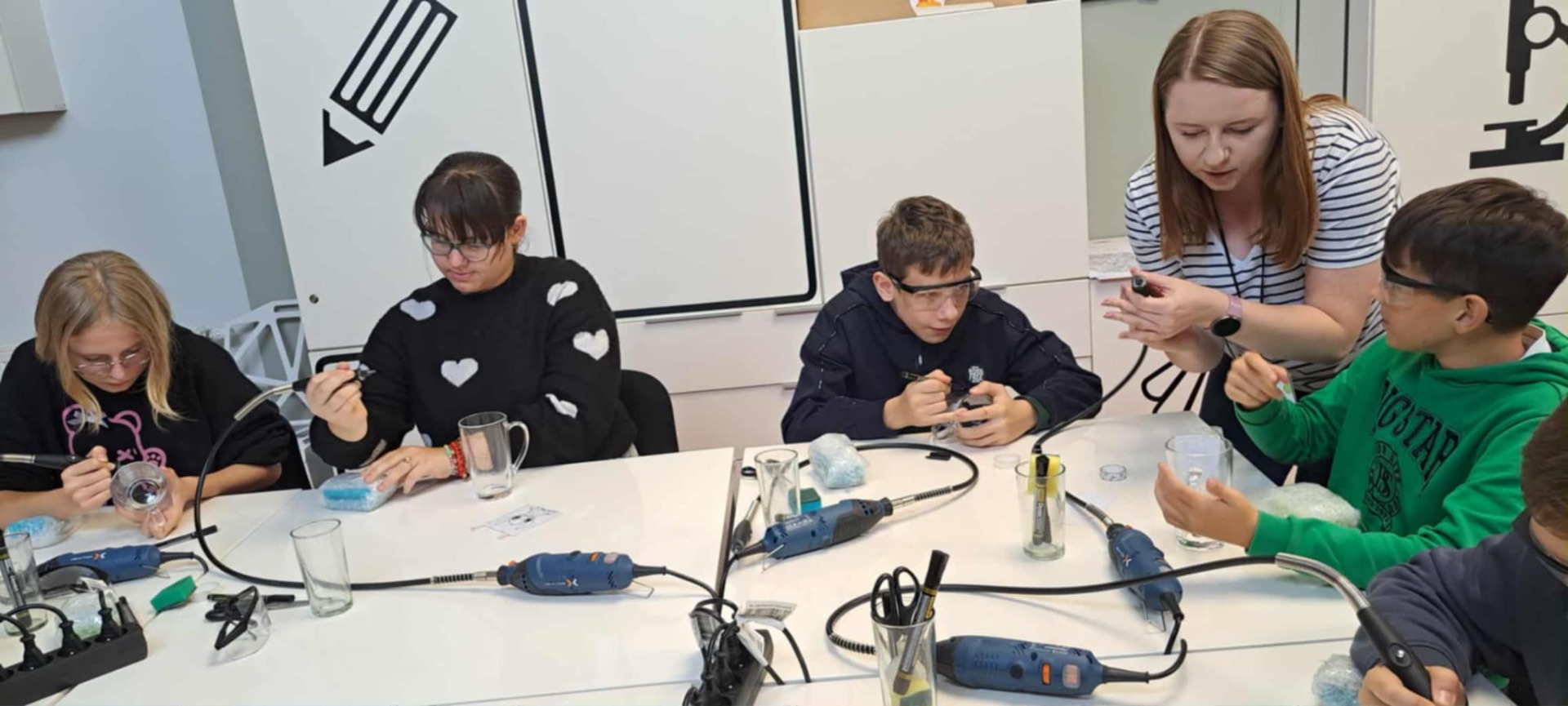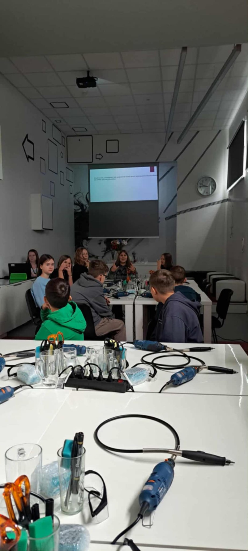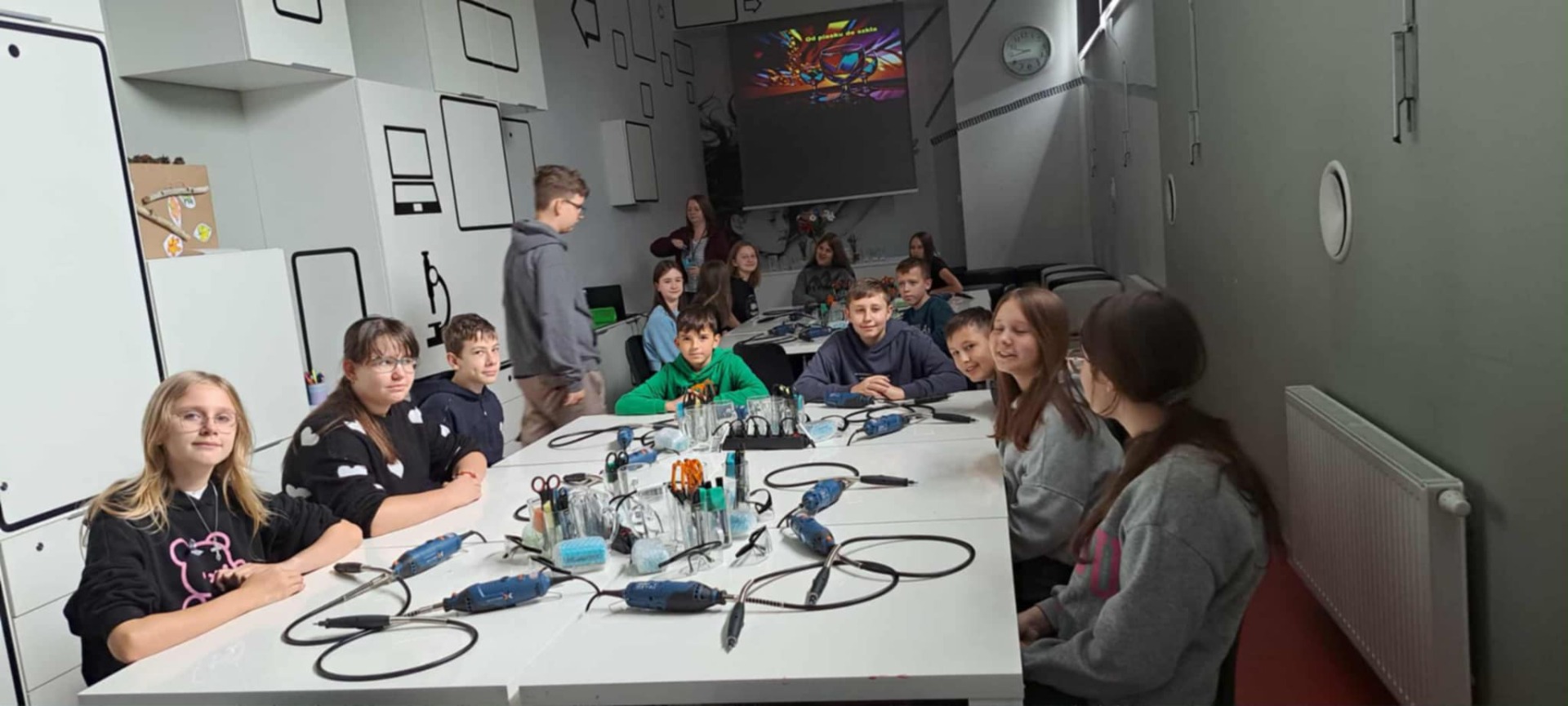 Druga część pobytu w muzeum to udział w warsztatach „Od piasku do szkła”, podczas których dowiedzieli się, z czego produkuje się szkło, jakie są jego rodzaje i zastosowanie oraz na czym polega praca hutnika w hucie szkła. W części praktycznej każdy z uczestników sam wygrawerował wybraną ozdobę na szklance, którą następnie zabrał do domu. Uczniom bardzo podobało się ozdabianie szkła, pracowali z dużym zaangażowaniem i skupieniem, tworząc piękne rysunki na szklankach.
