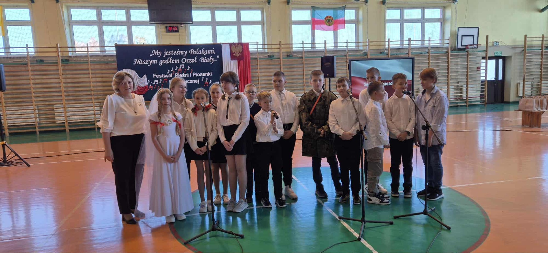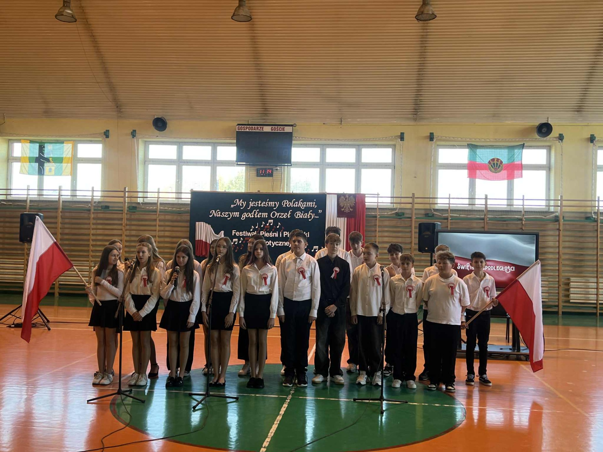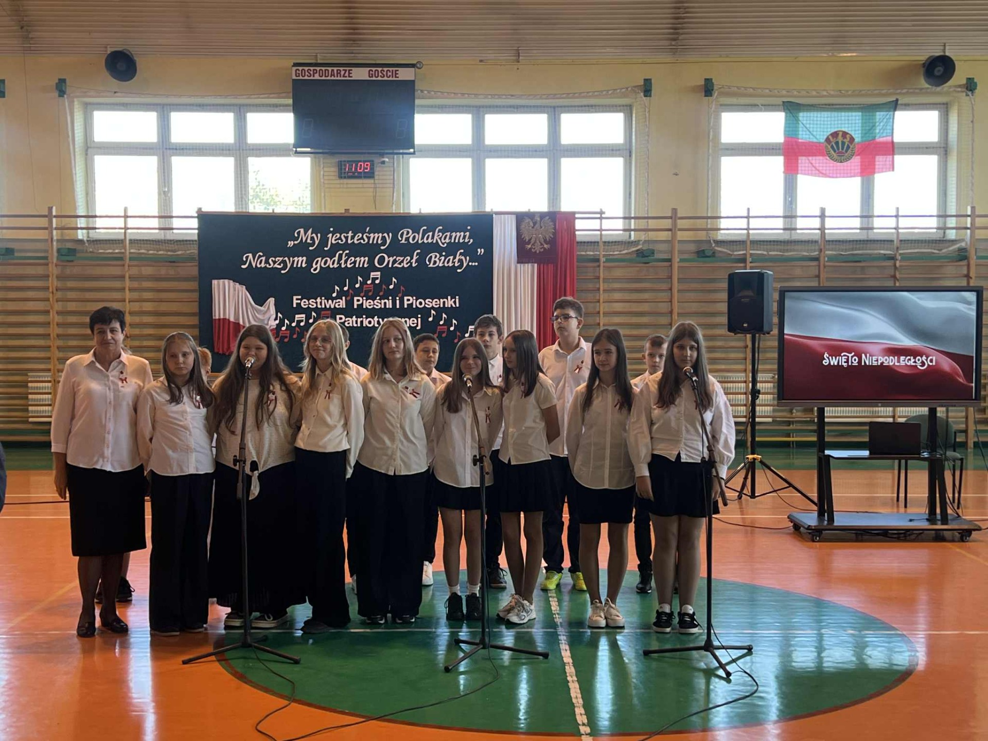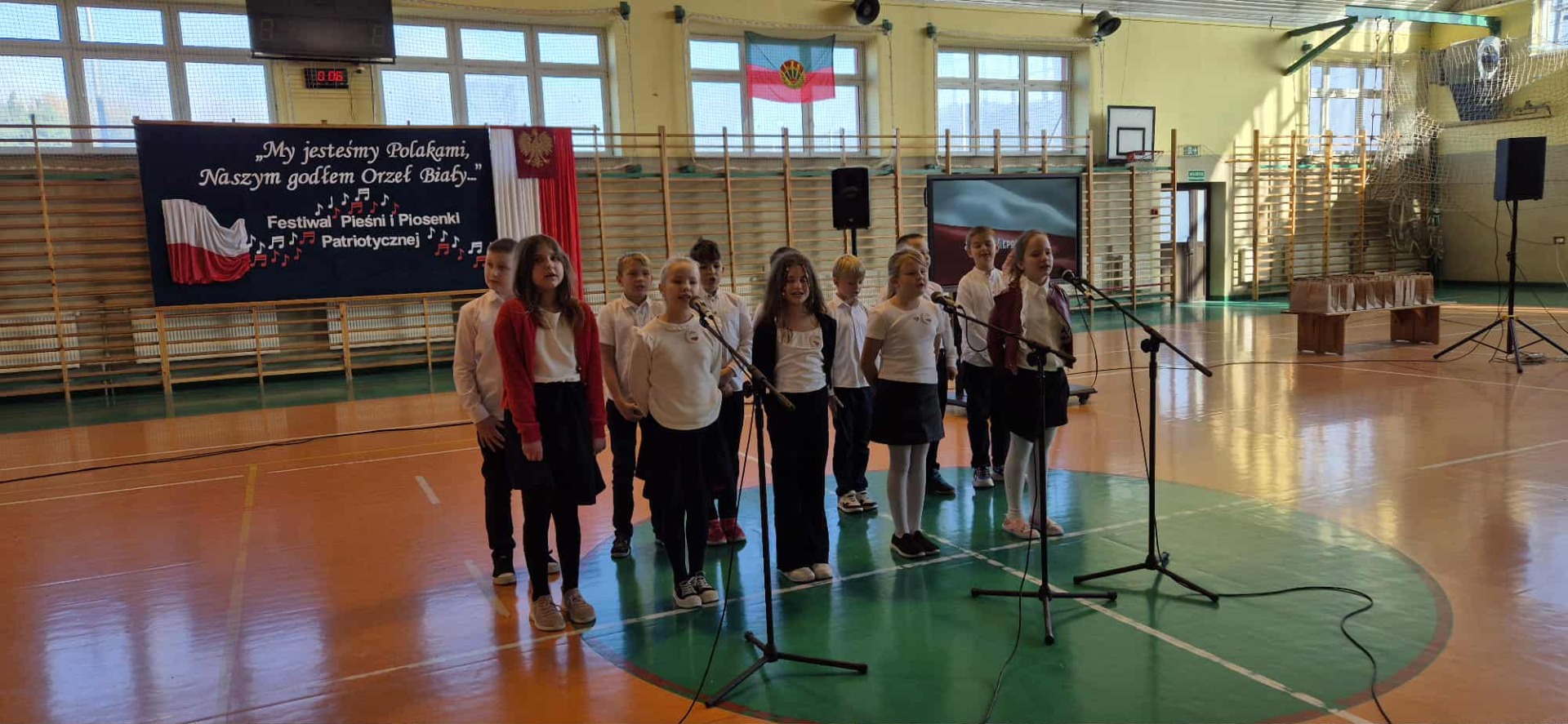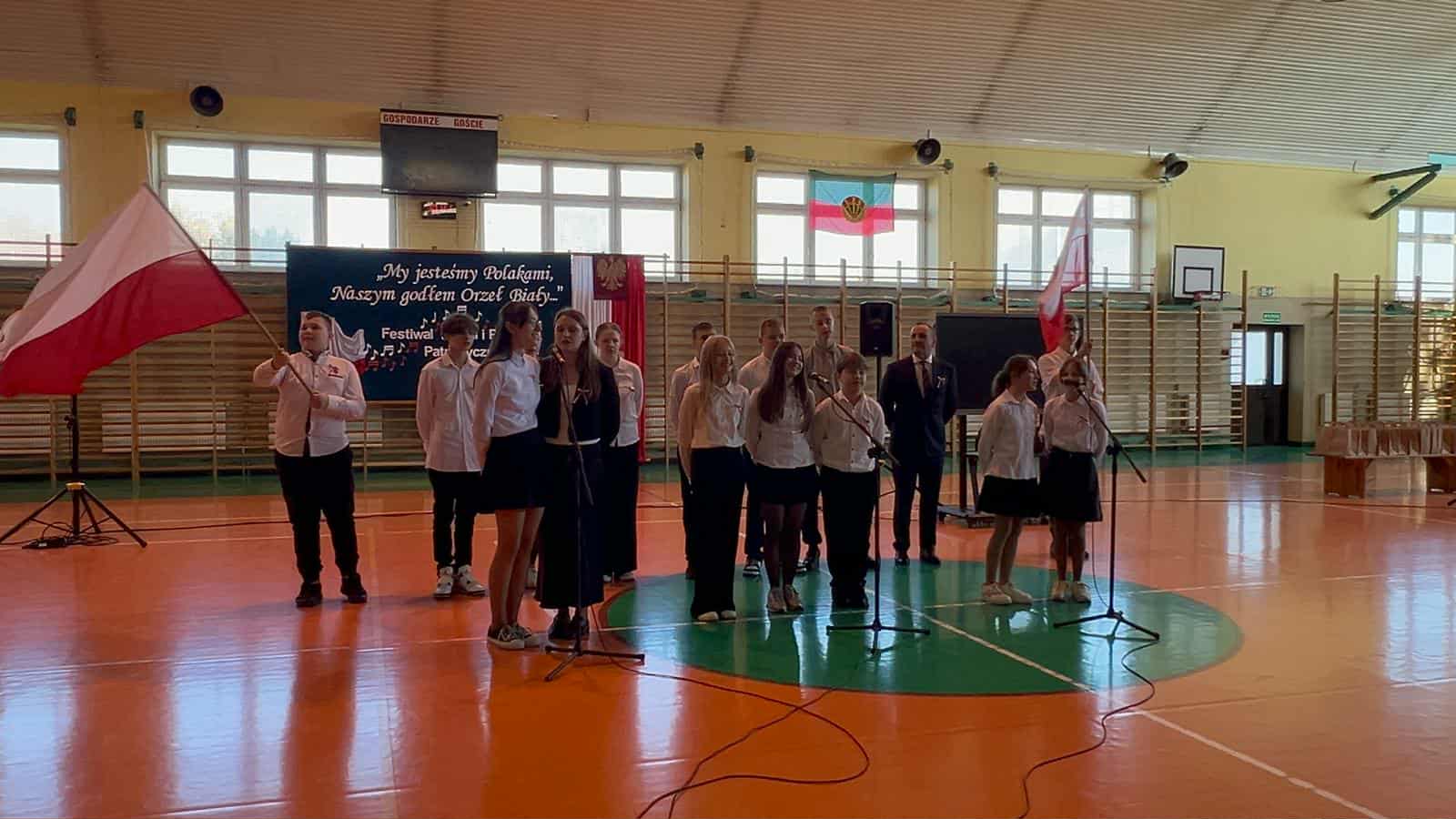 Po części oficjalnej uczestnicy przenieśli się do muzycznej odsłony uroczystości – Festiwalu Pieśni i Piosenki Patriotycznej. Każda klasa zaprezentowała wylosowany utwór patriotyczny, z dumą i zaangażowaniem oddając hołd historii oraz bohaterom walk o wolność. Wspólne śpiewanie oraz występy uczniów wprowadziły zgromadzonych w wyjątkową atmosferę pełną dumy i refleksji nad historią naszego kraju.