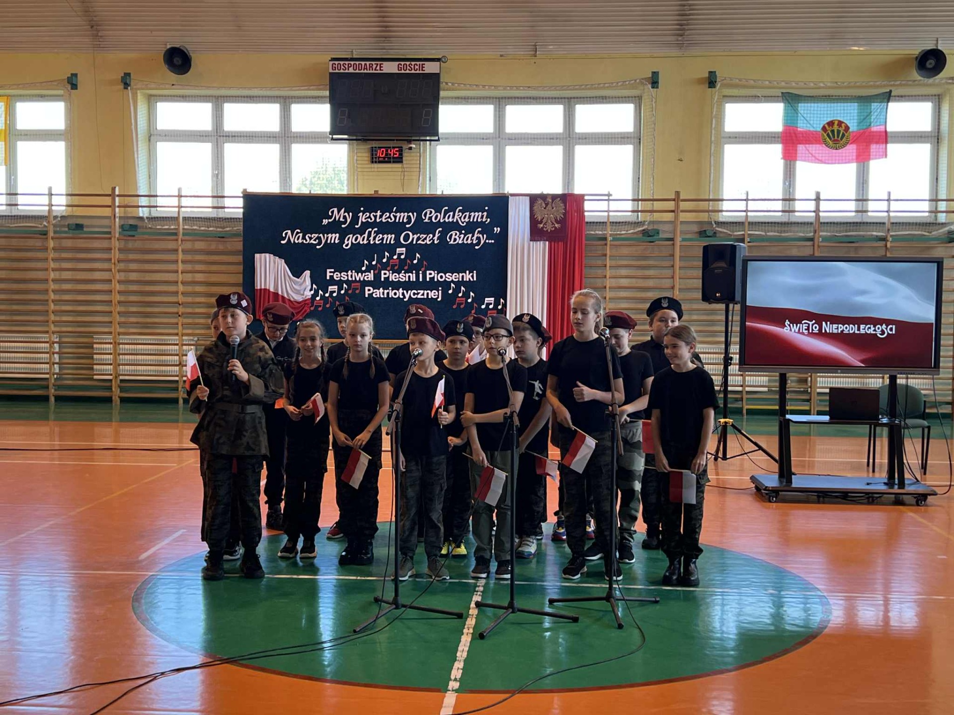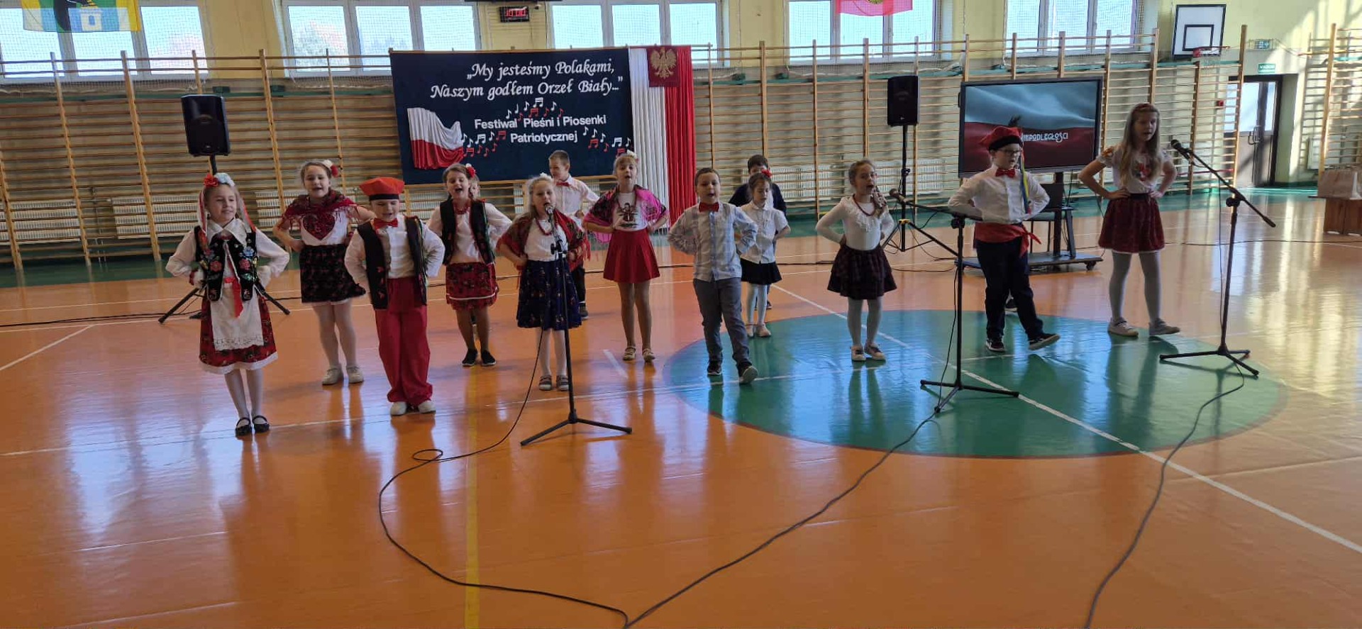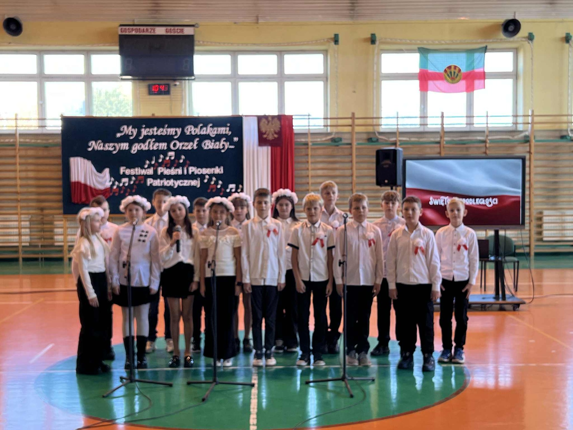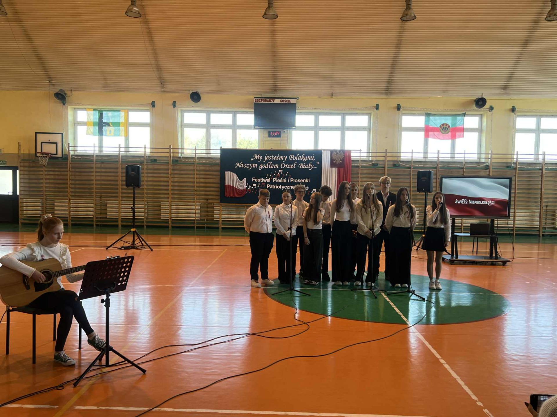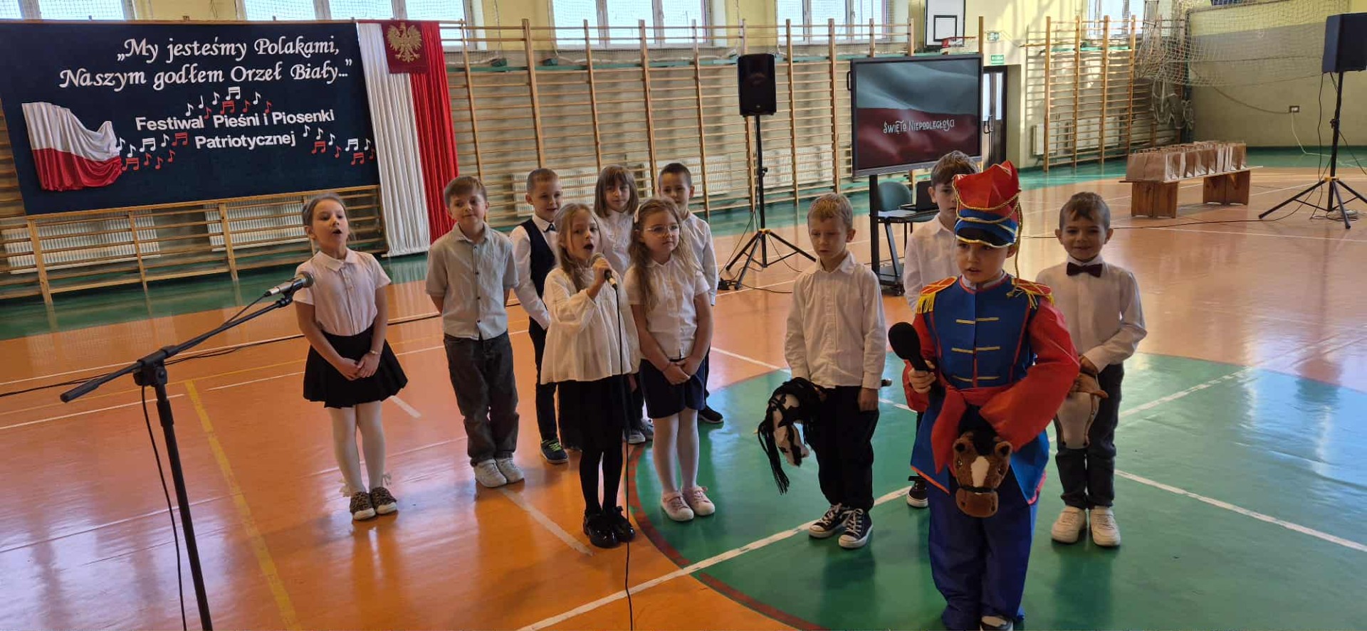 Po części oficjalnej uczestnicy przenieśli się do muzycznej odsłony uroczystości – Festiwalu Pieśni i Piosenki Patriotycznej. Każda klasa zaprezentowała wylosowany utwór patriotyczny, z dumą i zaangażowaniem oddając hołd historii oraz bohaterom walk o wolność. Wspólne śpiewanie oraz występy uczniów wprowadziły zgromadzonych w wyjątkową atmosferę pełną dumy i refleksji nad historią naszego kraju.