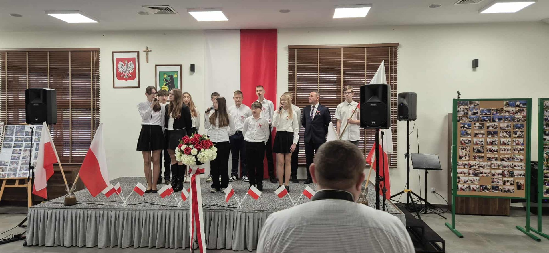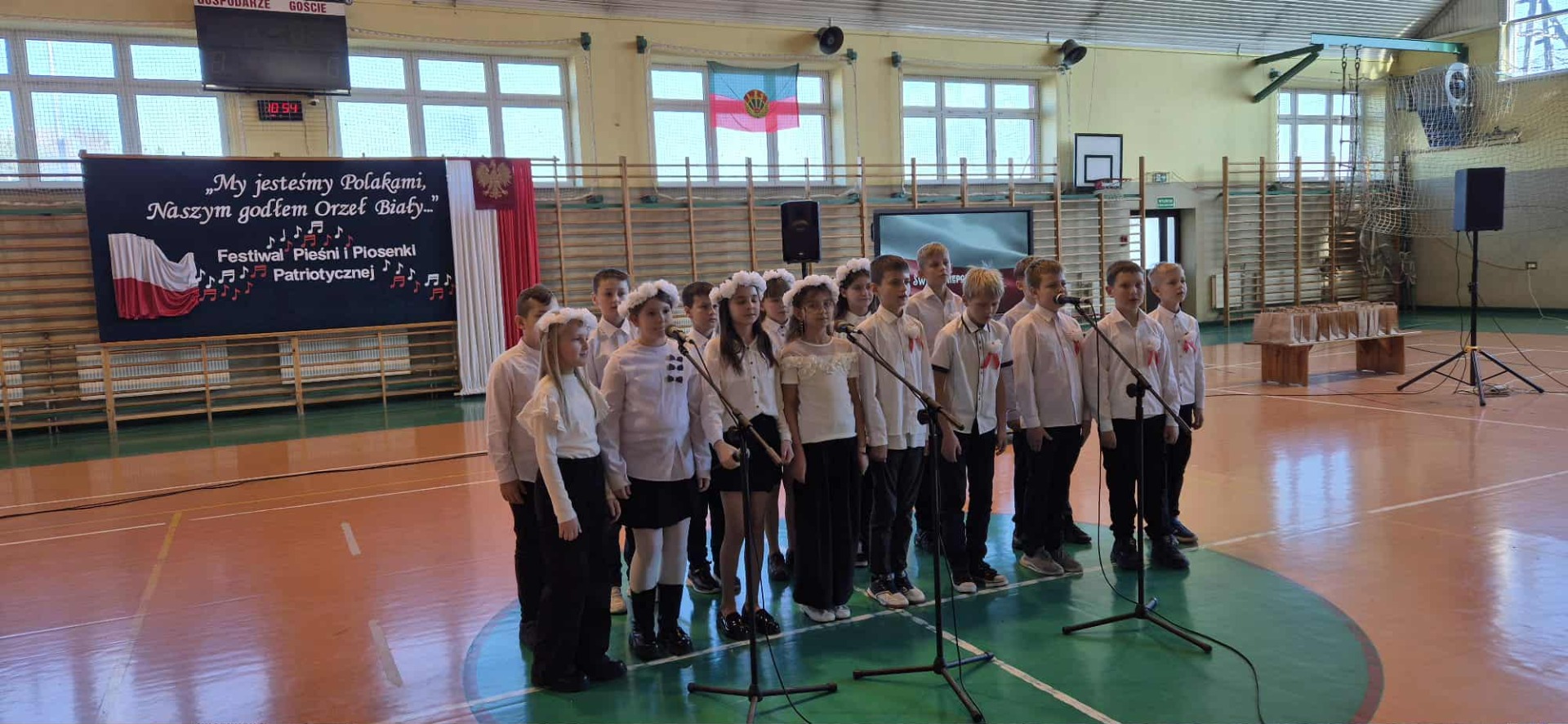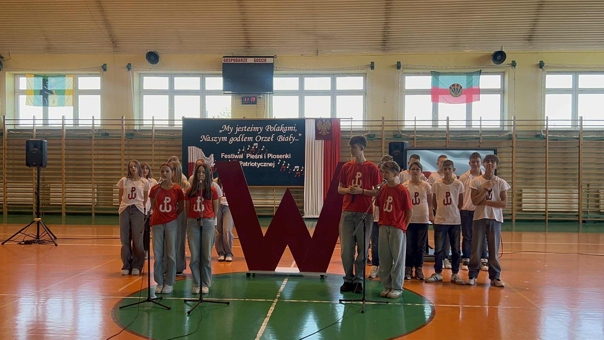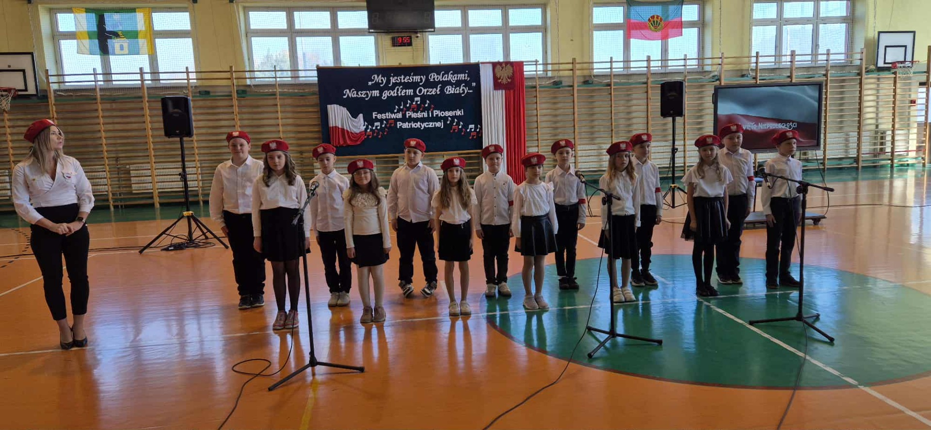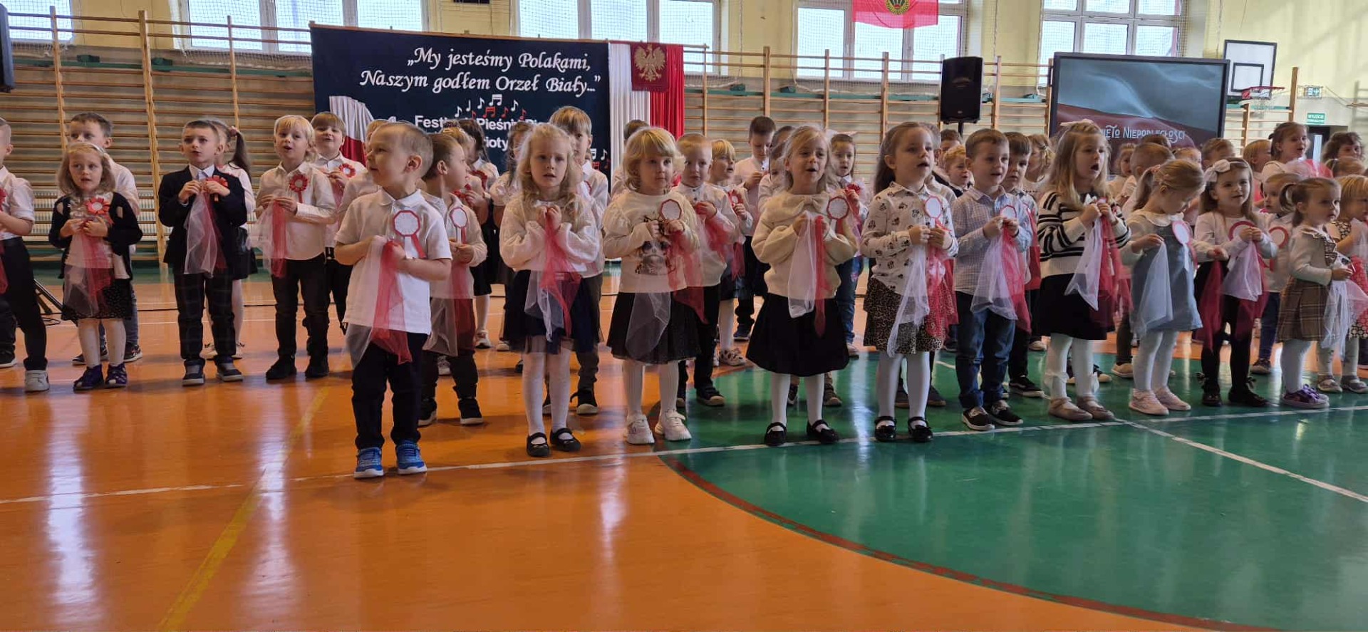 Po części oficjalnej uczestnicy przenieśli się do muzycznej odsłony uroczystości – Festiwalu Pieśni i Piosenki Patriotycznej. Każda klasa zaprezentowała wylosowany utwór patriotyczny, z dumą i zaangażowaniem oddając hołd historii oraz bohaterom walk o wolność. Wspólne śpiewanie oraz występy uczniów wprowadziły zgromadzonych w wyjątkową atmosferę pełną dumy i refleksji nad historią naszego kraju.
