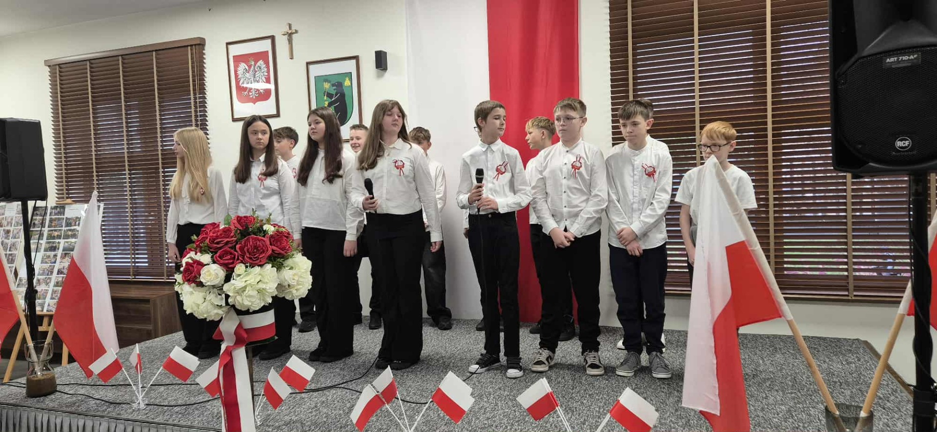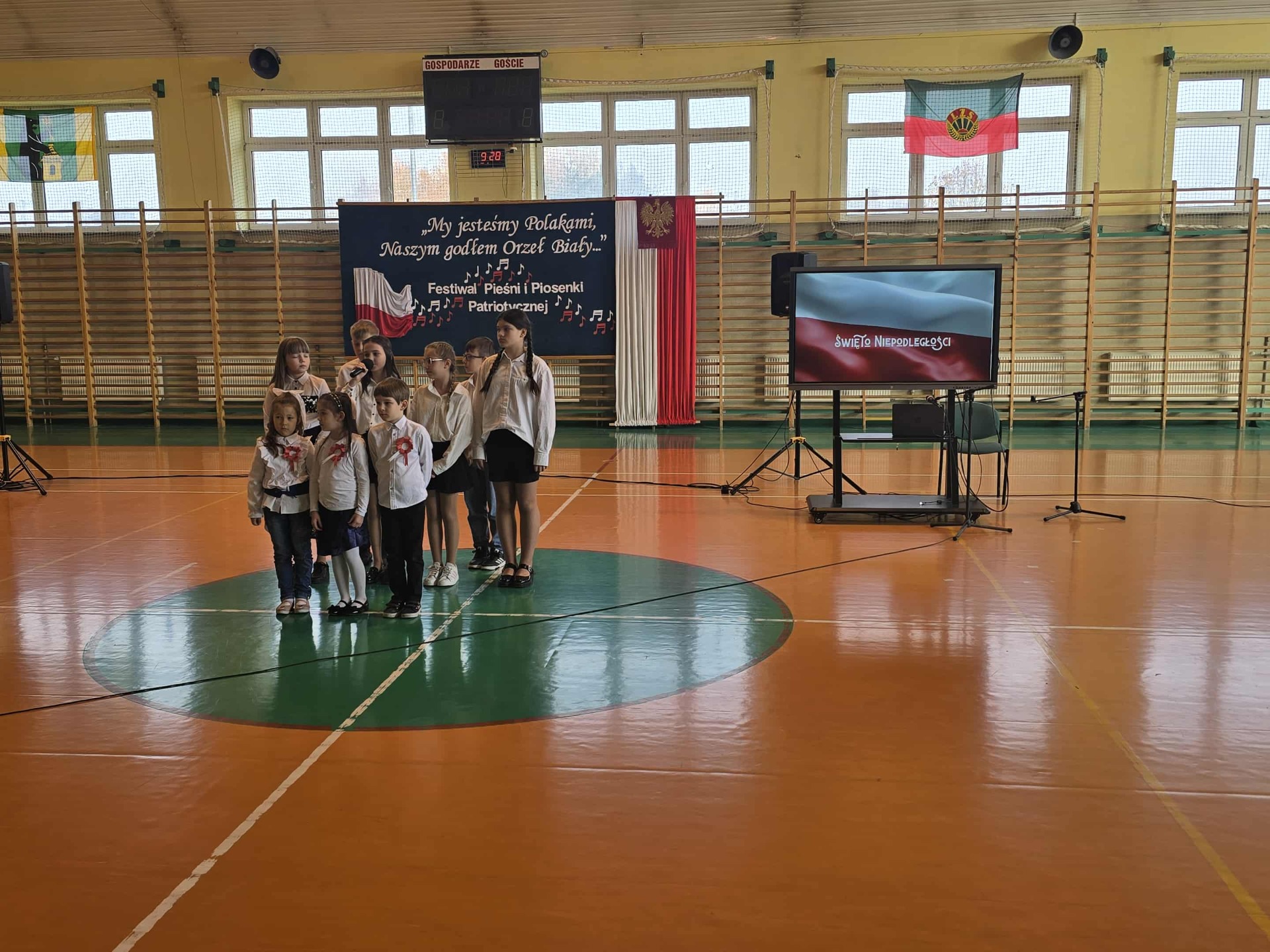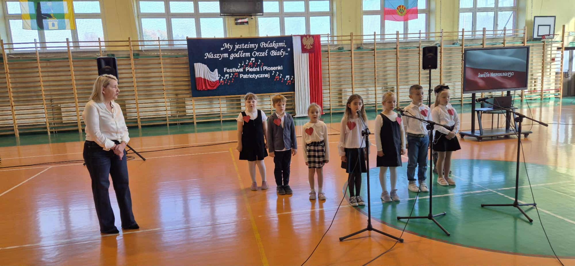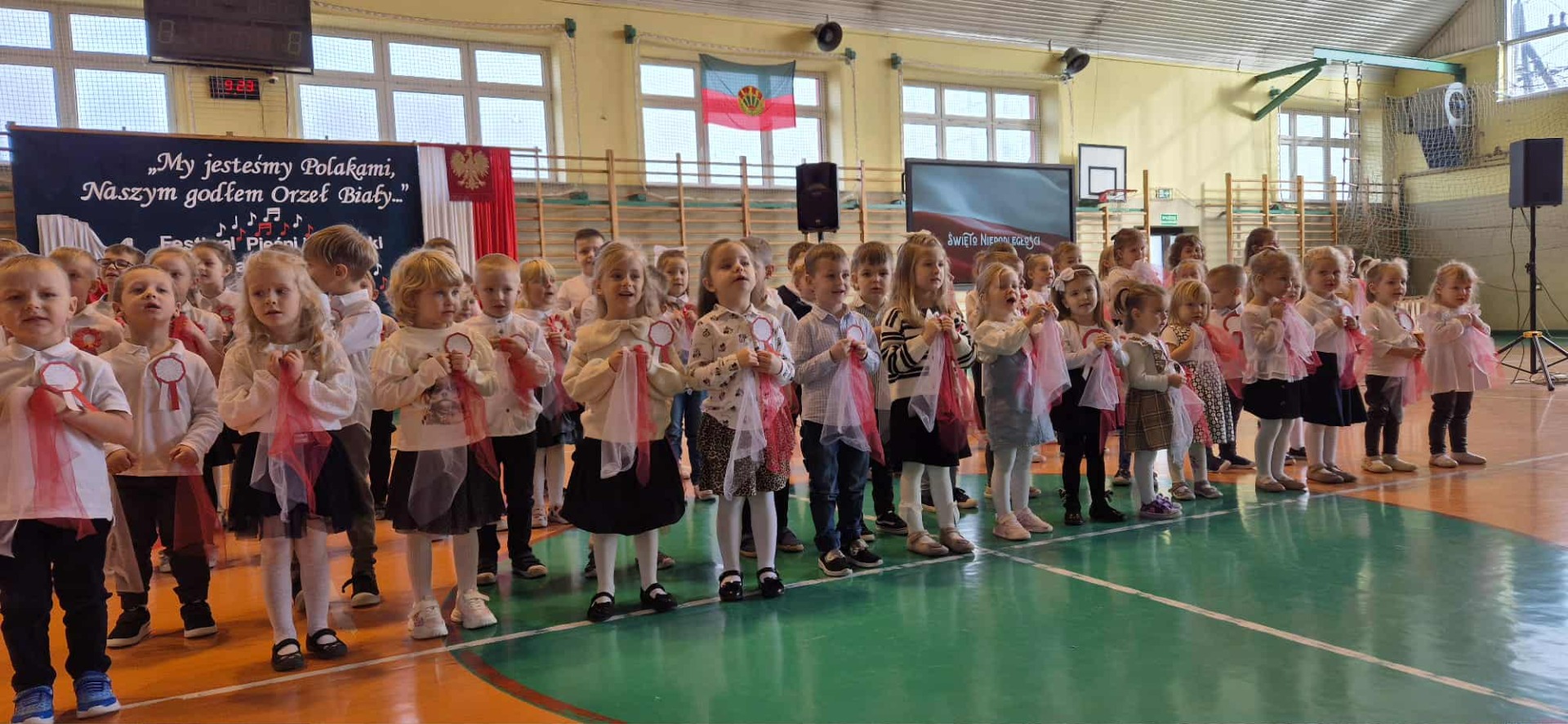 Po części oficjalnej uczestnicy przenieśli się do muzycznej odsłony uroczystości – Festiwalu Pieśni i Piosenki Patriotycznej. Każda klasa zaprezentowała wylosowany utwór patriotyczny, z dumą i zaangażowaniem oddając hołd historii oraz bohaterom walk o wolność. Wspólne śpiewanie oraz występy uczniów wprowadziły zgromadzonych w wyjątkową atmosferę pełną dumy i refleksji nad historią naszego kraju.