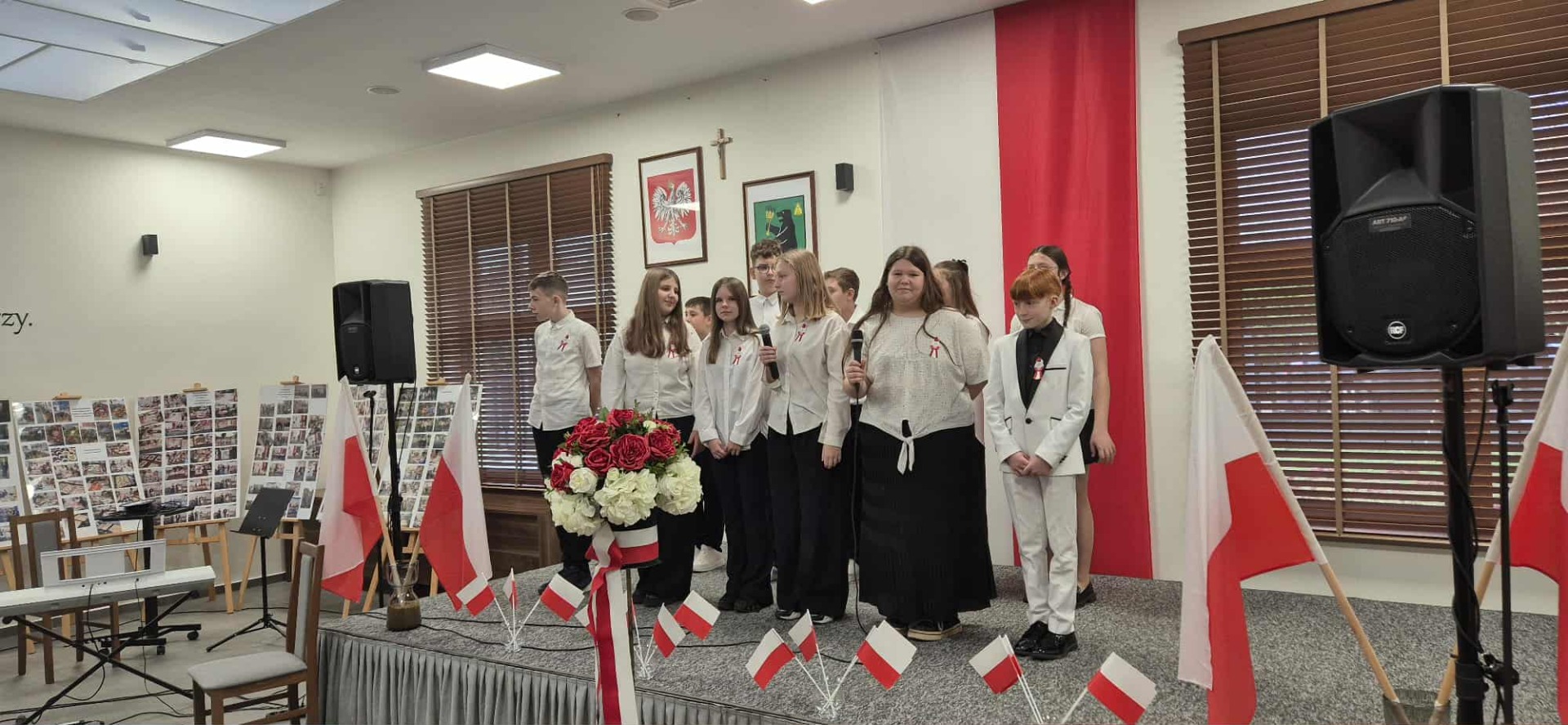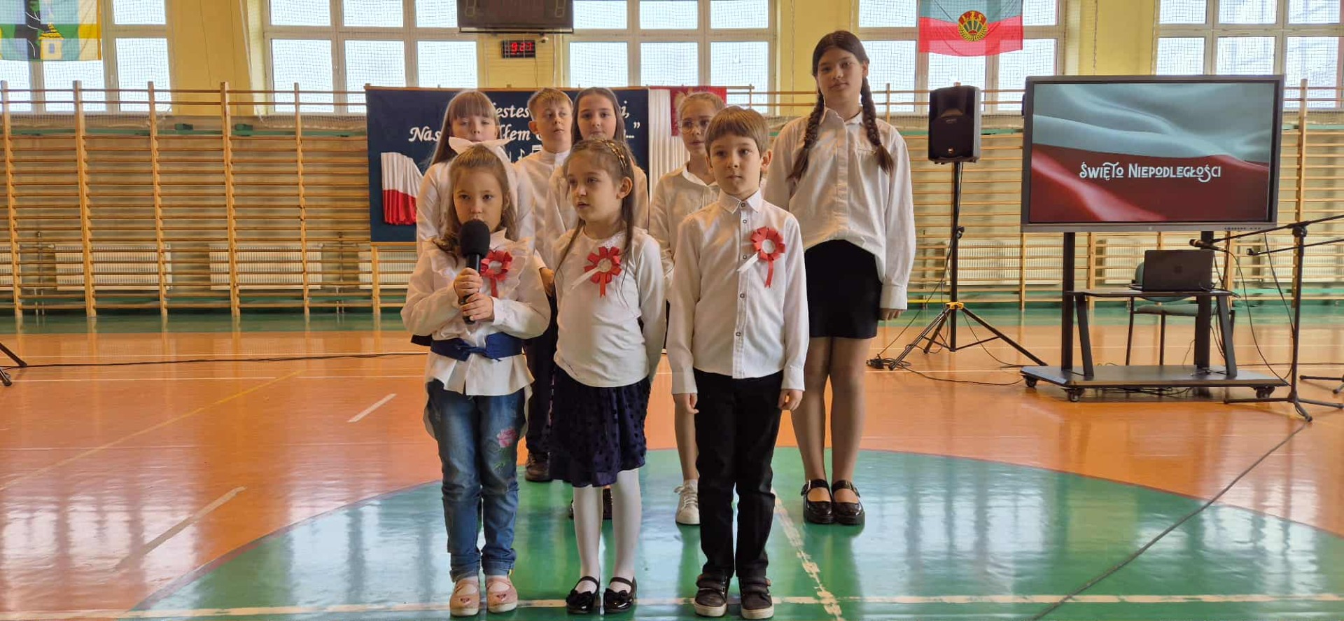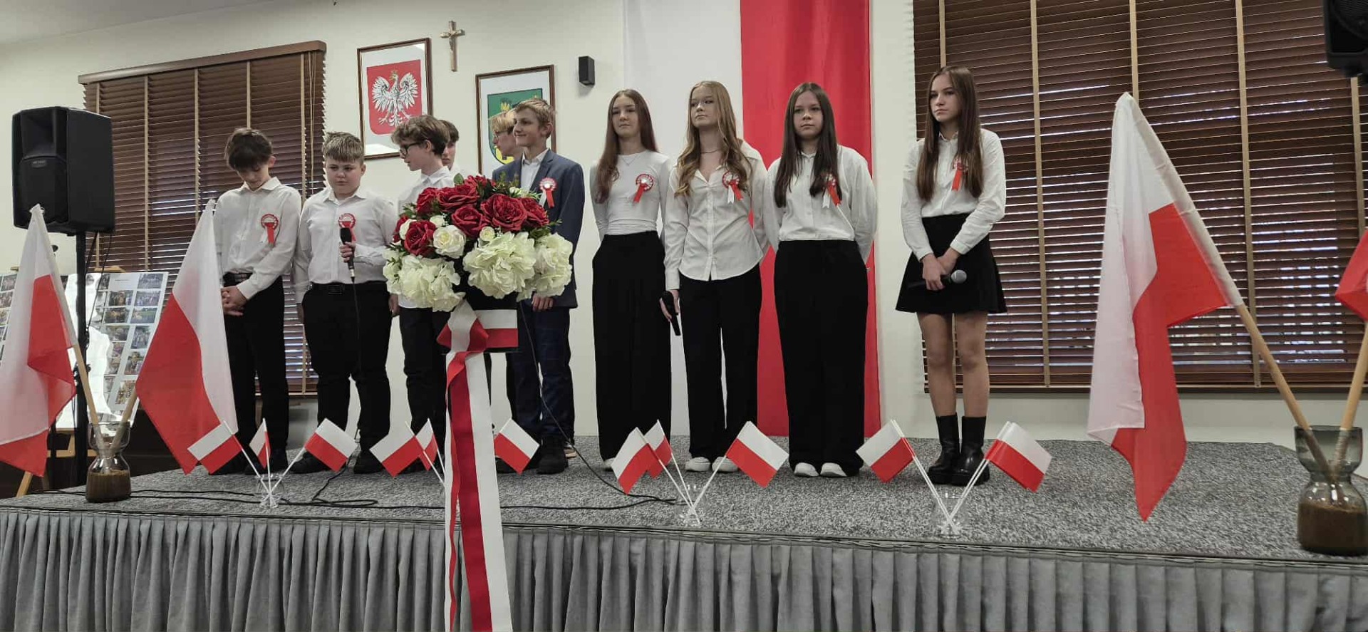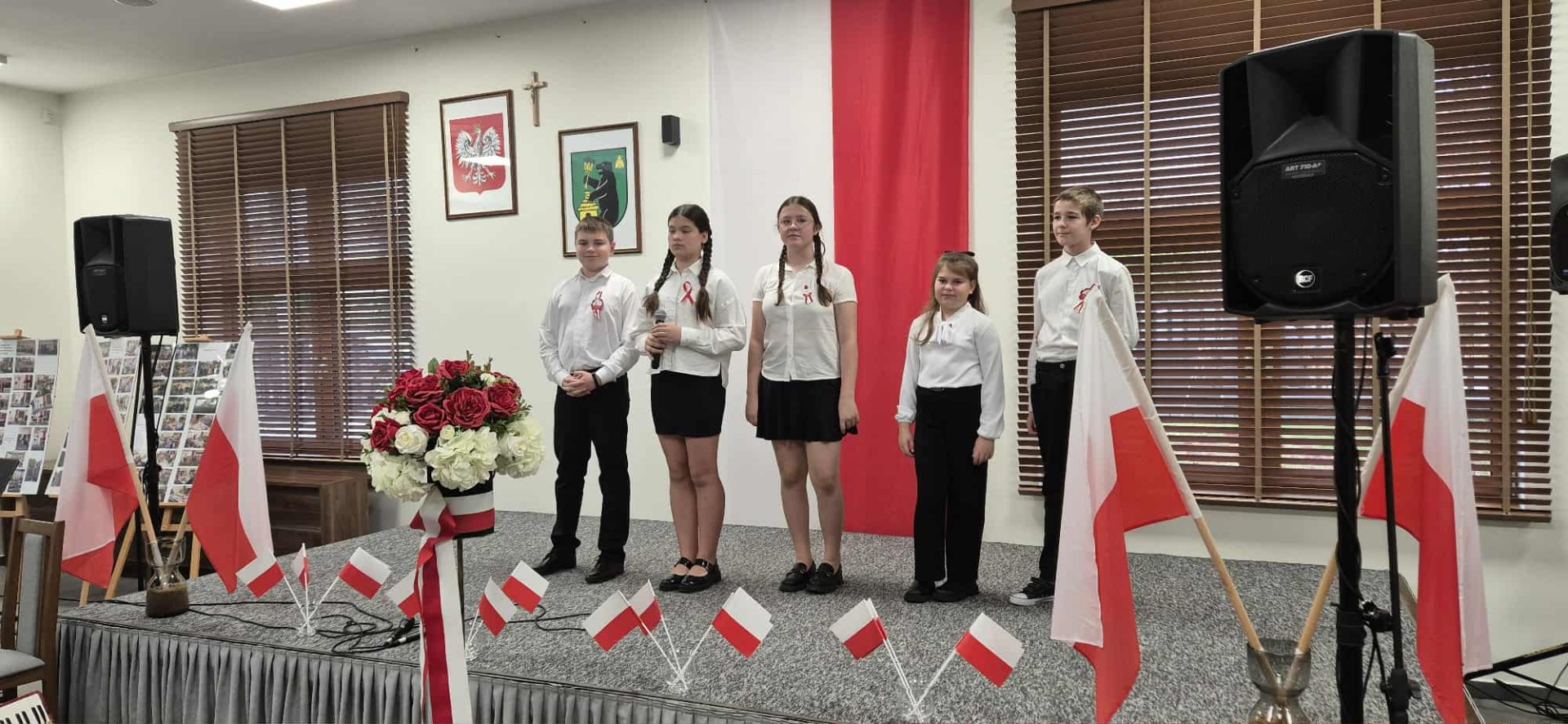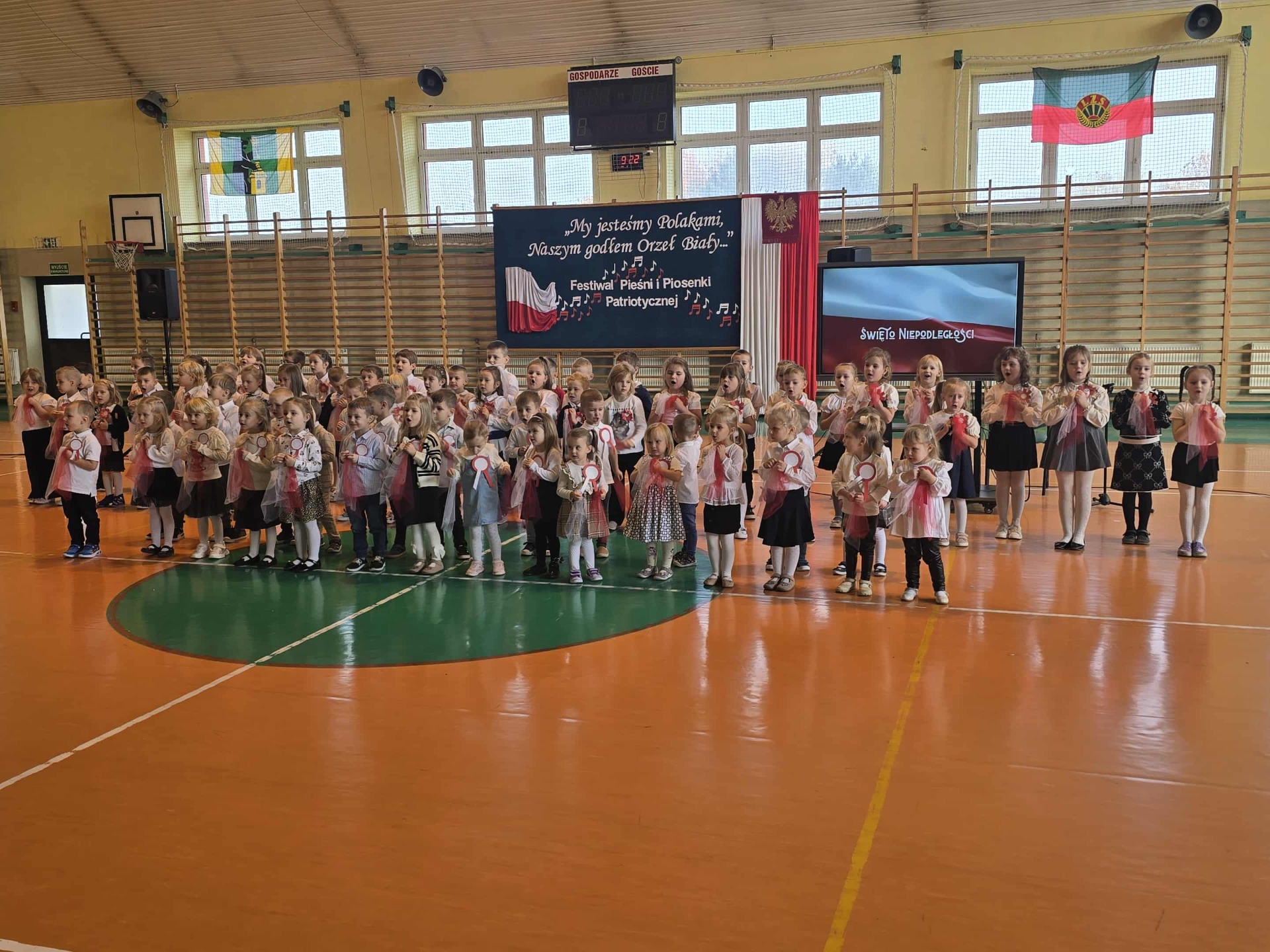 Po części oficjalnej uczestnicy przenieśli się do muzycznej odsłony uroczystości – Festiwalu Pieśni i Piosenki Patriotycznej. Każda klasa zaprezentowała wylosowany utwór patriotyczny, z dumą i zaangażowaniem oddając hołd historii oraz bohaterom walk o wolność. Wspólne śpiewanie oraz występy uczniów wprowadziły zgromadzonych w wyjątkową atmosferę pełną dumy i refleksji nad historią naszego kraju.
