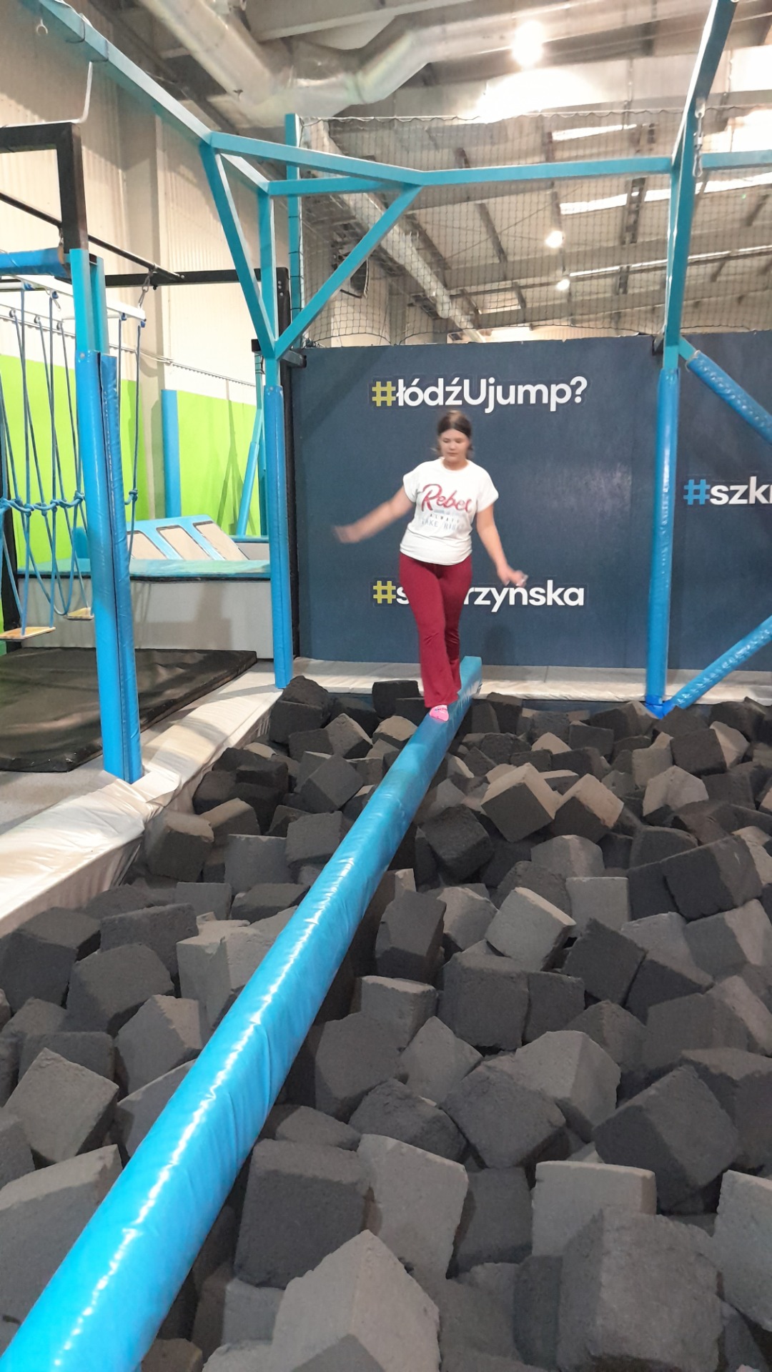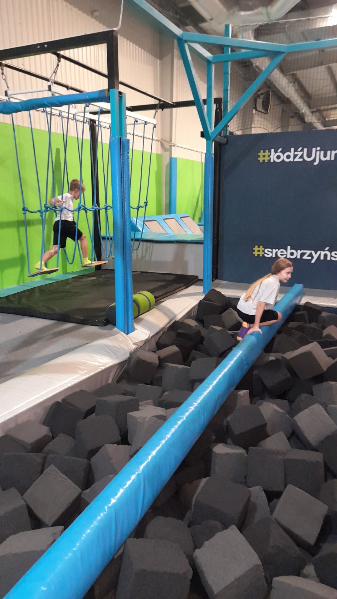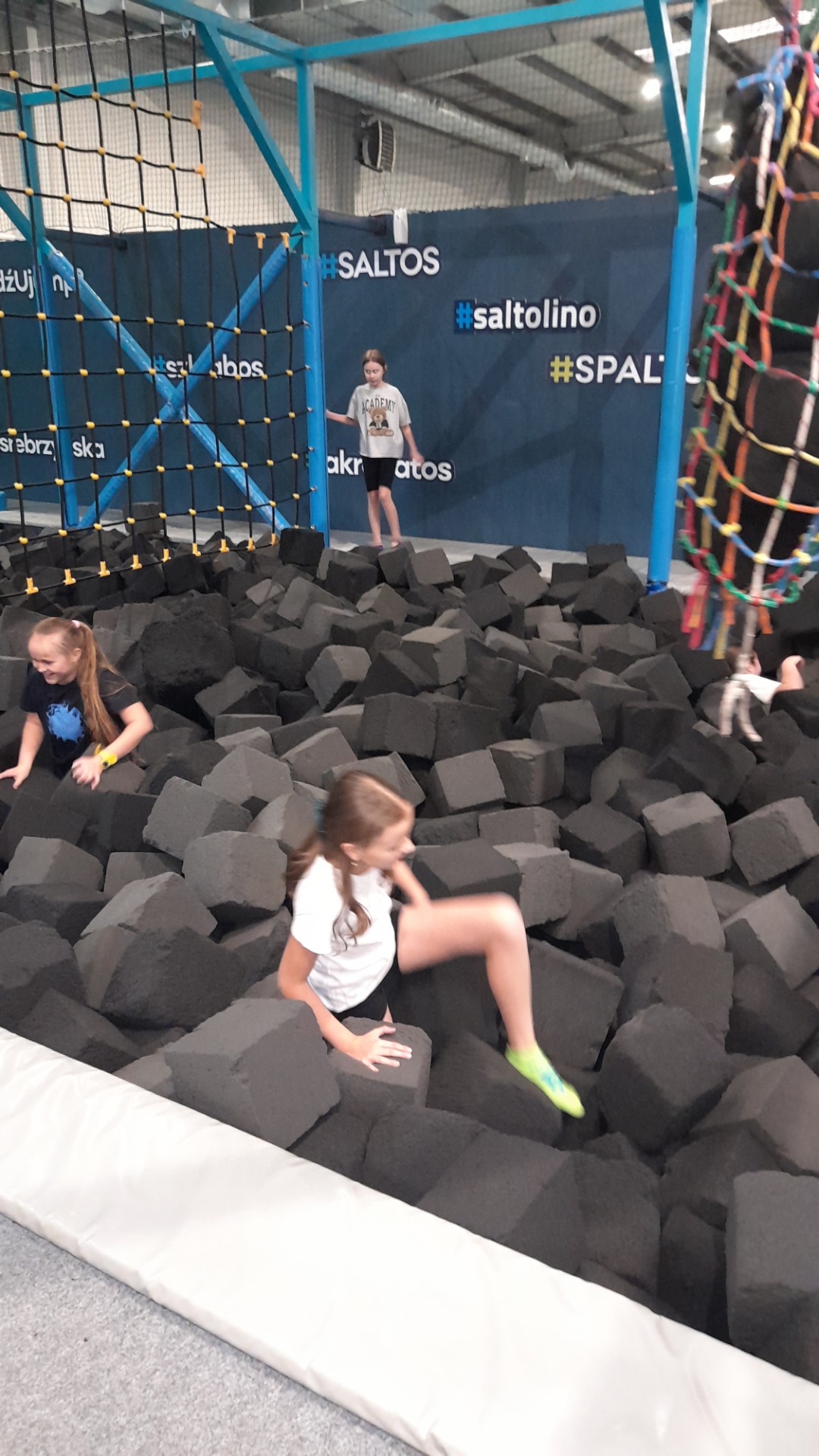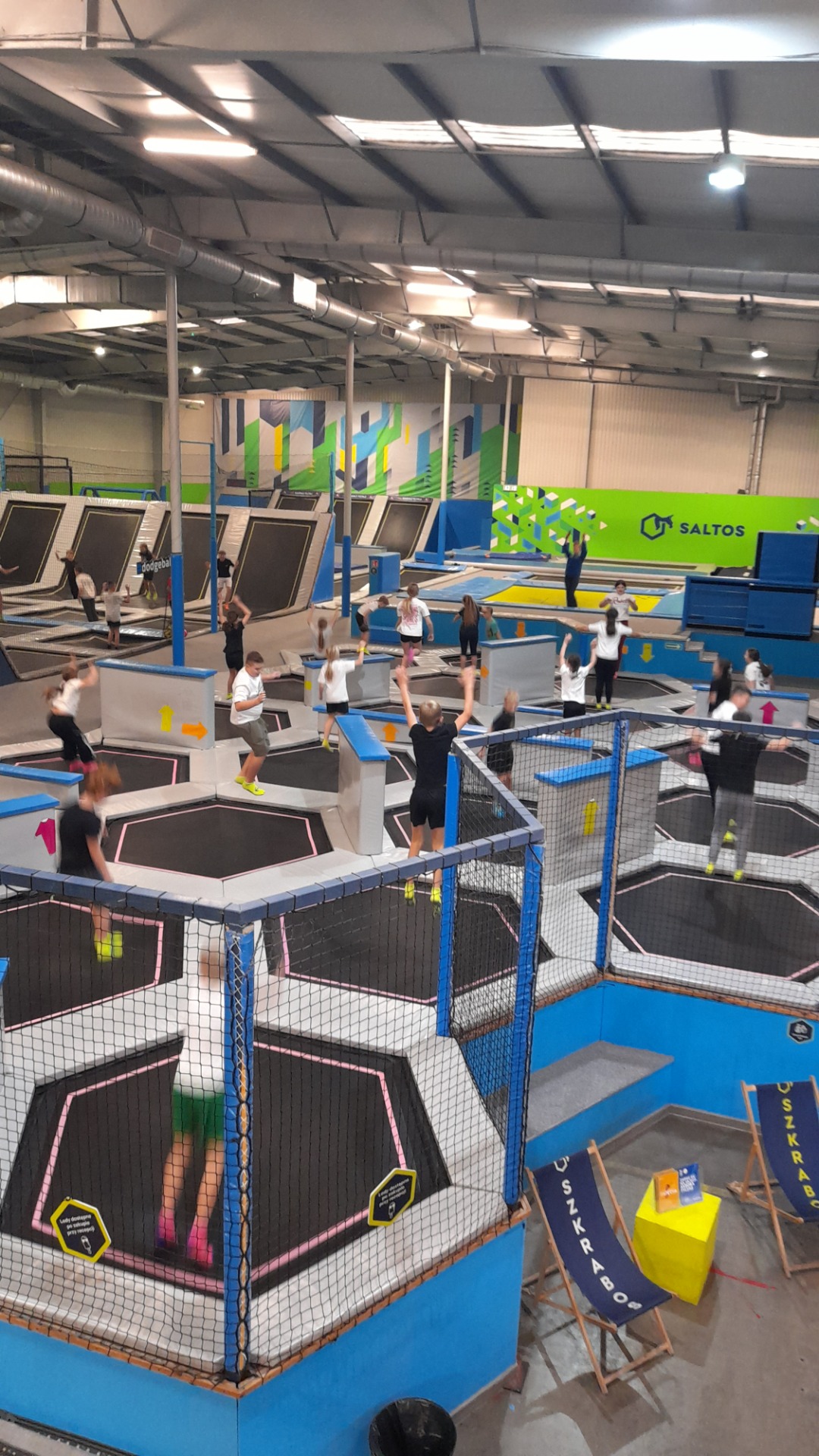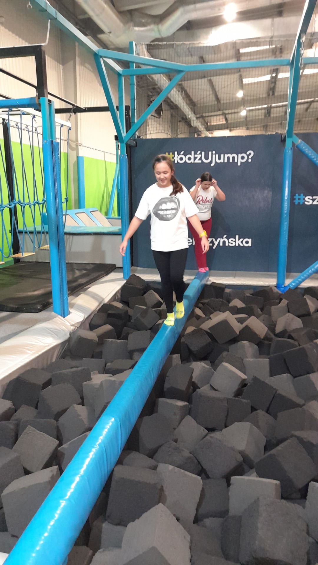 Kolejną atrakcją wycieczki był pobyt w parku trampolin z matami gimnastycznymi i basenem z gąbkami. Najpierw uczniowie przeszli szkolenie z zakresu bezpieczeństwa i techniki skoków. Następnie po profesjonalnej rozgrzewce pod okiem instruktorów korzystali z szeregu atrakcji. Wszyscy z radością skakali na różne sposoby. Dużym zainteresowaniem cieszyły się skoki do basenu z gąbkami.