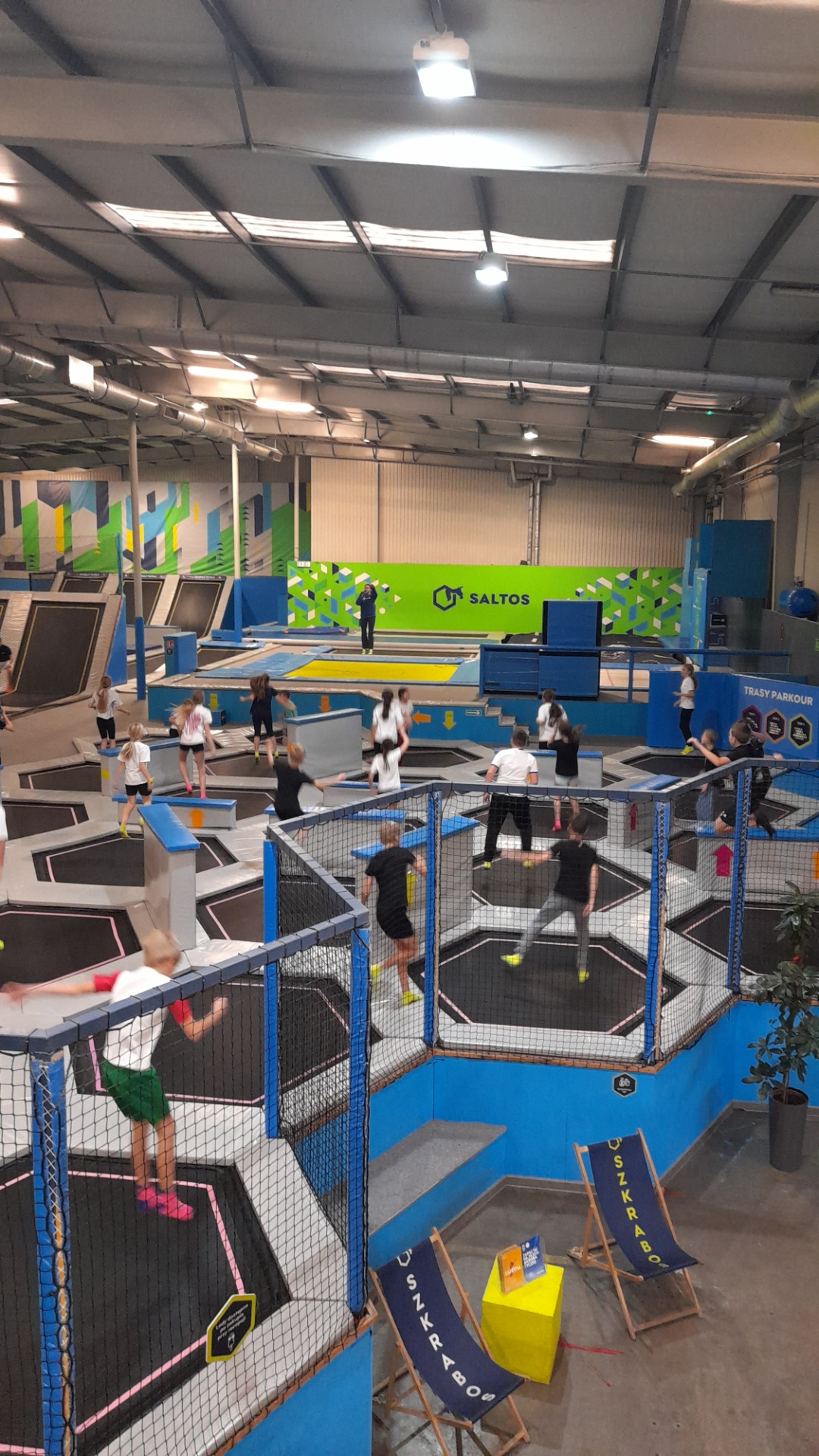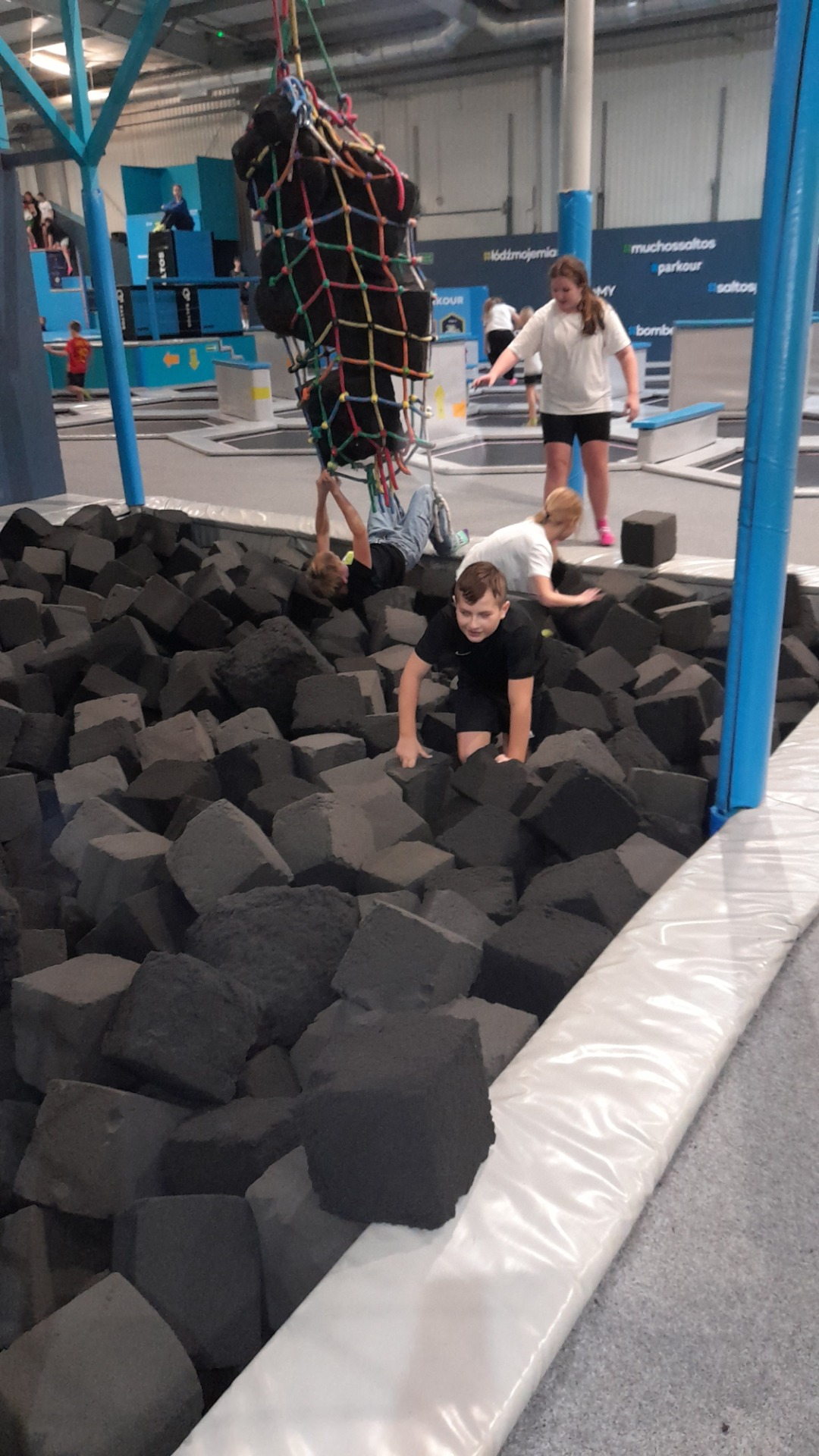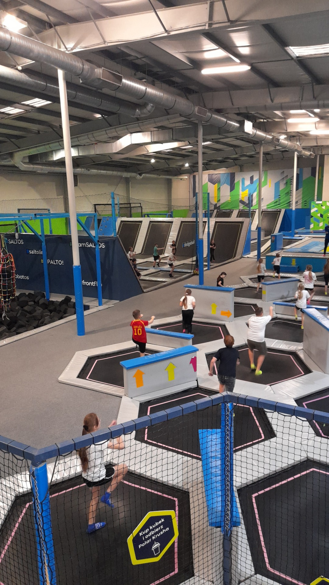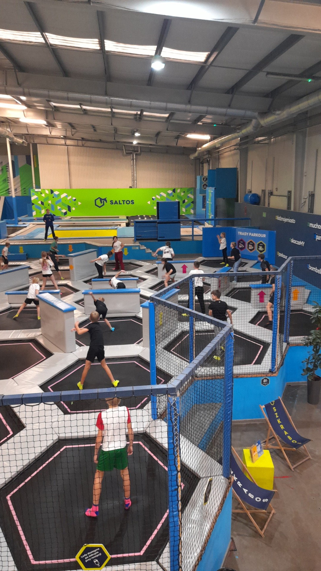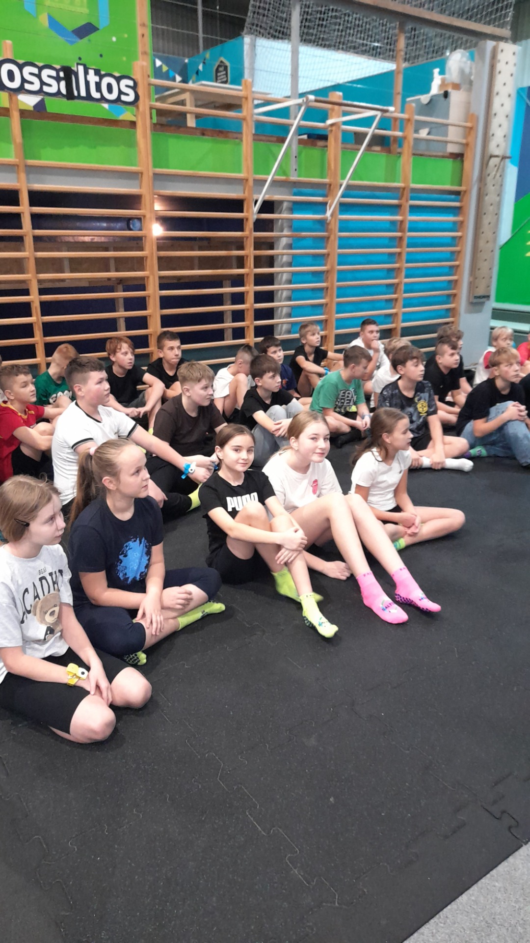 Kolejną atrakcją wycieczki był pobyt w parku trampolin z matami gimnastycznymi i basenem z gąbkami. Najpierw uczniowie przeszli szkolenie z zakresu bezpieczeństwa i techniki skoków. Następnie po profesjonalnej rozgrzewce pod okiem instruktorów korzystali z szeregu atrakcji. Wszyscy z radością skakali na różne sposoby. Dużym zainteresowaniem cieszyły się skoki do basenu z gąbkami.