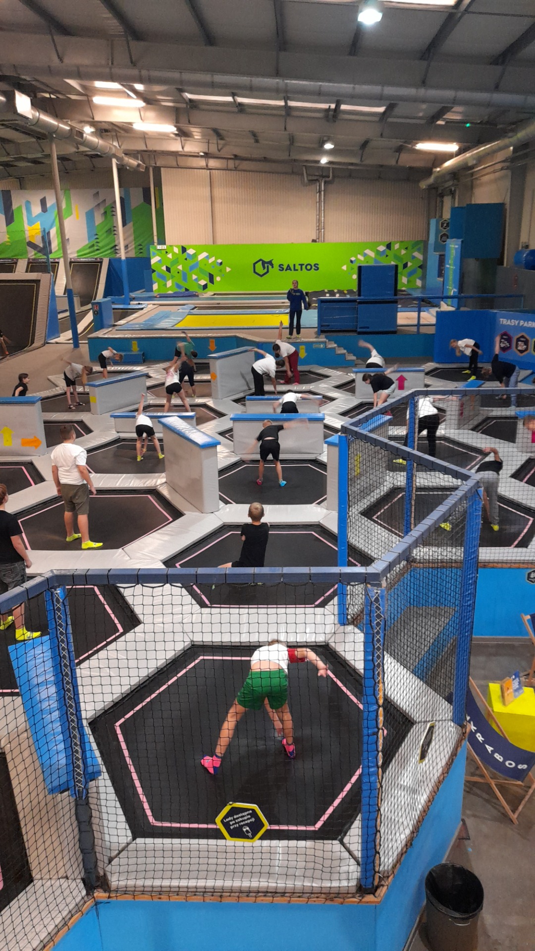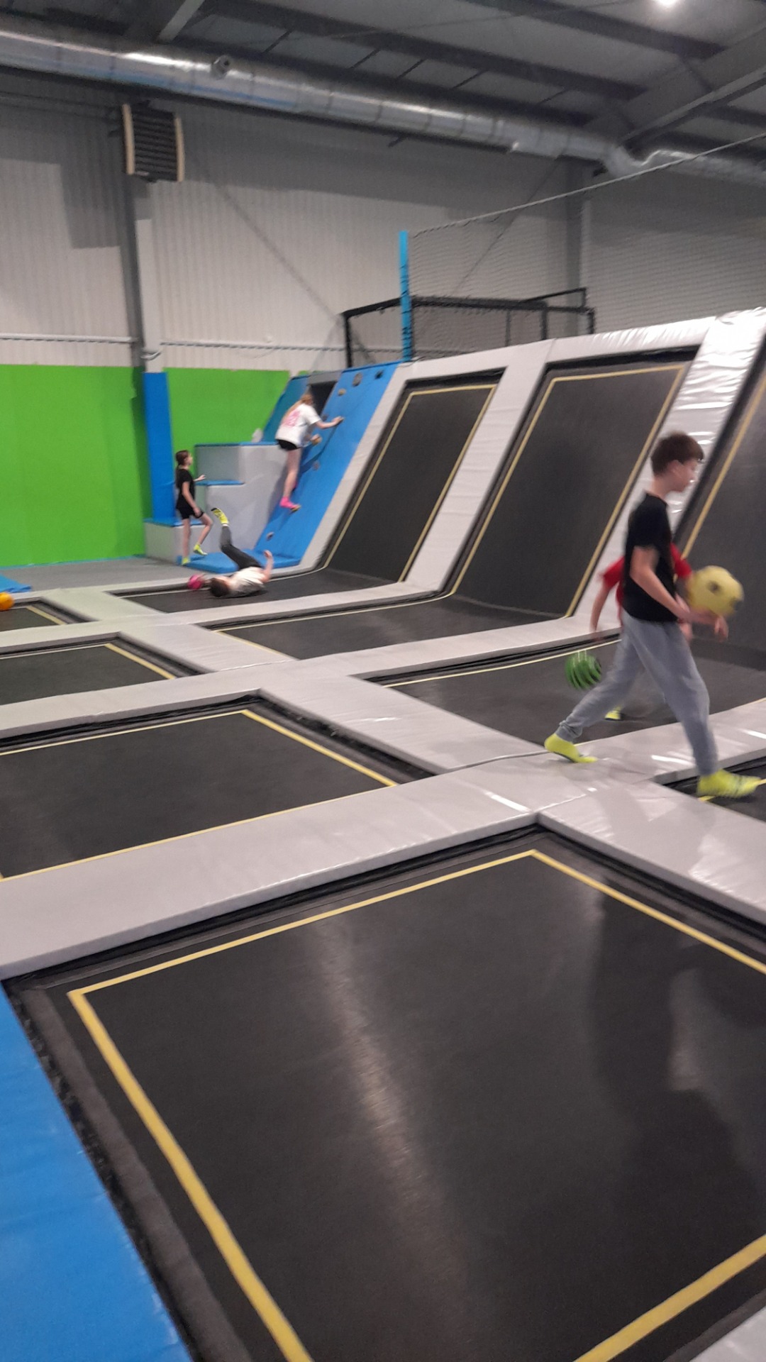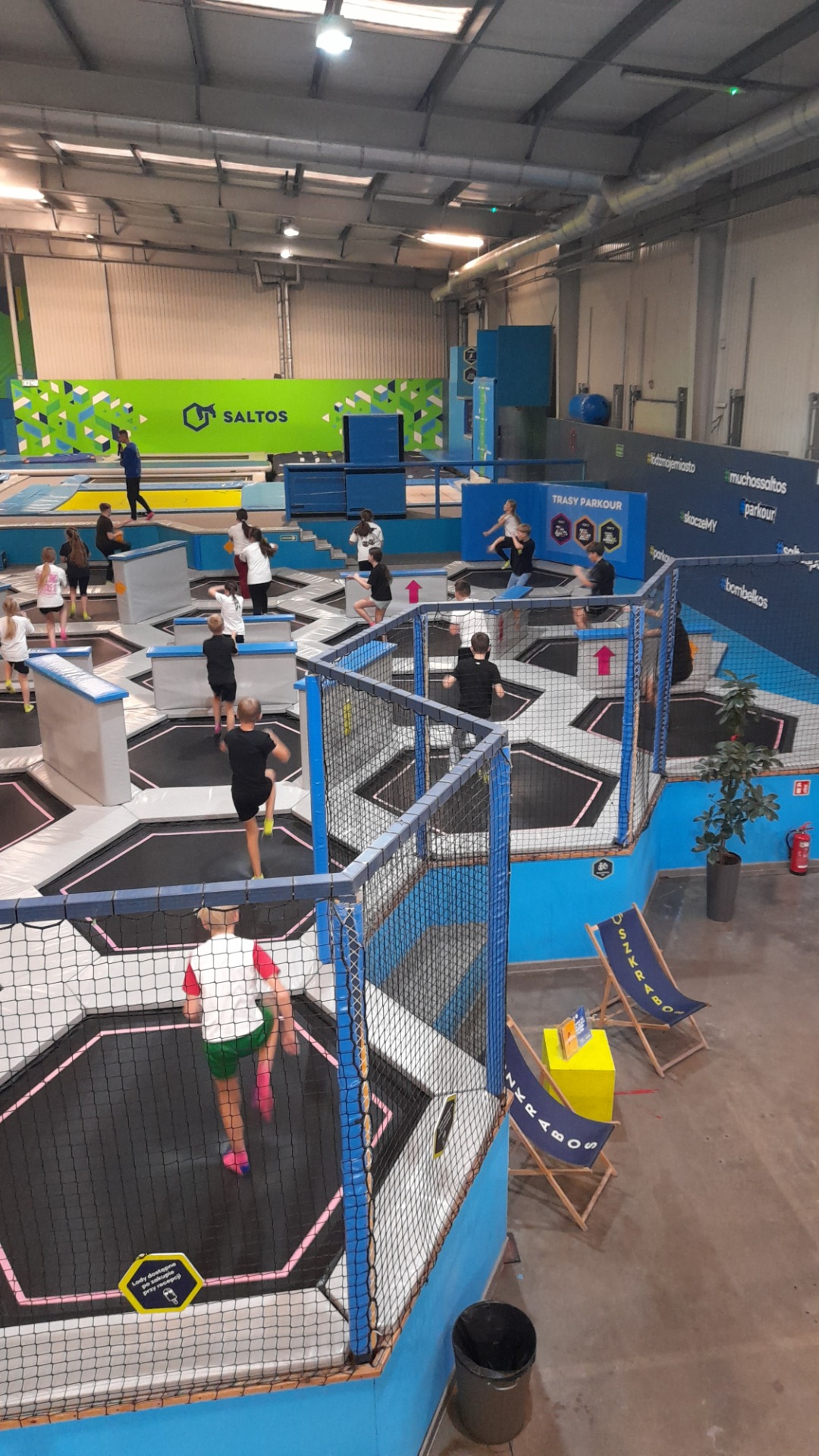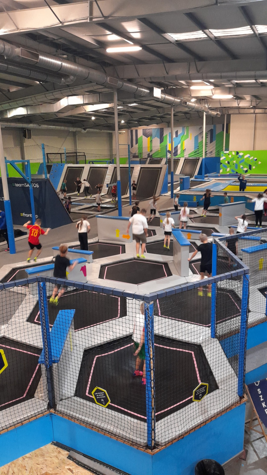 Kolejną atrakcją wycieczki był pobyt w parku trampolin z matami gimnastycznymi i basenem z gąbkami. Najpierw uczniowie przeszli szkolenie z zakresu bezpieczeństwa i techniki skoków. Następnie po profesjonalnej rozgrzewce pod okiem instruktorów korzystali z szeregu atrakcji. Wszyscy z radością skakali na różne sposoby. Dużym zainteresowaniem cieszyły się skoki do basenu z gąbkami.