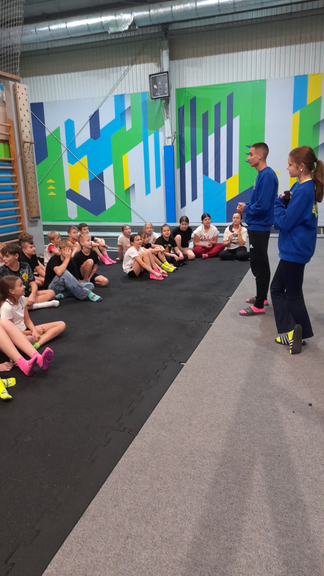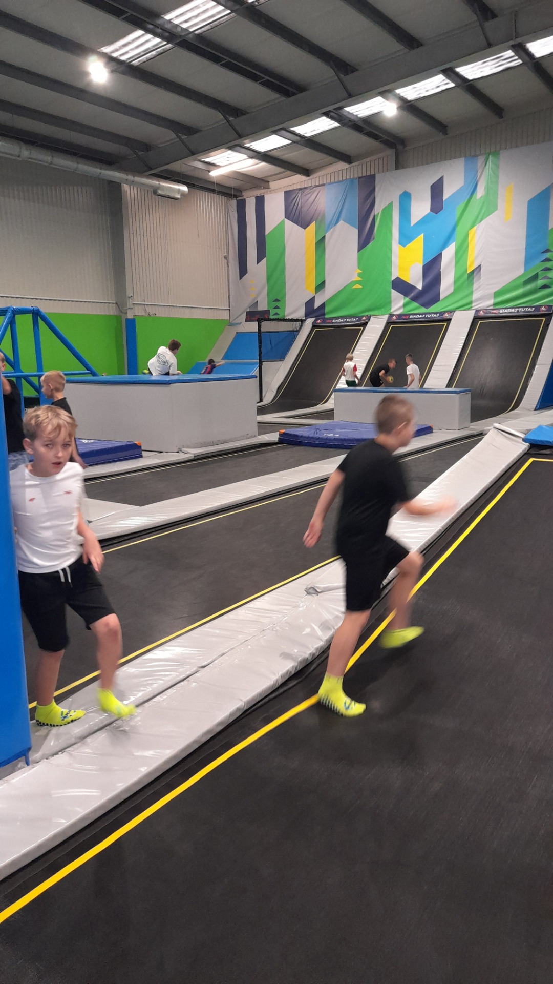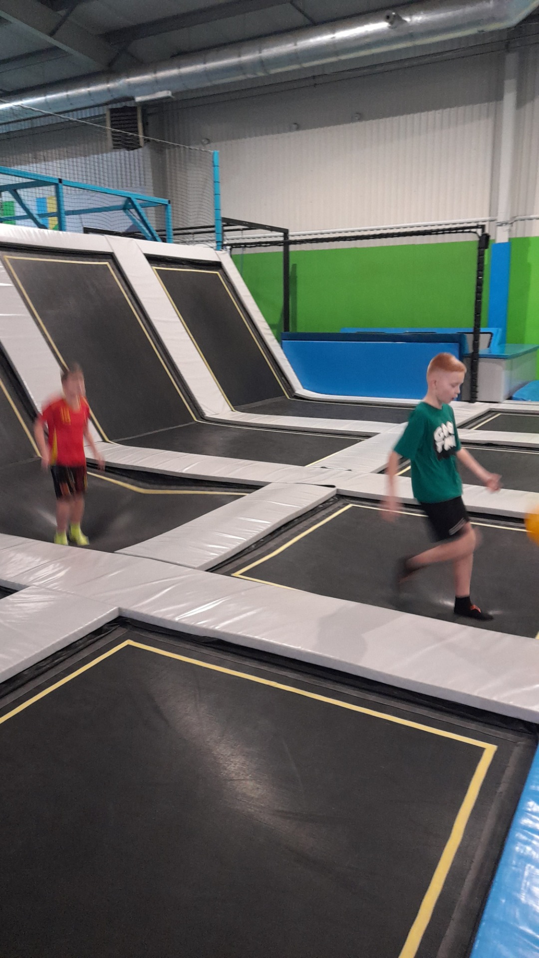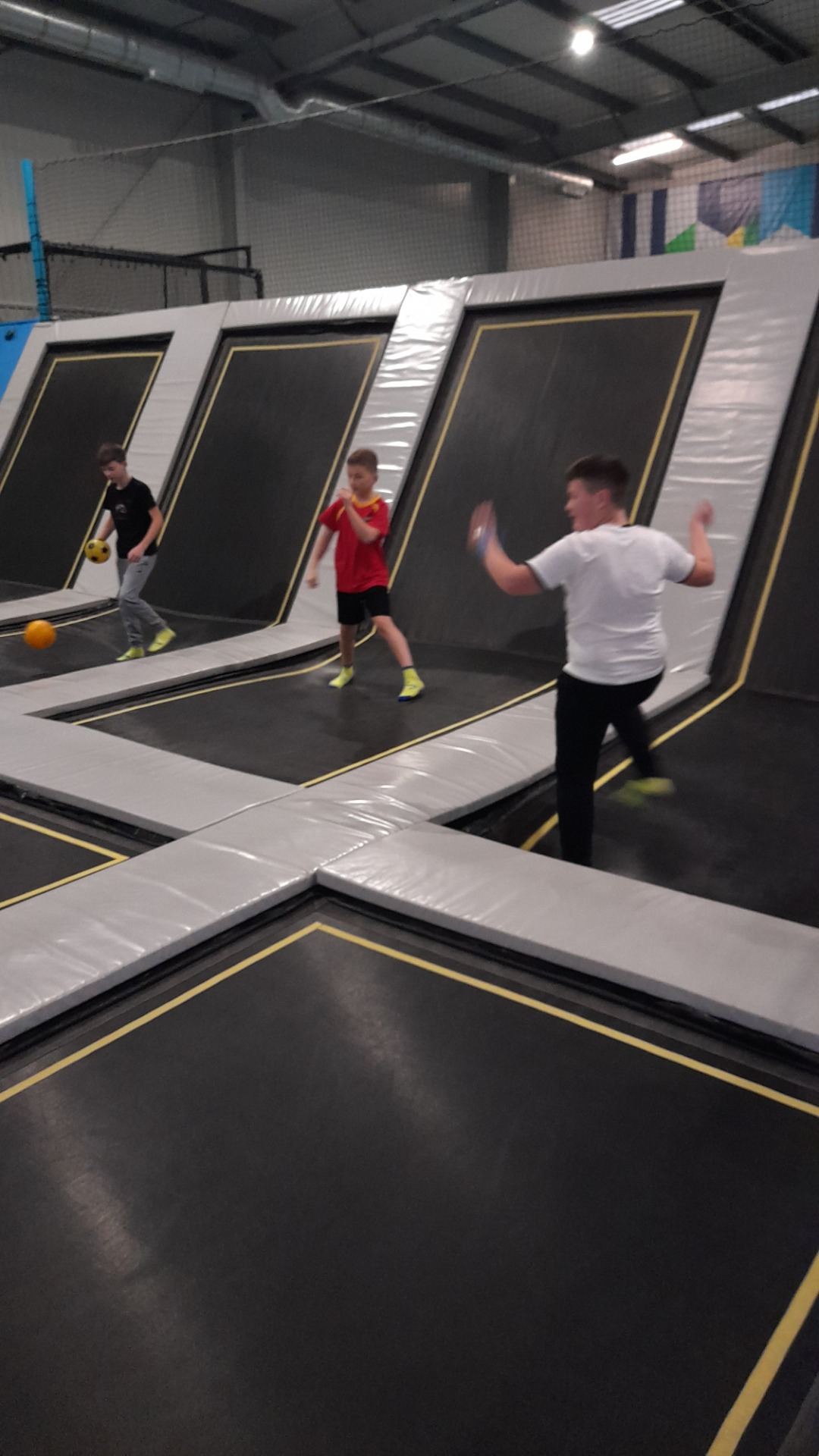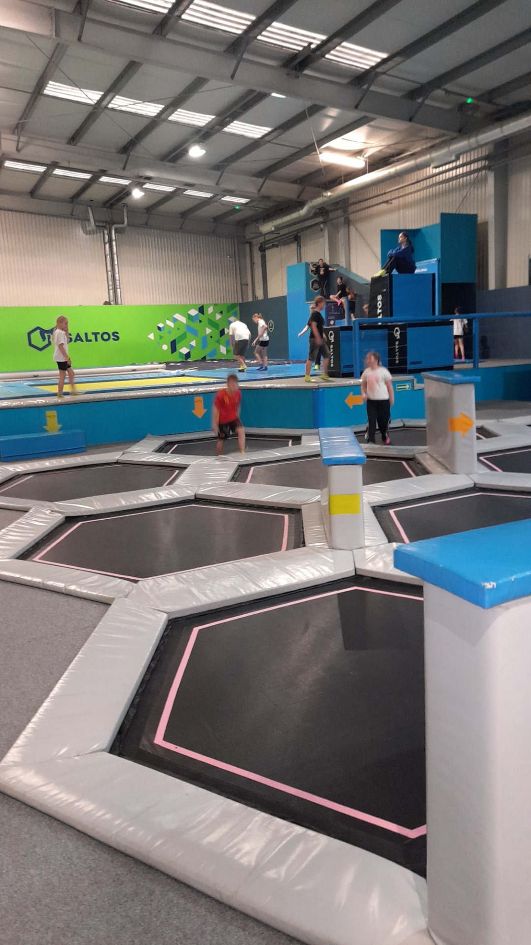 Kolejną atrakcją wycieczki był pobyt w parku trampolin z matami gimnastycznymi i basenem z gąbkami. Najpierw uczniowie przeszli szkolenie z zakresu bezpieczeństwa i techniki skoków. Następnie po profesjonalnej rozgrzewce pod okiem instruktorów korzystali z szeregu atrakcji. Wszyscy z radością skakali na różne sposoby. Dużym zainteresowaniem cieszyły się skoki do basenu z gąbkami.