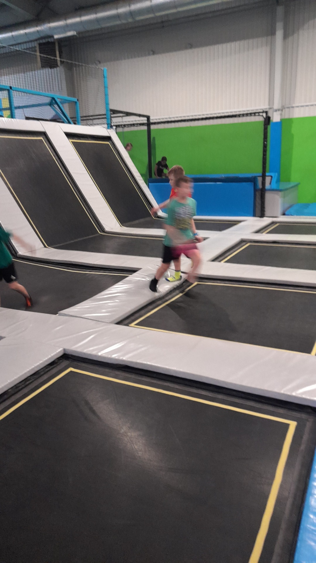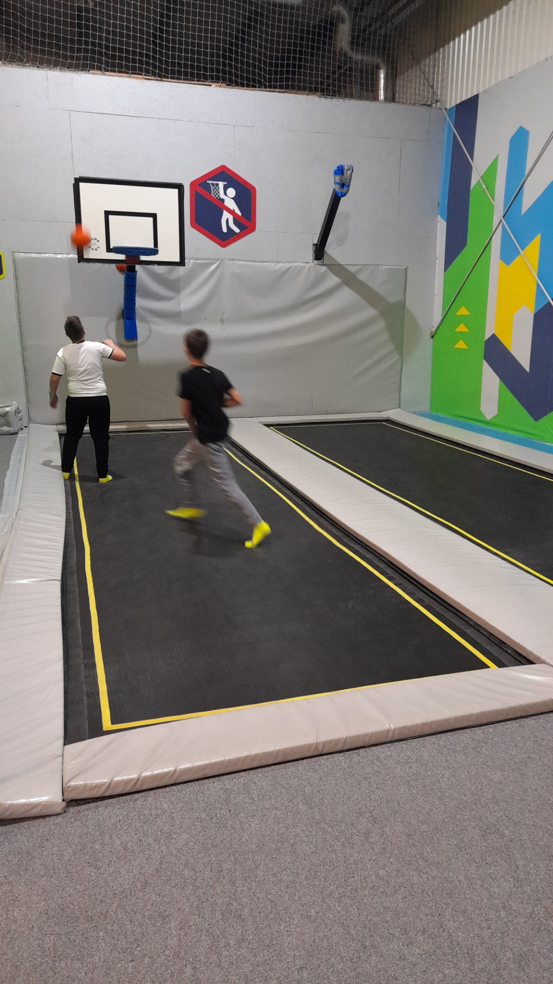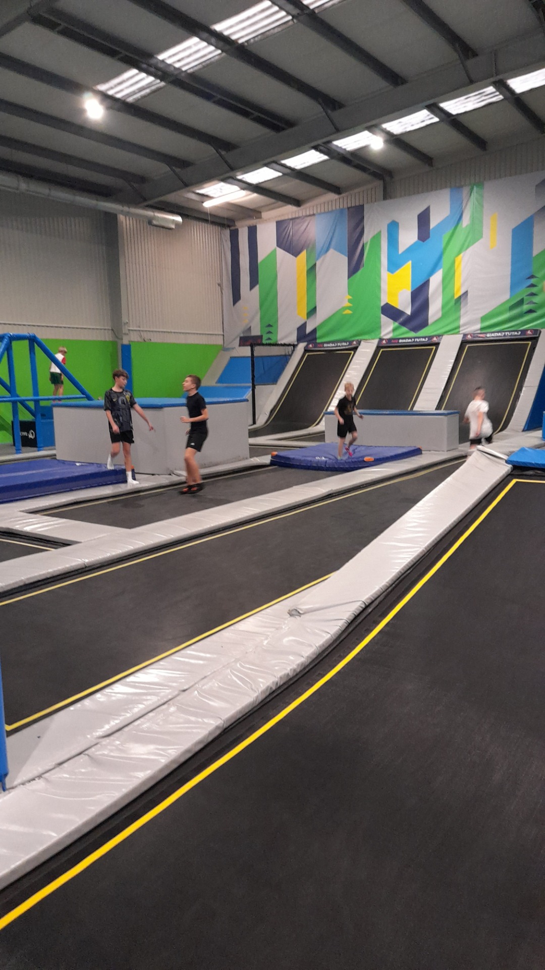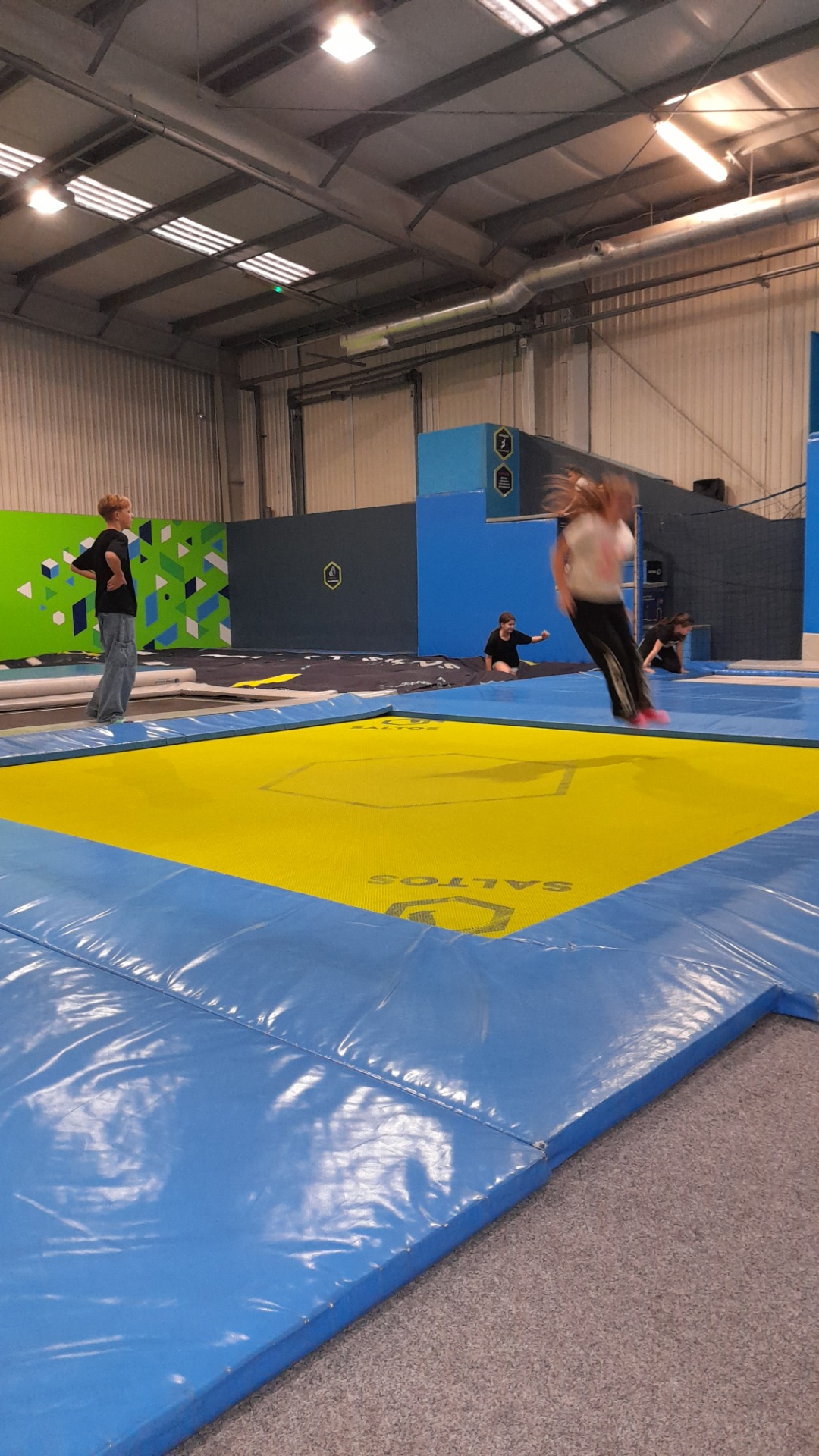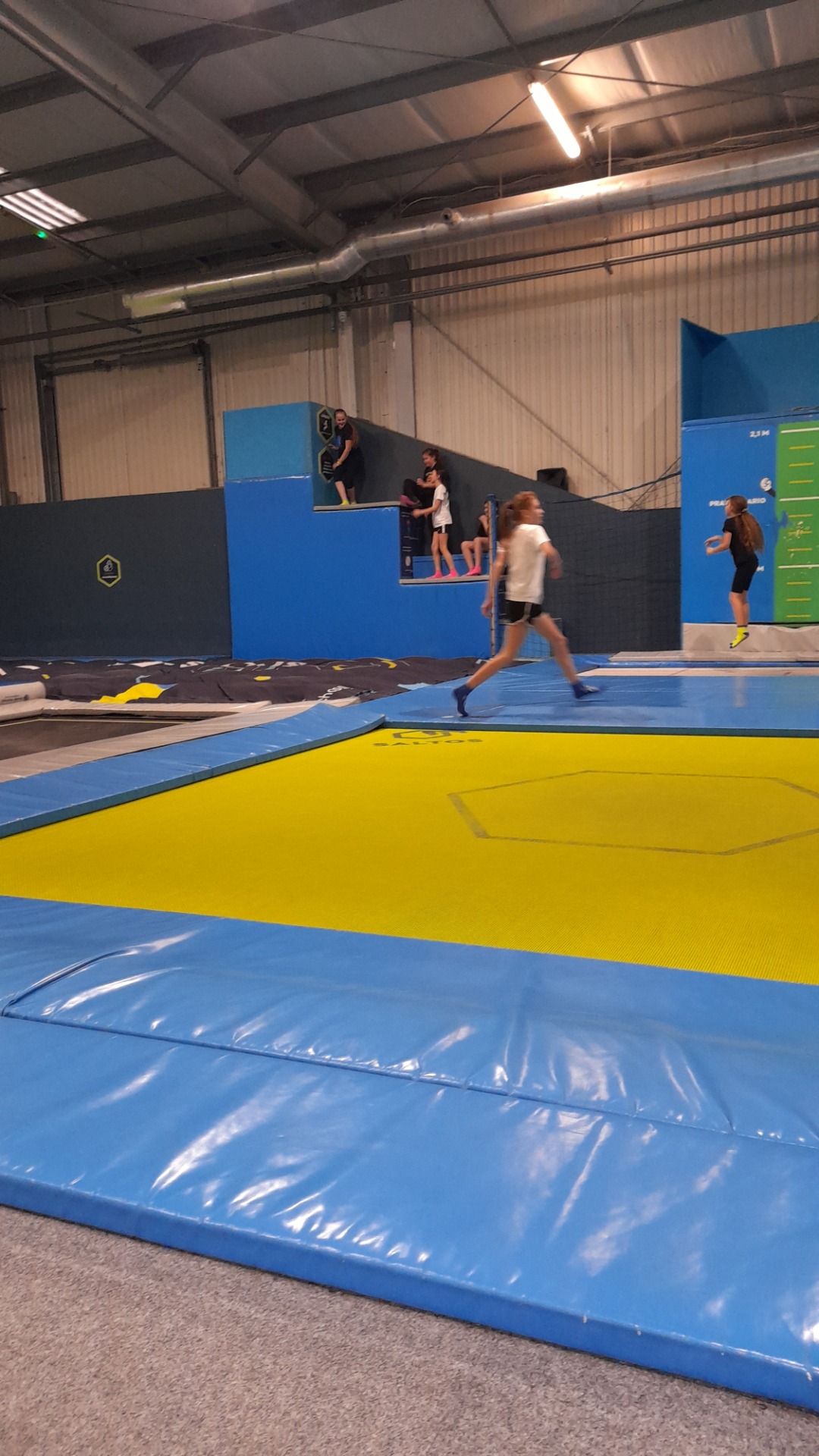 Kolejną atrakcją wycieczki był pobyt w parku trampolin z matami gimnastycznymi i basenem z gąbkami. Najpierw uczniowie przeszli szkolenie z zakresu bezpieczeństwa i techniki skoków. Następnie po profesjonalnej rozgrzewce pod okiem instruktorów korzystali z szeregu atrakcji. Wszyscy z radością skakali na różne sposoby. Dużym zainteresowaniem cieszyły się skoki do basenu z gąbkami.