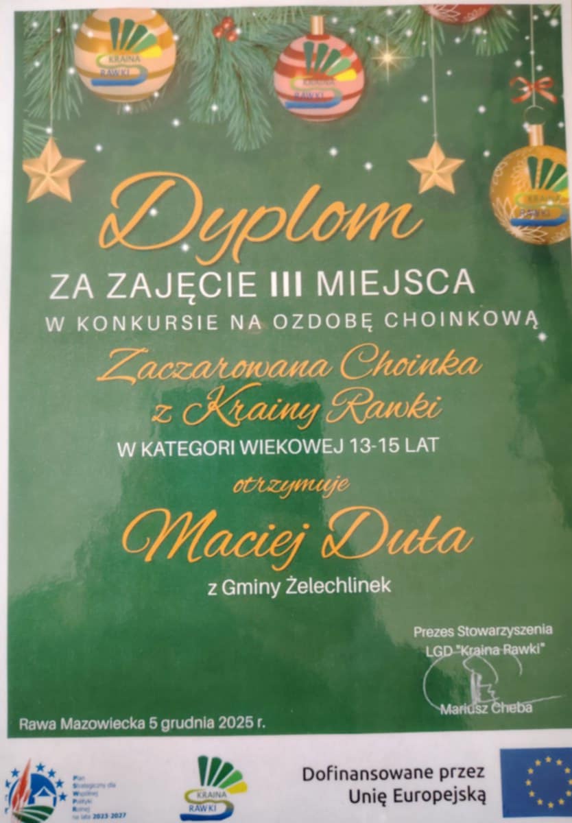 Miło nam poinformować, iż praca plastyczna naszego ucznia Macieja Duły biorąca udział w konkursie świątecznym na najpiękniejszą ozdobę choinkową inspirowaną logo LGD „Kraina Rawki” zajęła III miejsce w kategorii wiekowej 13-15 lat.
