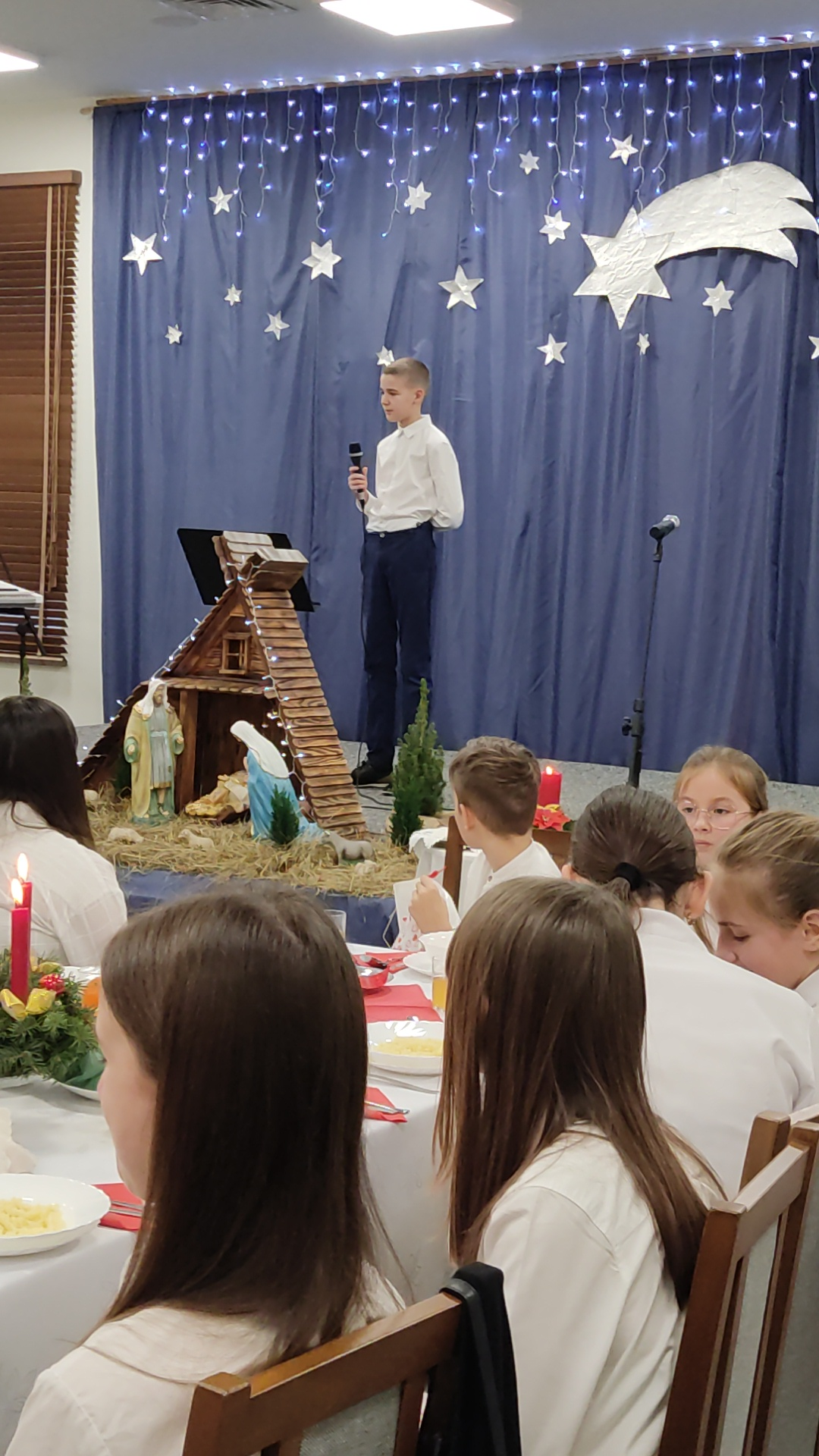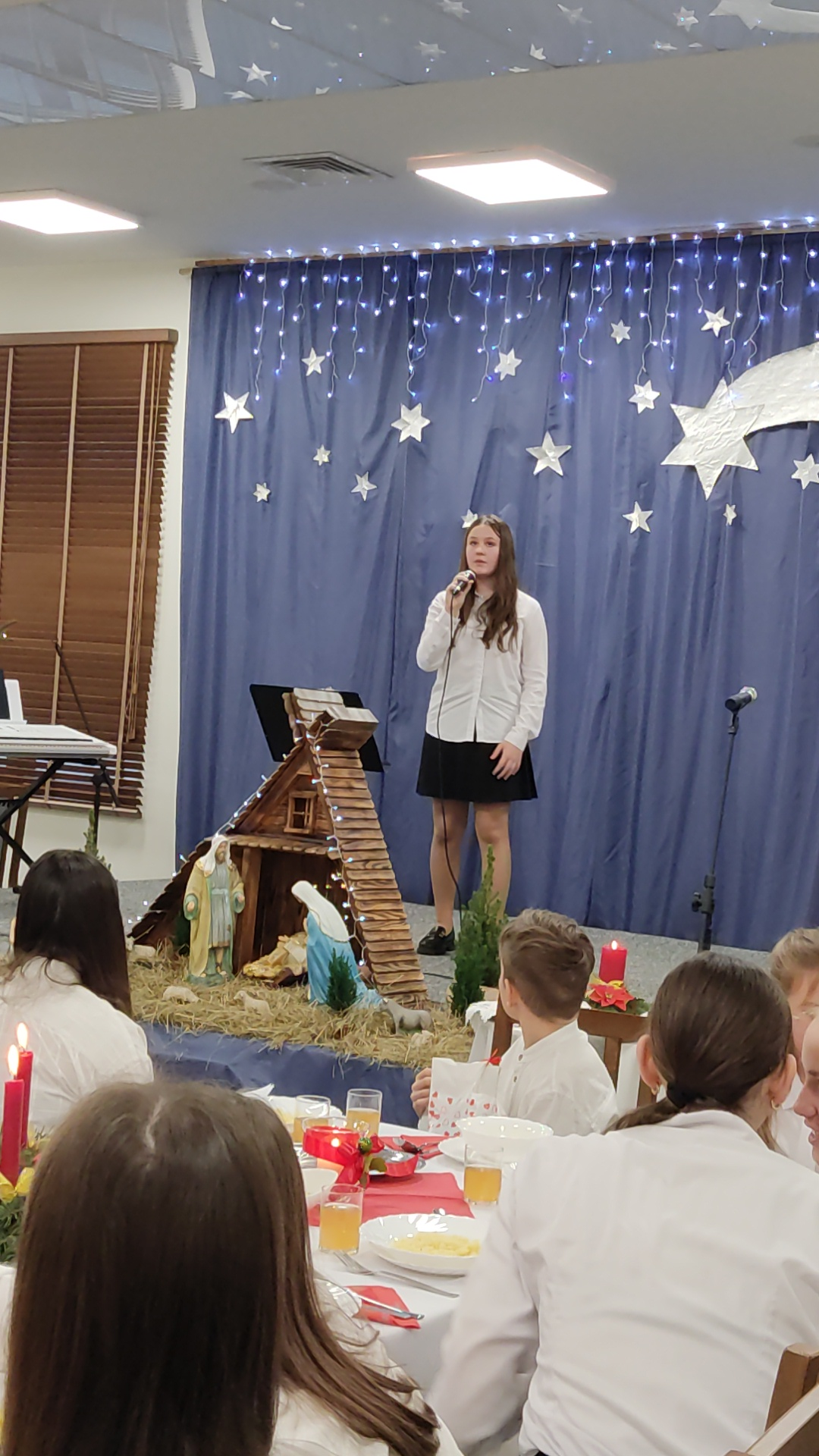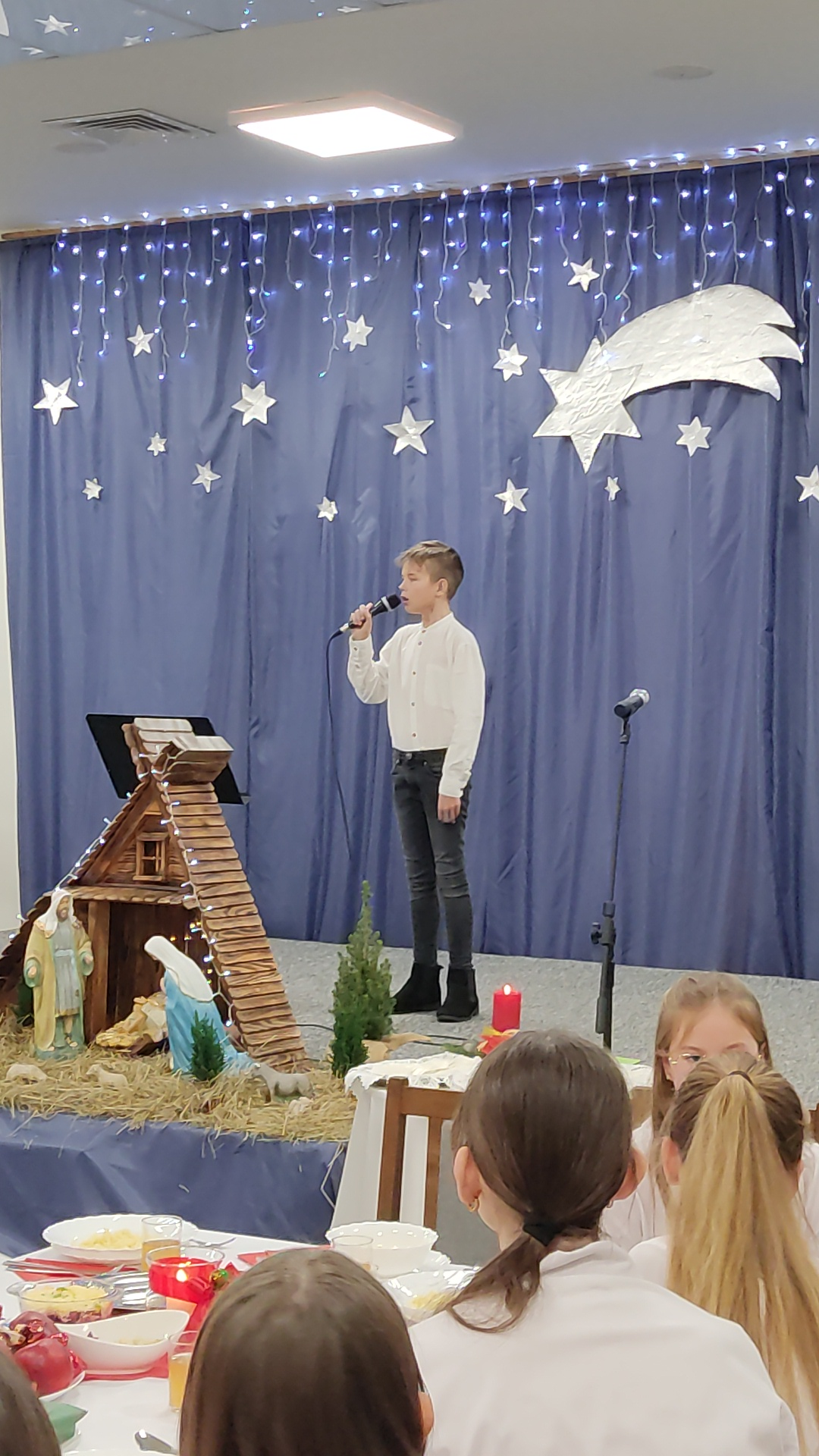 W dniu 14.12.2025 r. uczniowie naszej szkoły wystąpili na scenie Domu Inicjatywy Twórczych w Żelechlinku. Młodzi artyści zaprezentowali swoje umiejętności wokalne oraz instrumentalne podczas Środowiskowej Wieczerzy Wigilijnej. Wykonawcy spisali się na medal, pięknie zaśpiewali i zagrali kolędy. Wszyscy uczniowie włożyli wiele pracy w przygotowanie się do występu. Dzieci i młodzież do występu przygotował pan Daniel Strojczyk.