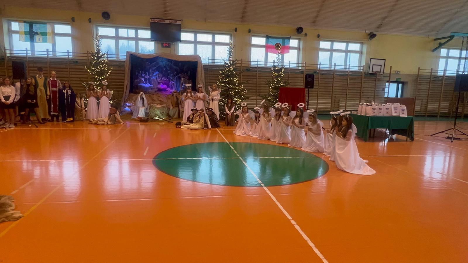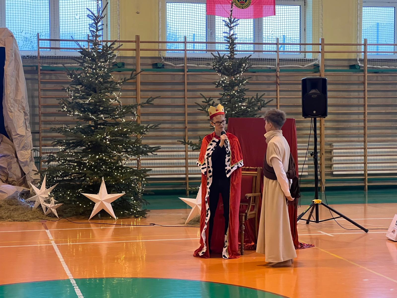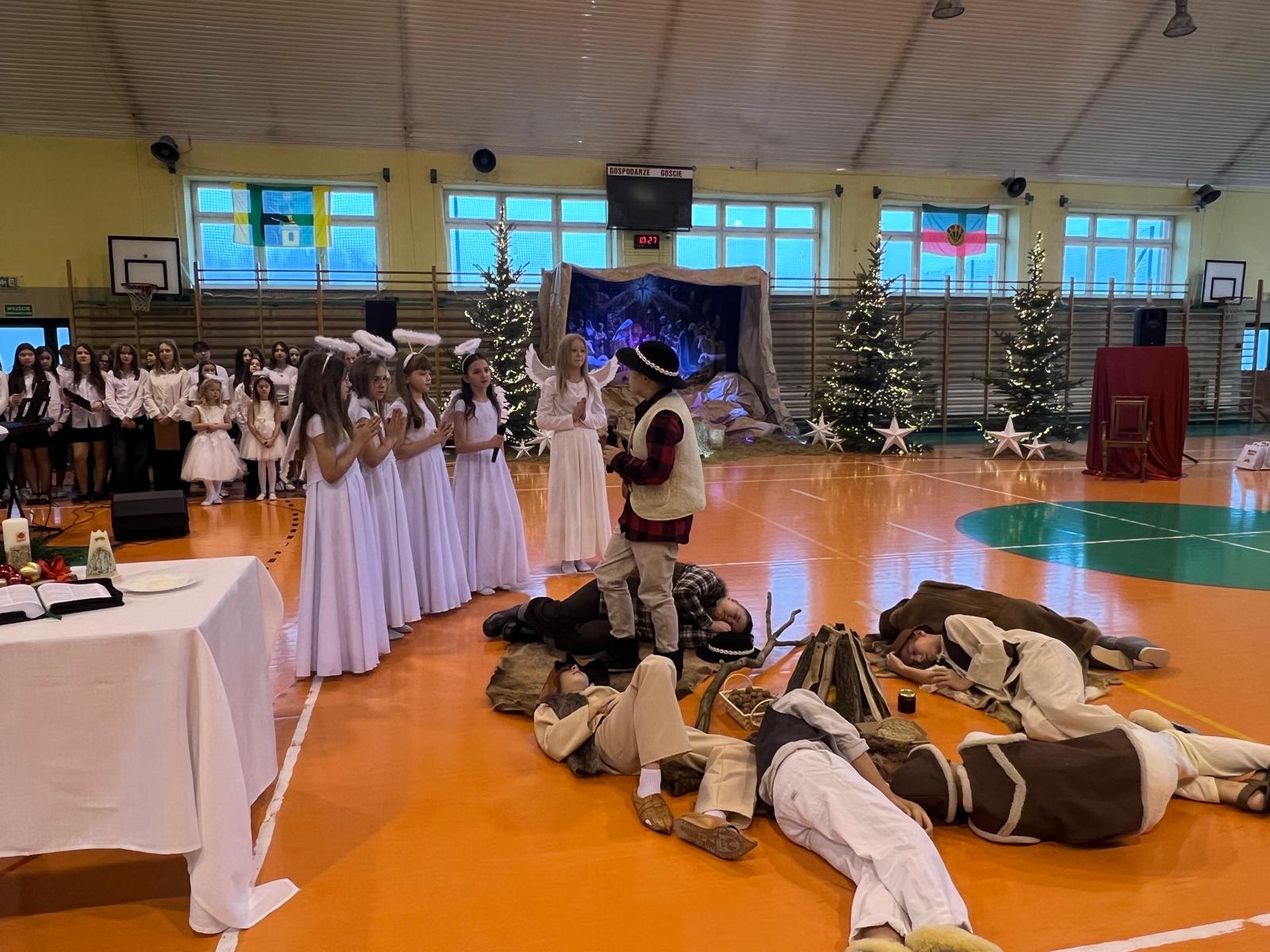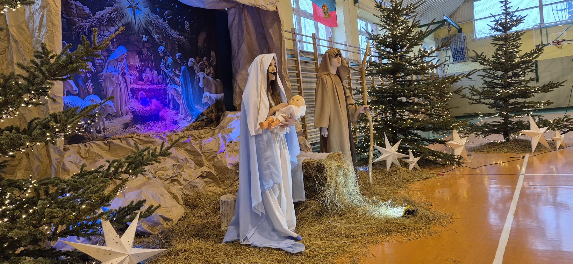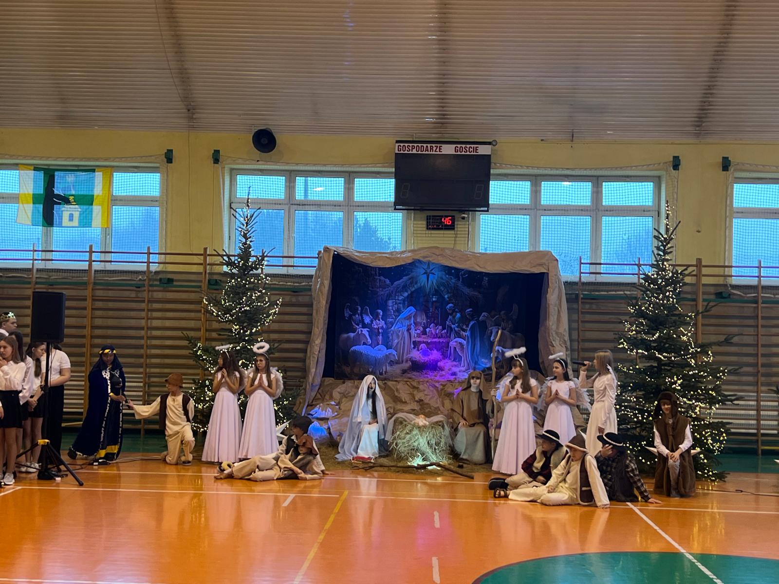 18 grudnia w naszej Szkole odbyły się tradycyjne jasełka przygotowane przez uczniów po opieką nauczycieli. Wydarzenie miało miejsce w hali sportowej, którą na tę okazję udekorowano świątecznymi ornamentami, gwiazdami oraz scenografią przedstawiającą Betlejem.