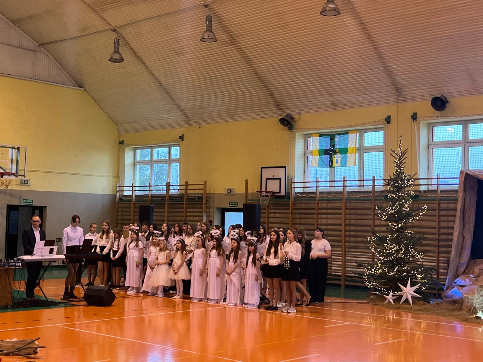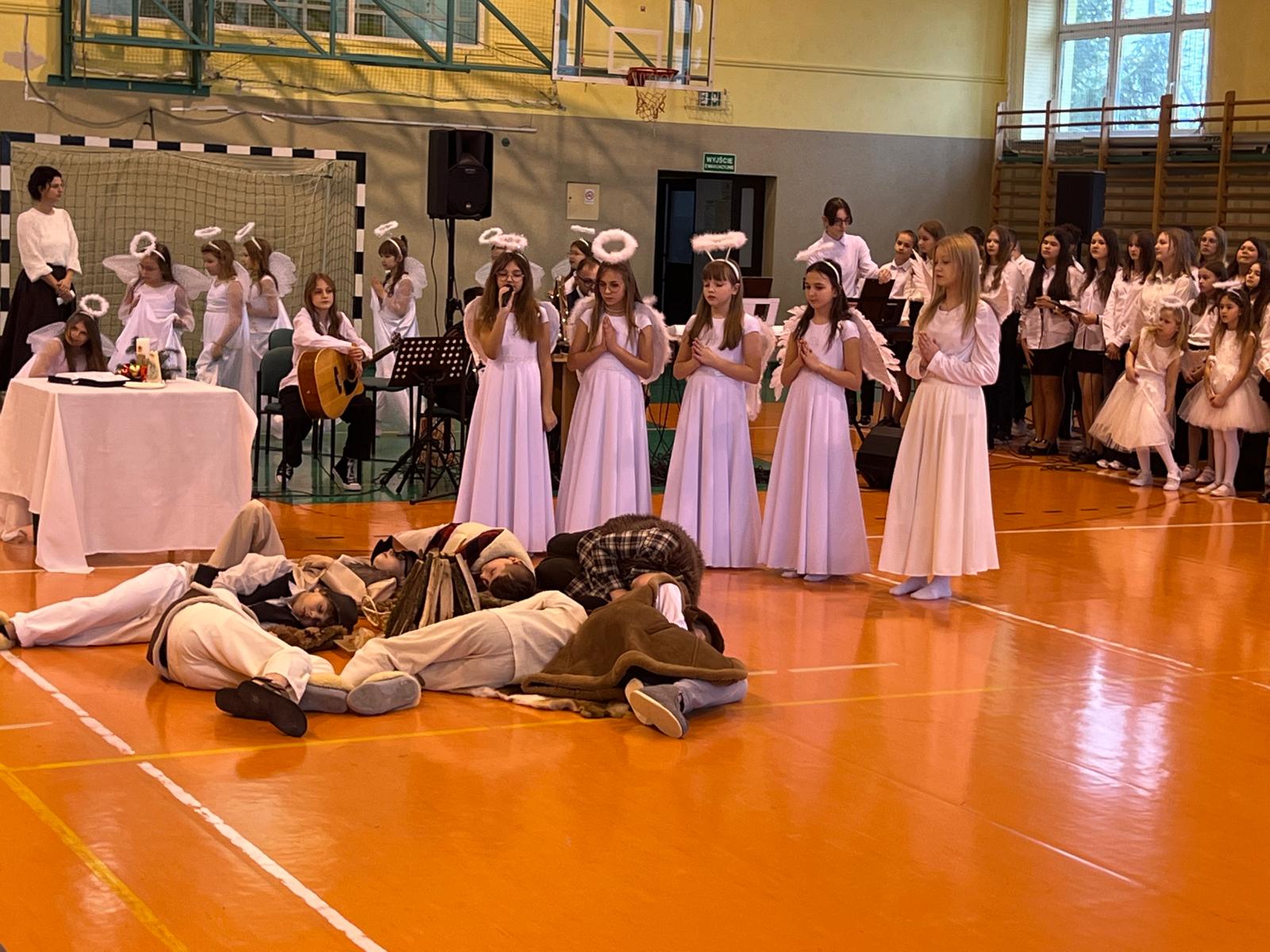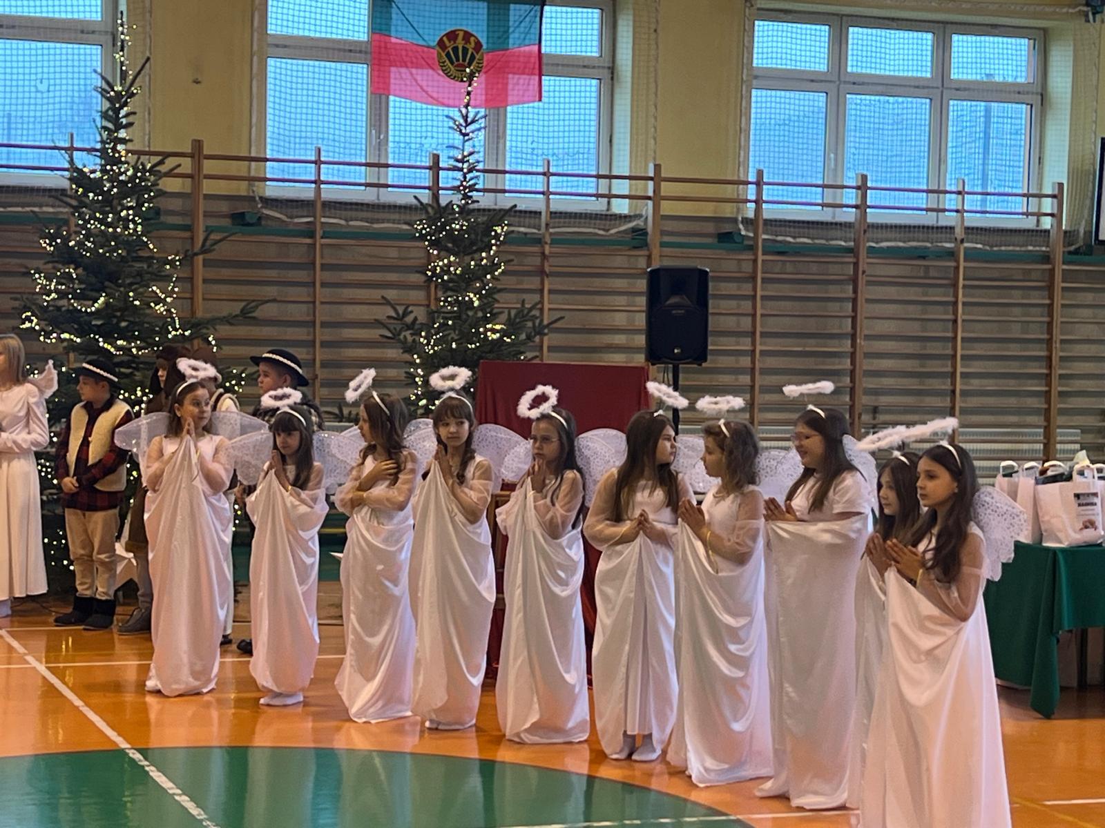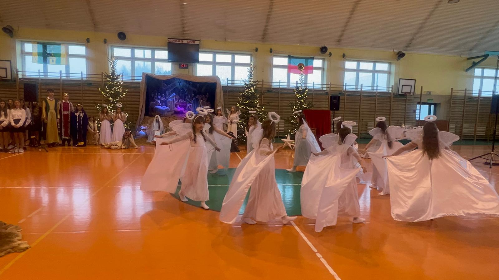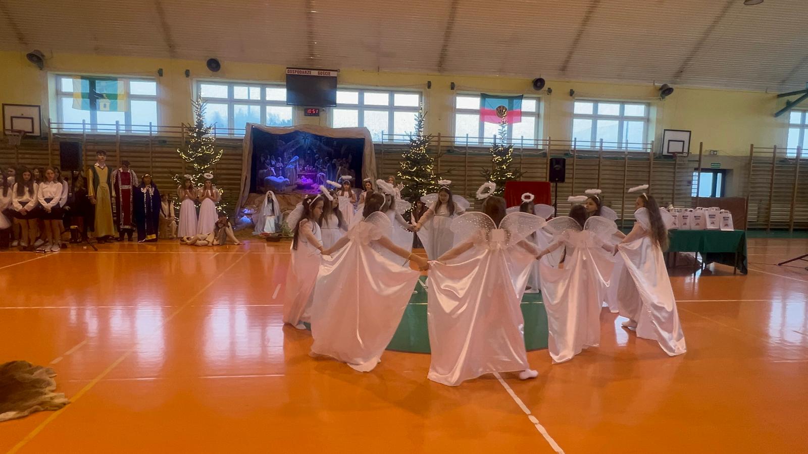 18 grudnia w naszej Szkole odbyły się tradycyjne jasełka przygotowane przez uczniów po opieką nauczycieli. Wydarzenie miało miejsce w hali sportowej, którą na tę okazję udekorowano świątecznymi ornamentami, gwiazdami oraz scenografią przedstawiającą Betlejem.