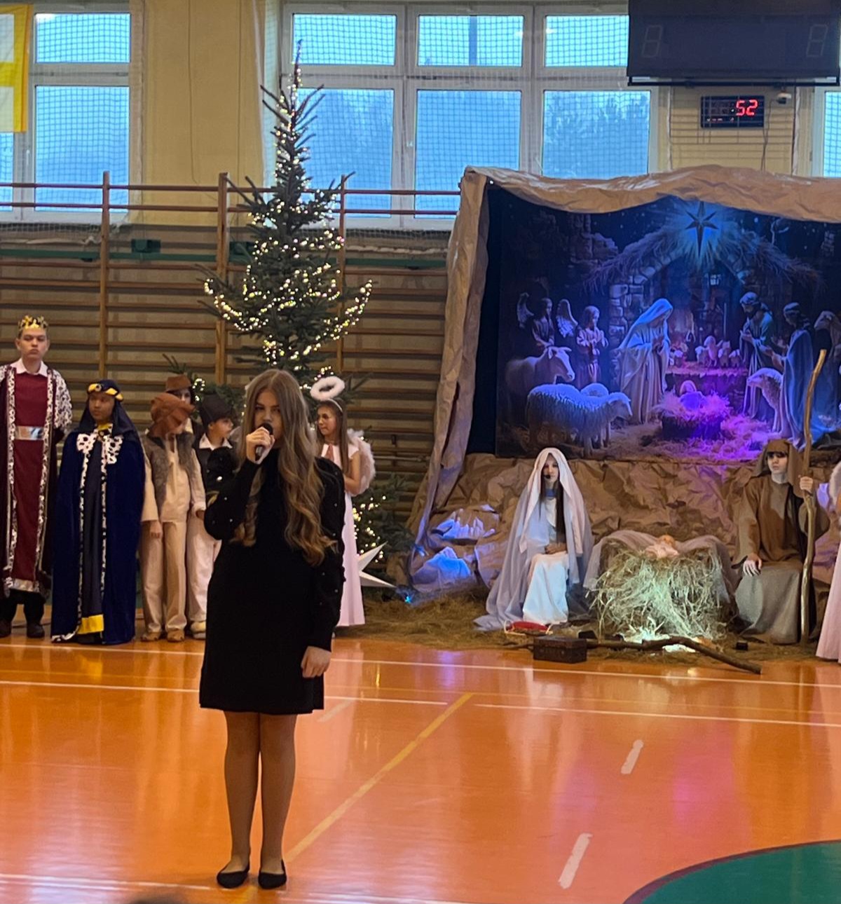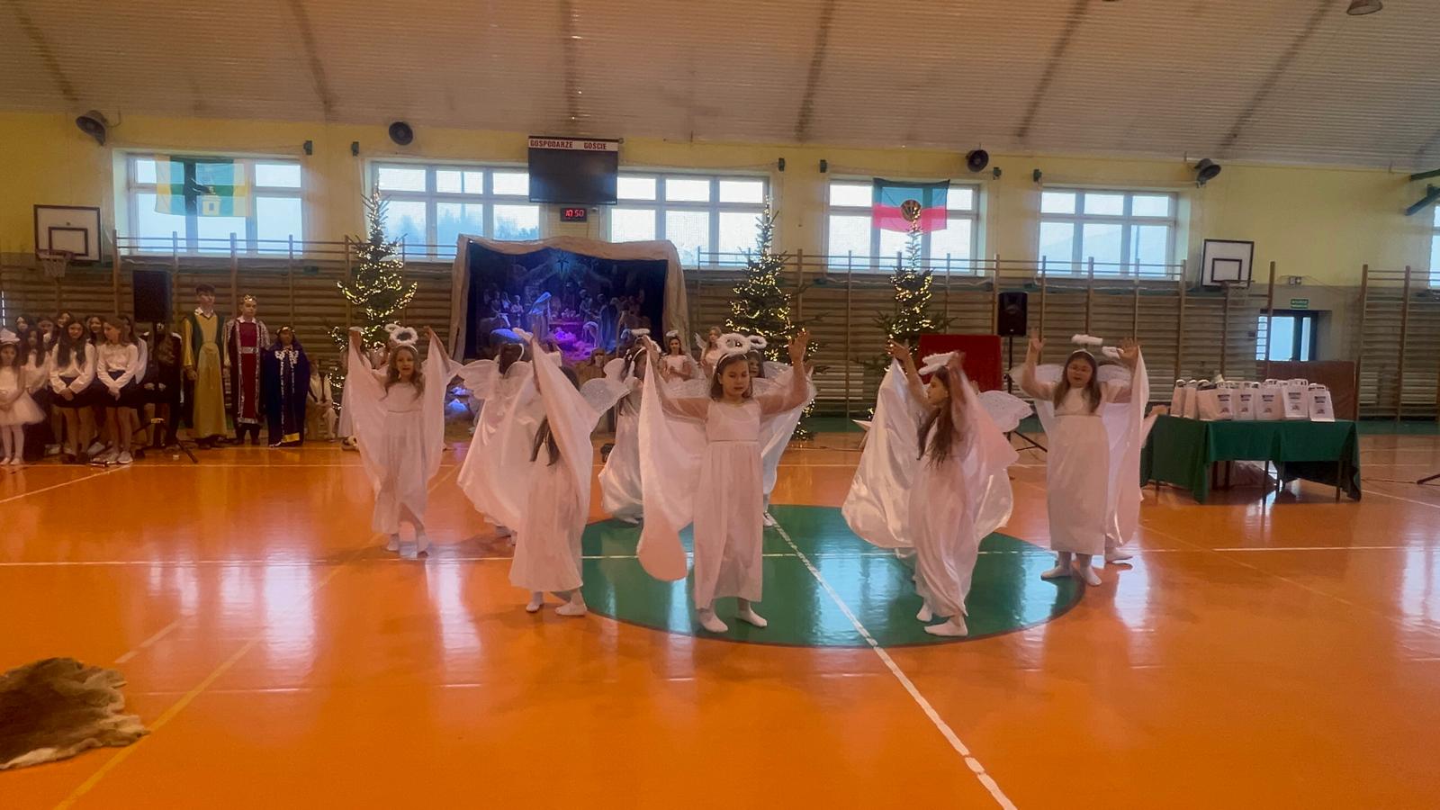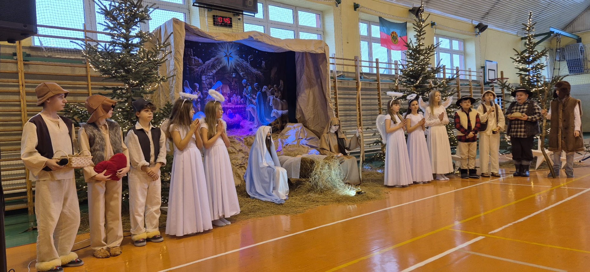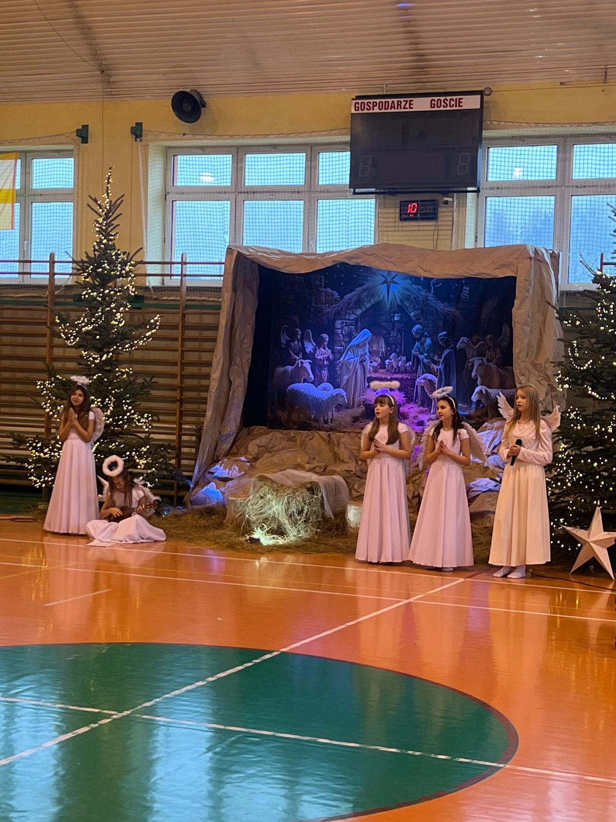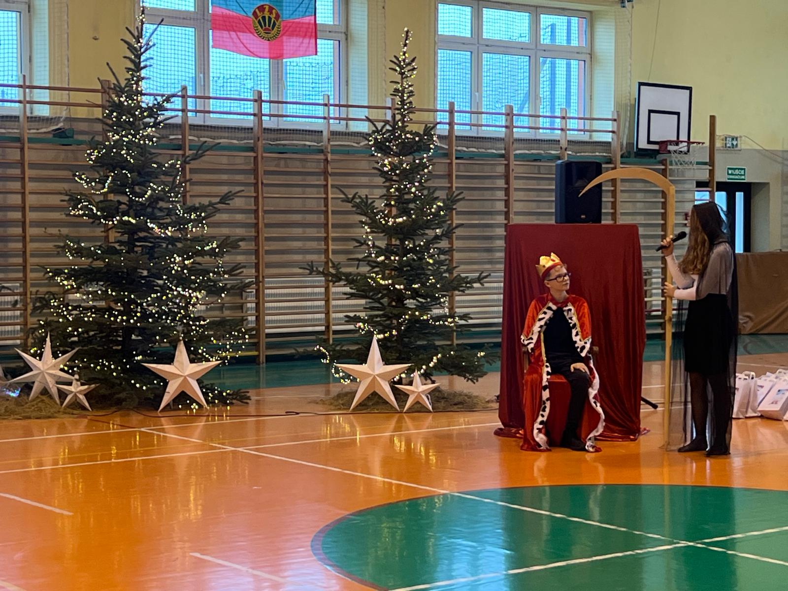 18 grudnia w naszej Szkole odbyły się tradycyjne jasełka przygotowane przez uczniów po opieką nauczycieli. Wydarzenie miało miejsce w hali sportowej, którą na tę okazję udekorowano świątecznymi ornamentami, gwiazdami oraz scenografią przedstawiającą Betlejem.