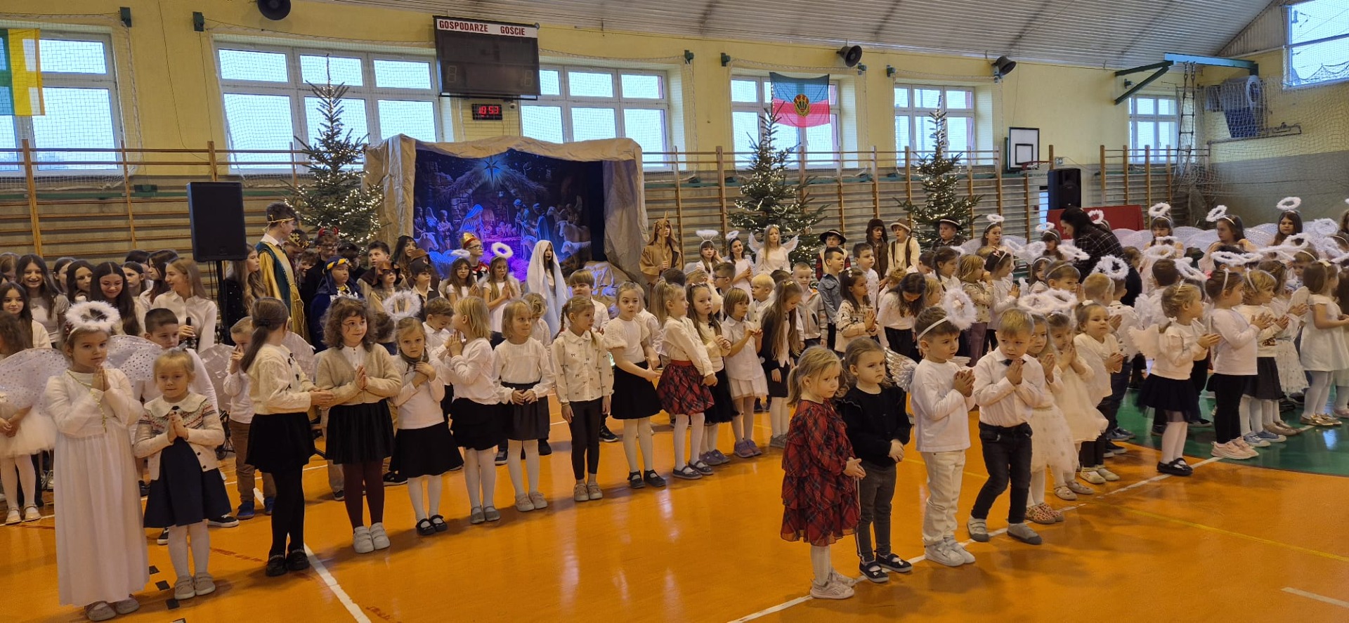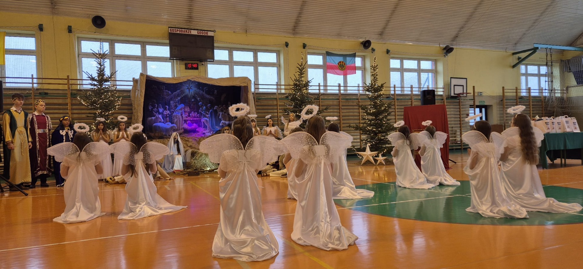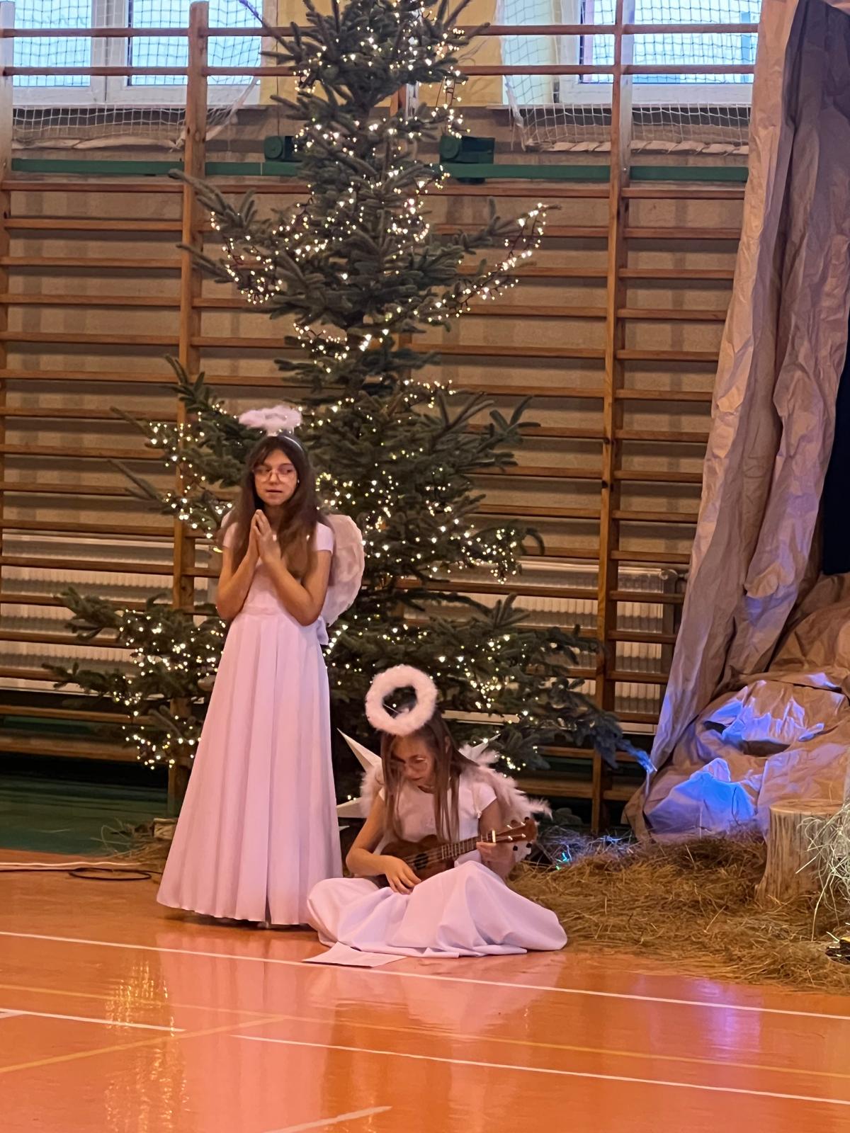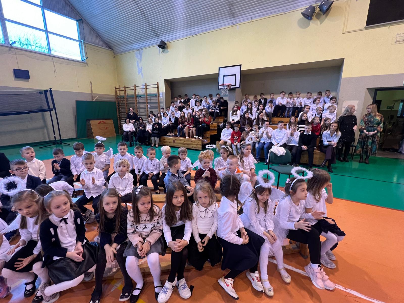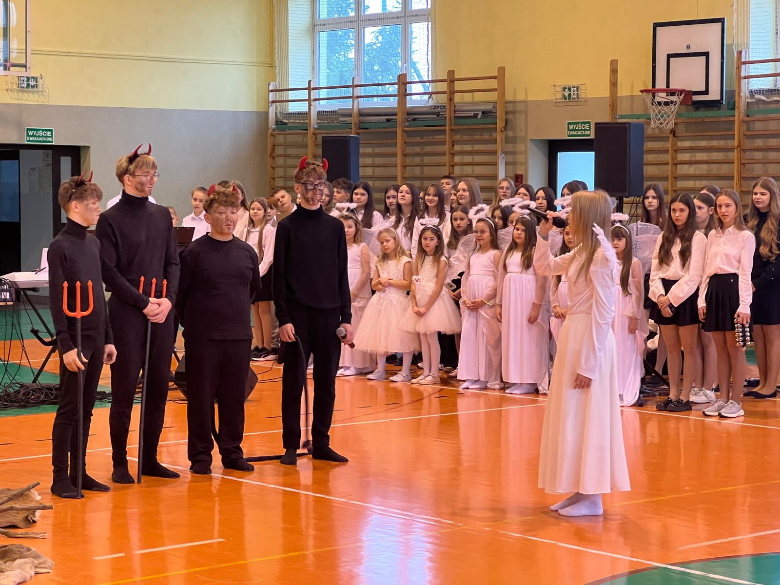 18 grudnia w naszej Szkole odbyły się tradycyjne jasełka przygotowane przez uczniów po opieką nauczycieli. Wydarzenie miało miejsce w hali sportowej, którą na tę okazję udekorowano świątecznymi ornamentami, gwiazdami oraz scenografią przedstawiającą Betlejem.
