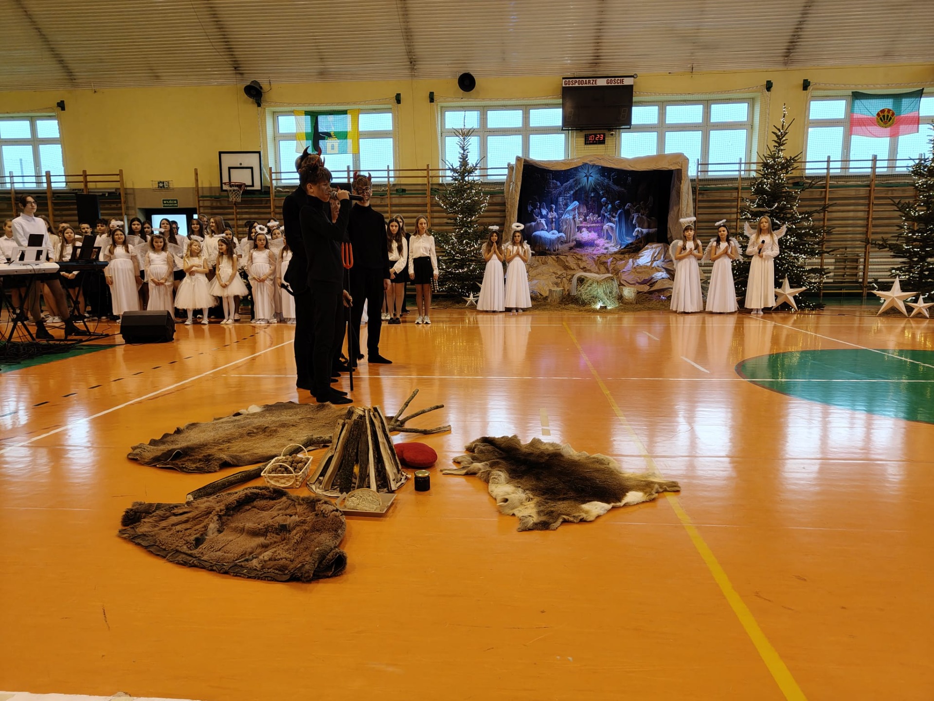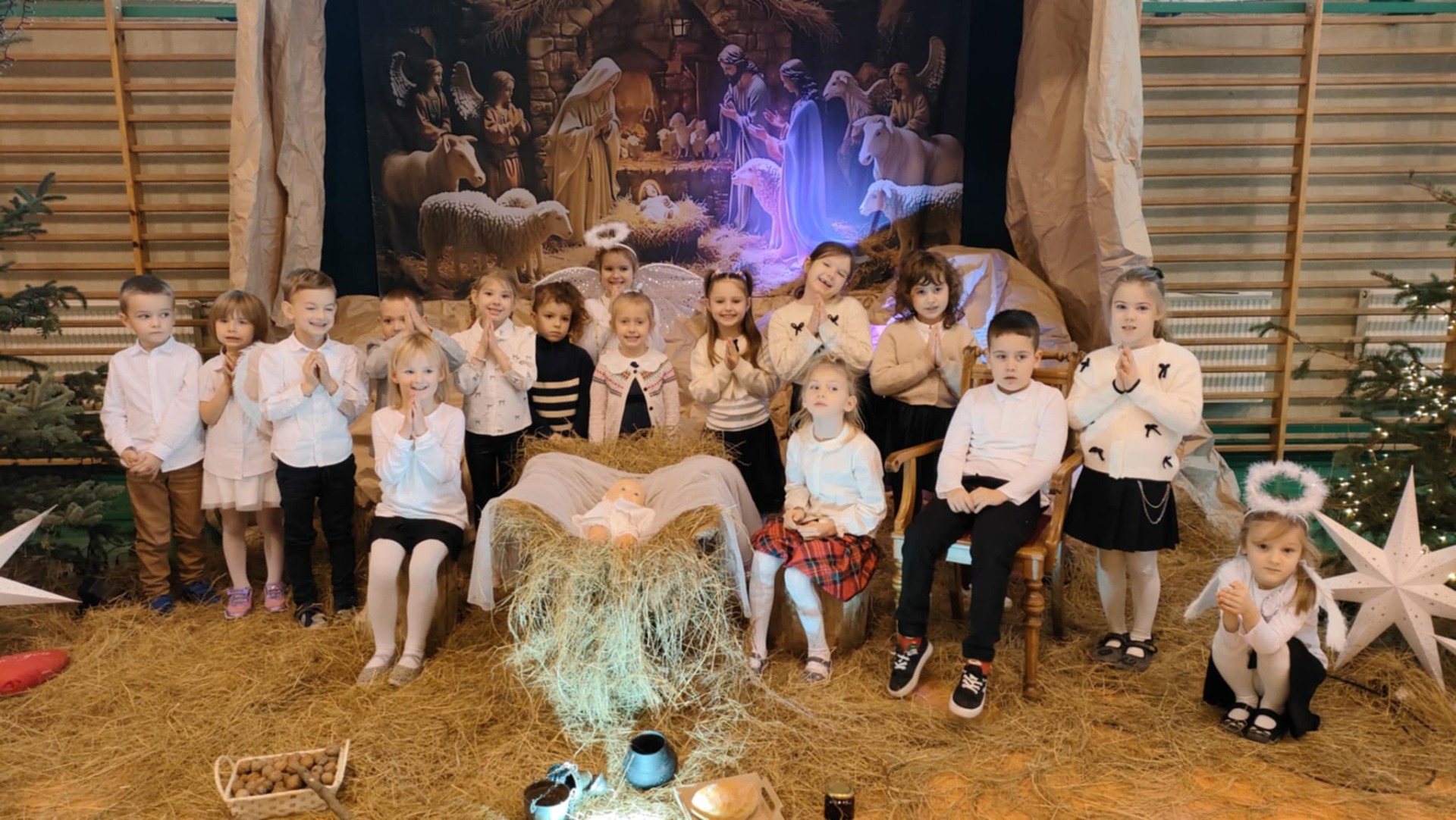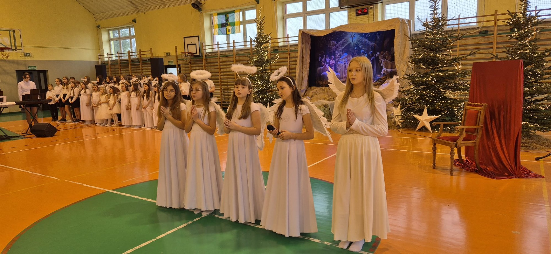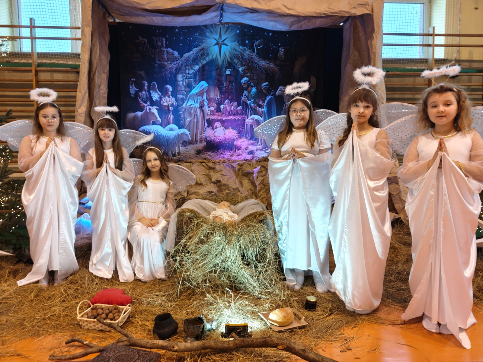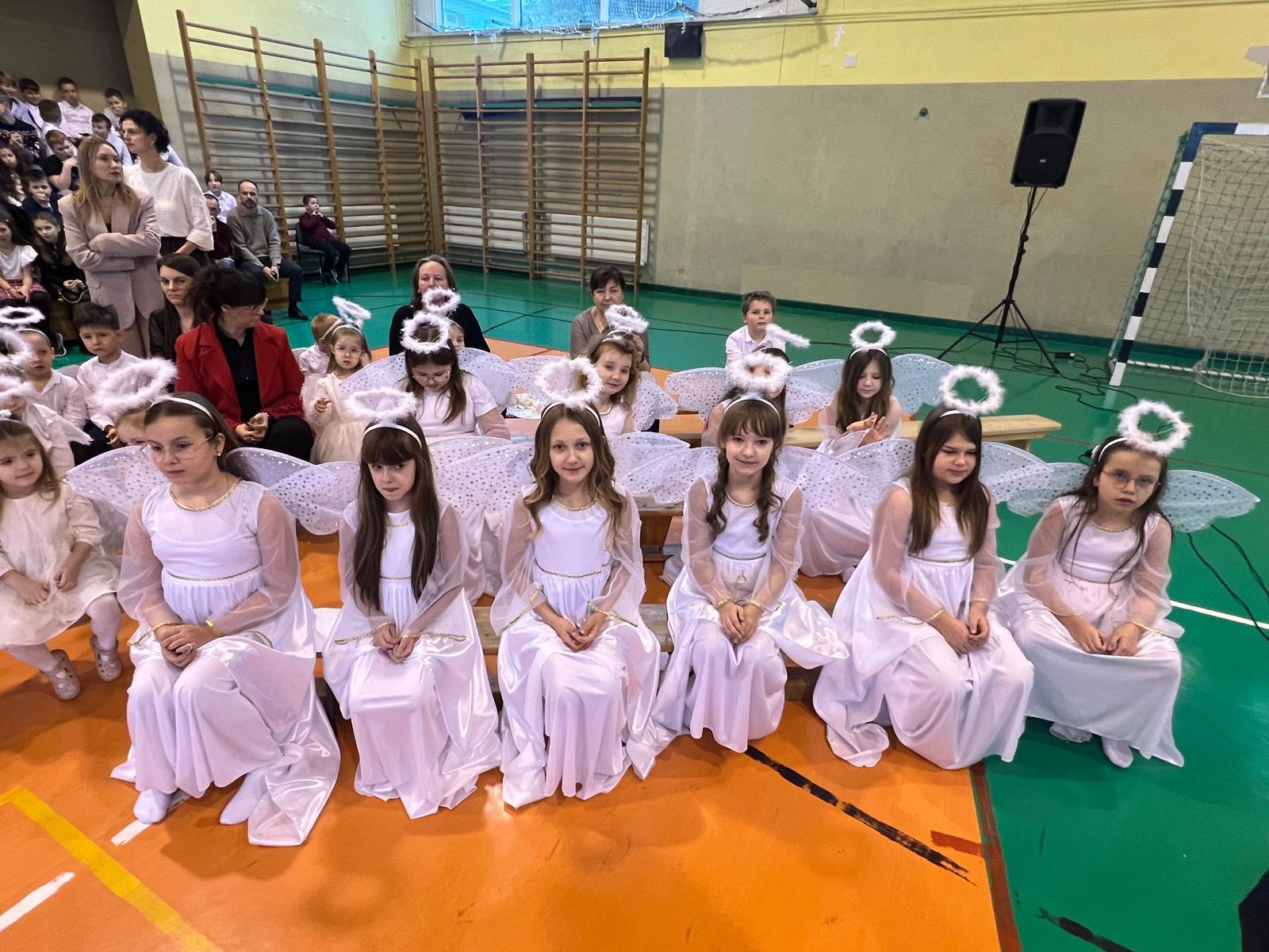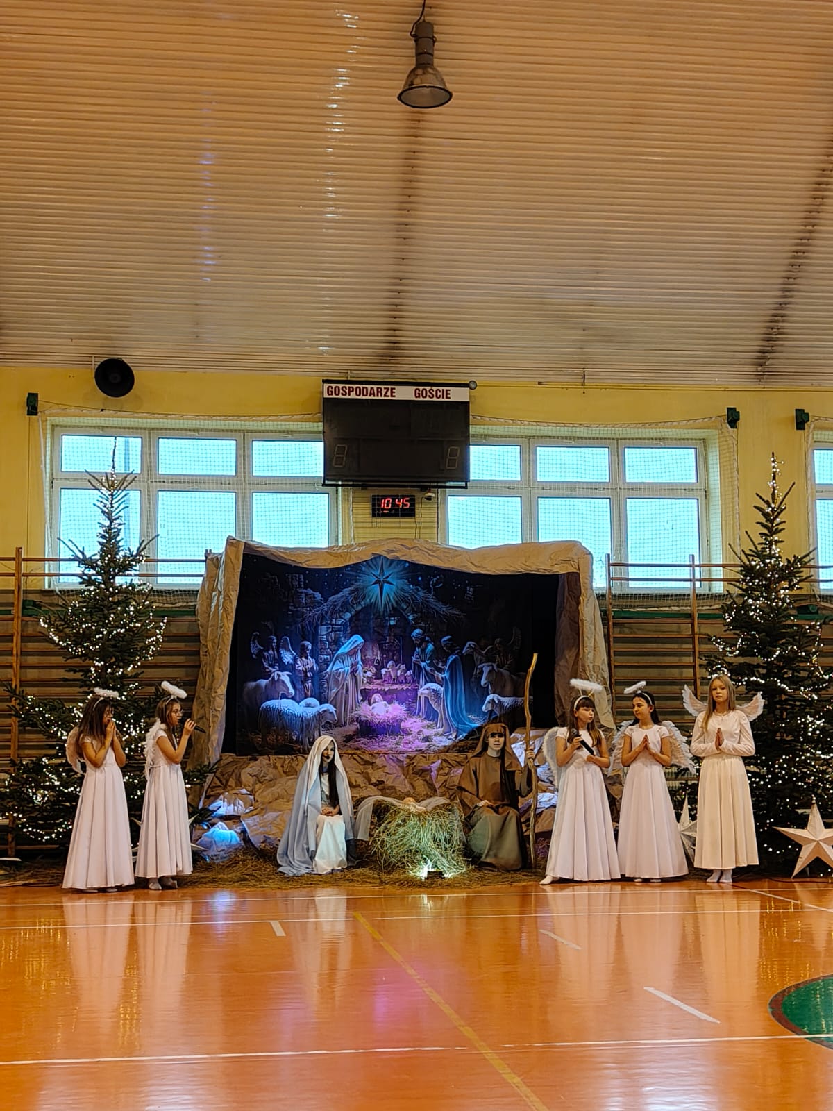 18 grudnia w naszej Szkole odbyły się tradycyjne jasełka przygotowane przez uczniów po opieką nauczycieli. Wydarzenie miało miejsce w hali sportowej, którą na tę okazję udekorowano świątecznymi ornamentami, gwiazdami oraz scenografią przedstawiającą Betlejem.