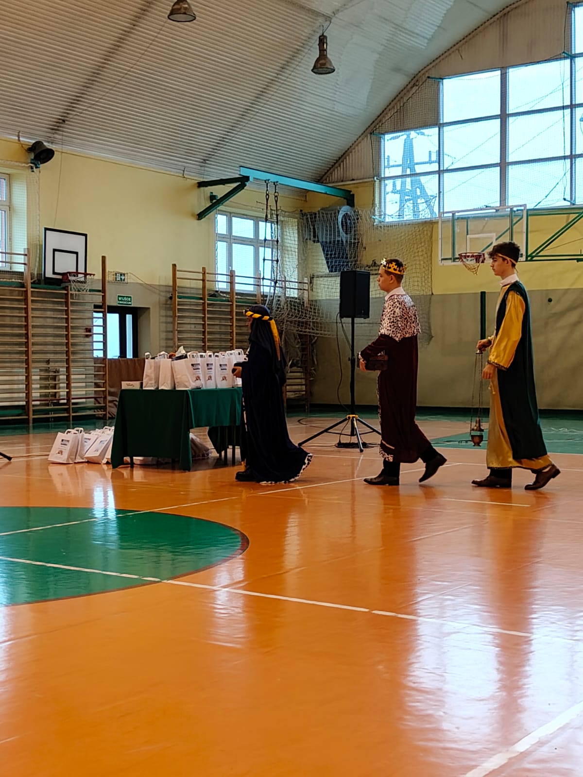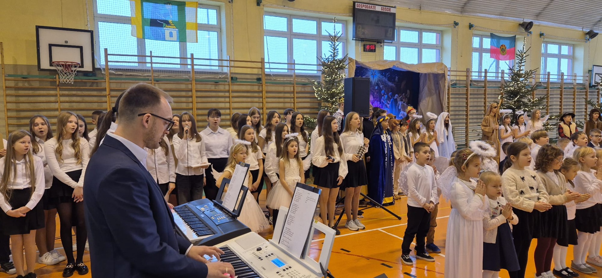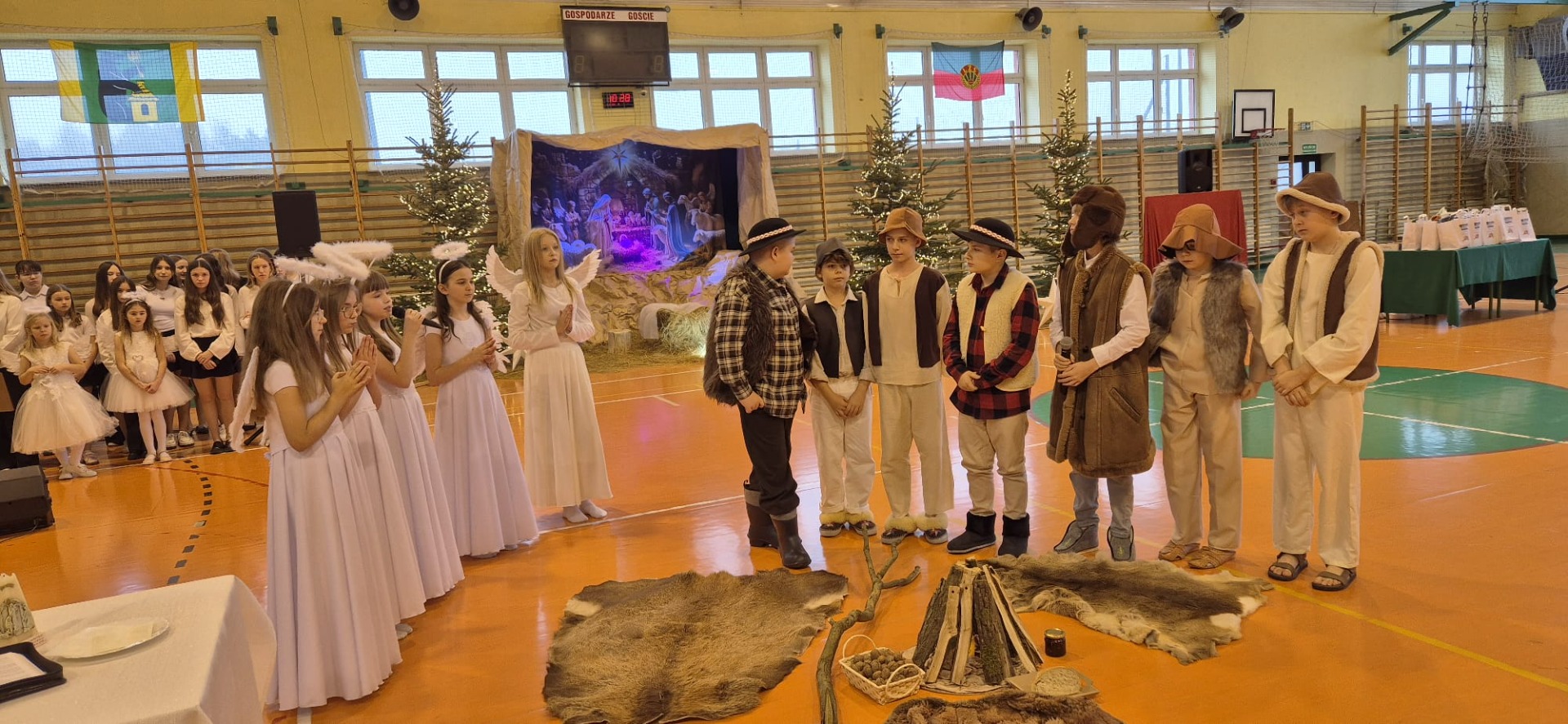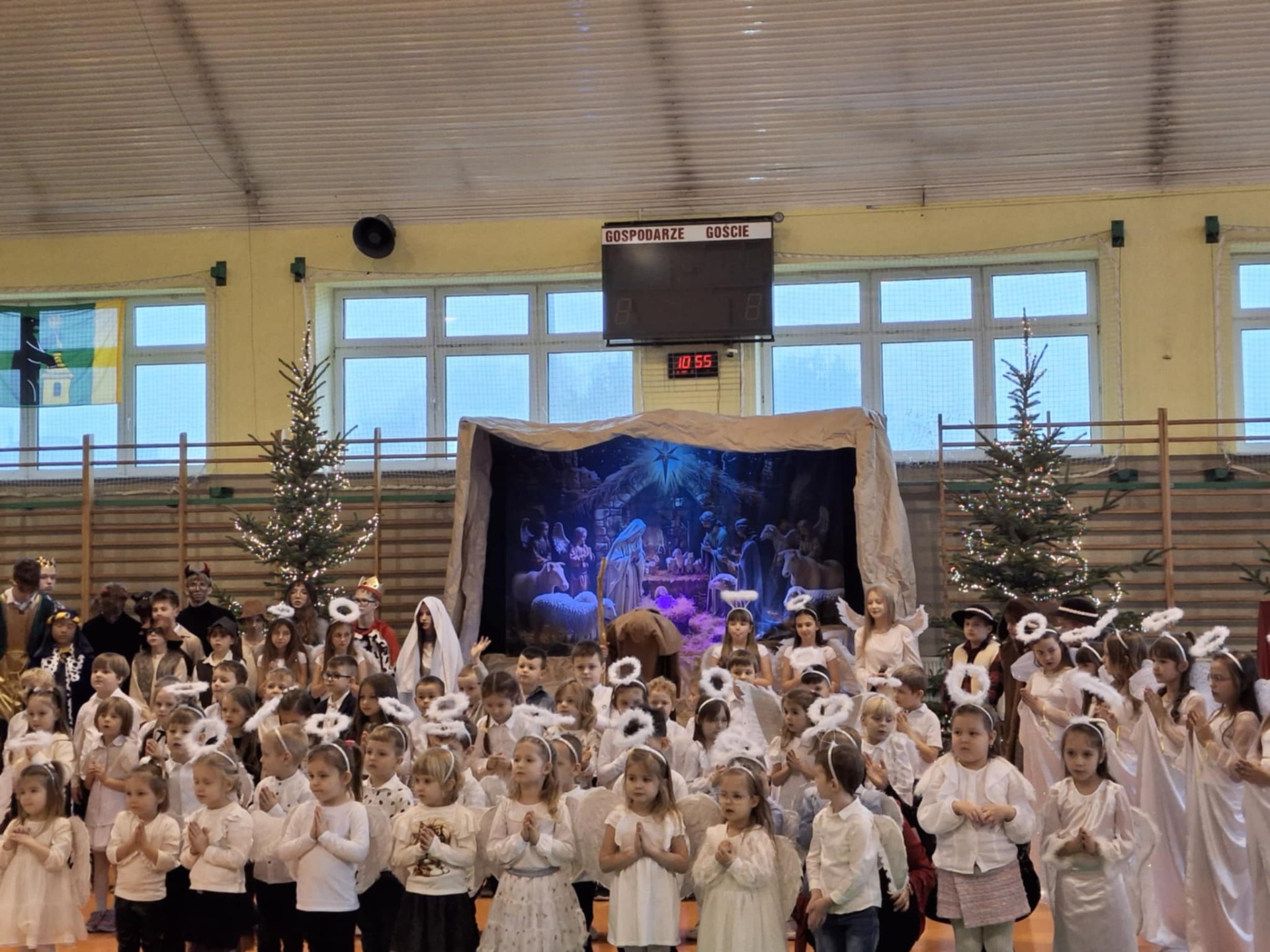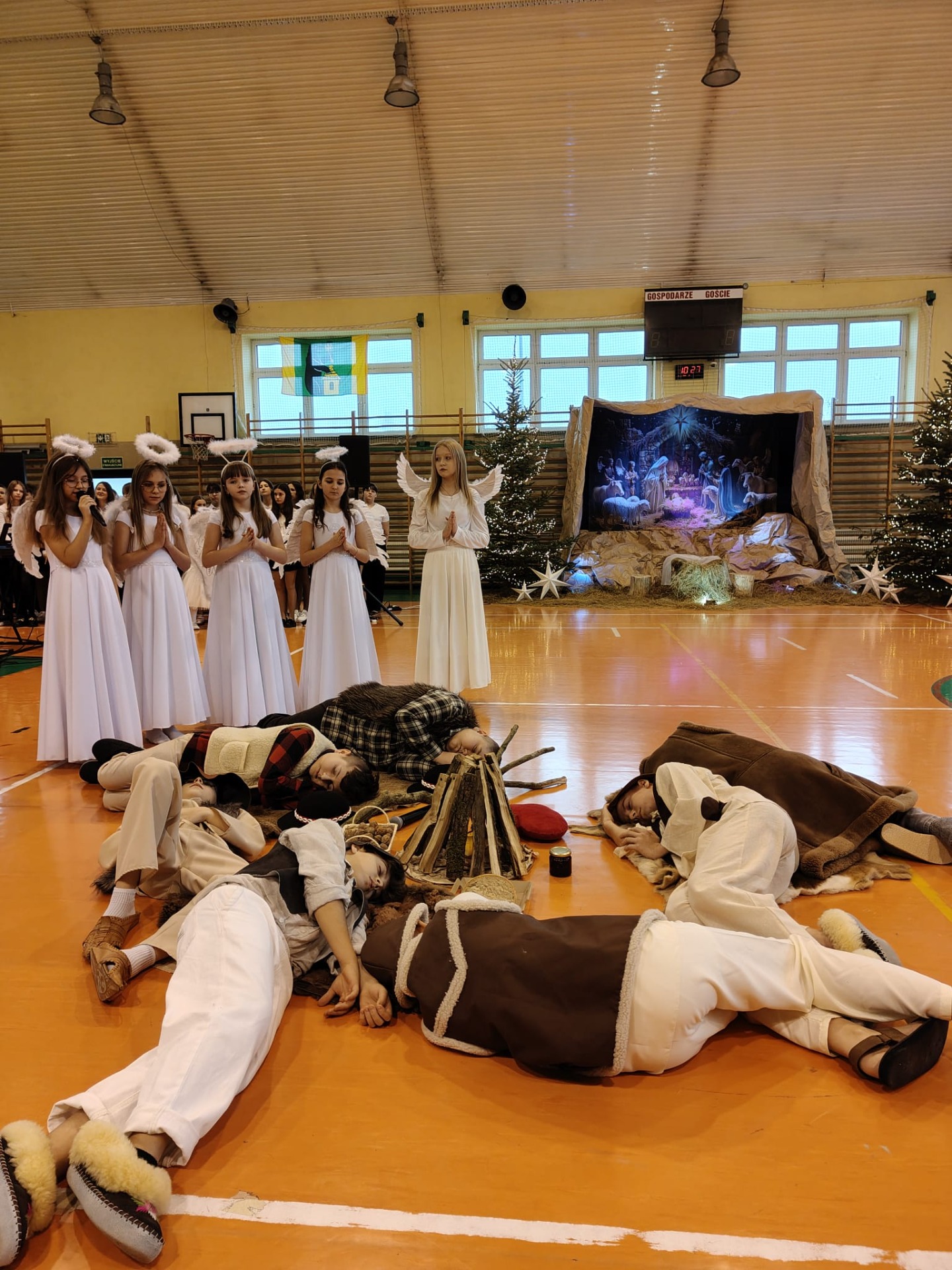 18 grudnia w naszej Szkole odbyły się tradycyjne jasełka przygotowane przez uczniów po opieką nauczycieli. Wydarzenie miało miejsce w hali sportowej, którą na tę okazję udekorowano świątecznymi ornamentami, gwiazdami oraz scenografią przedstawiającą Betlejem.