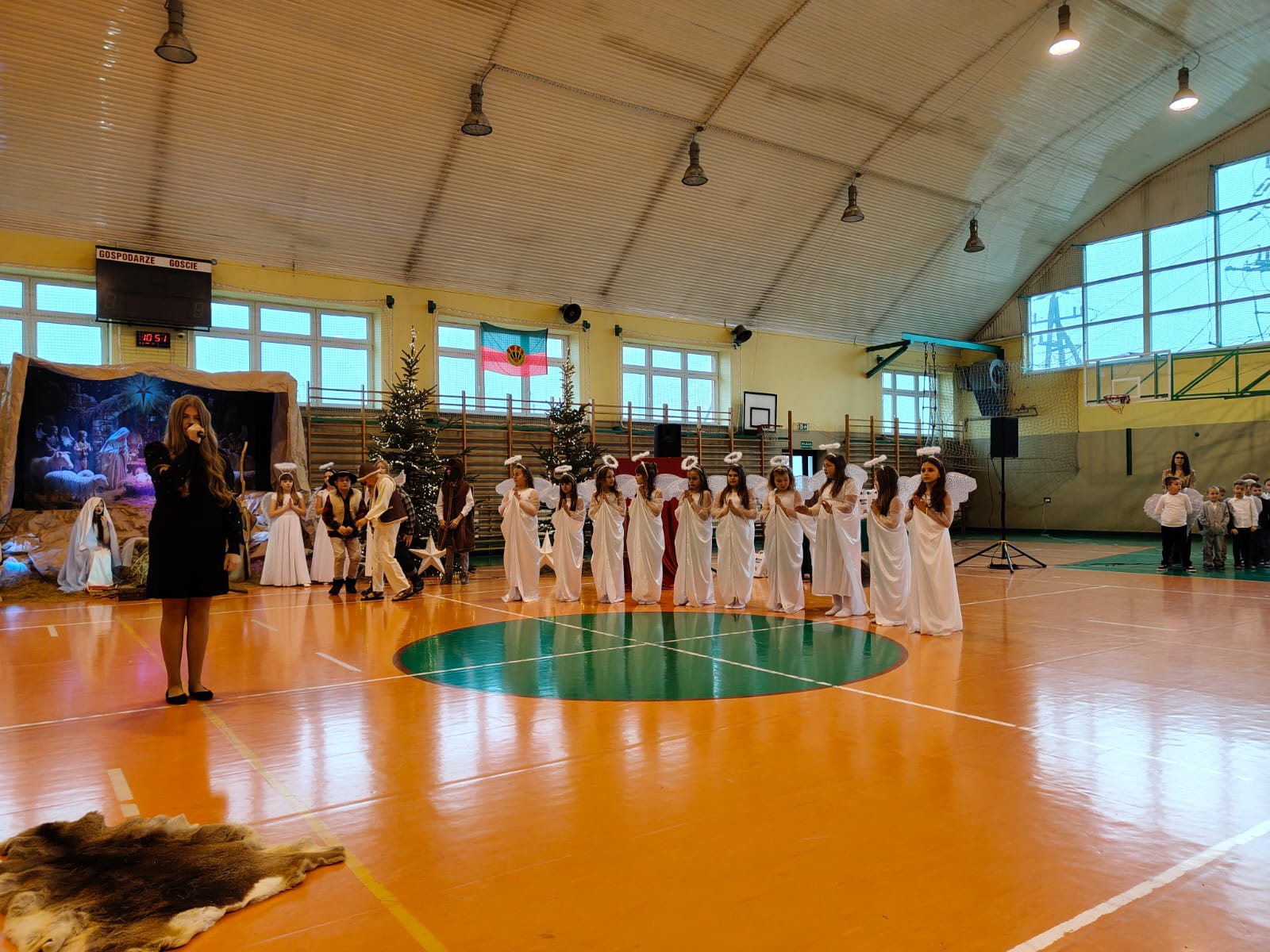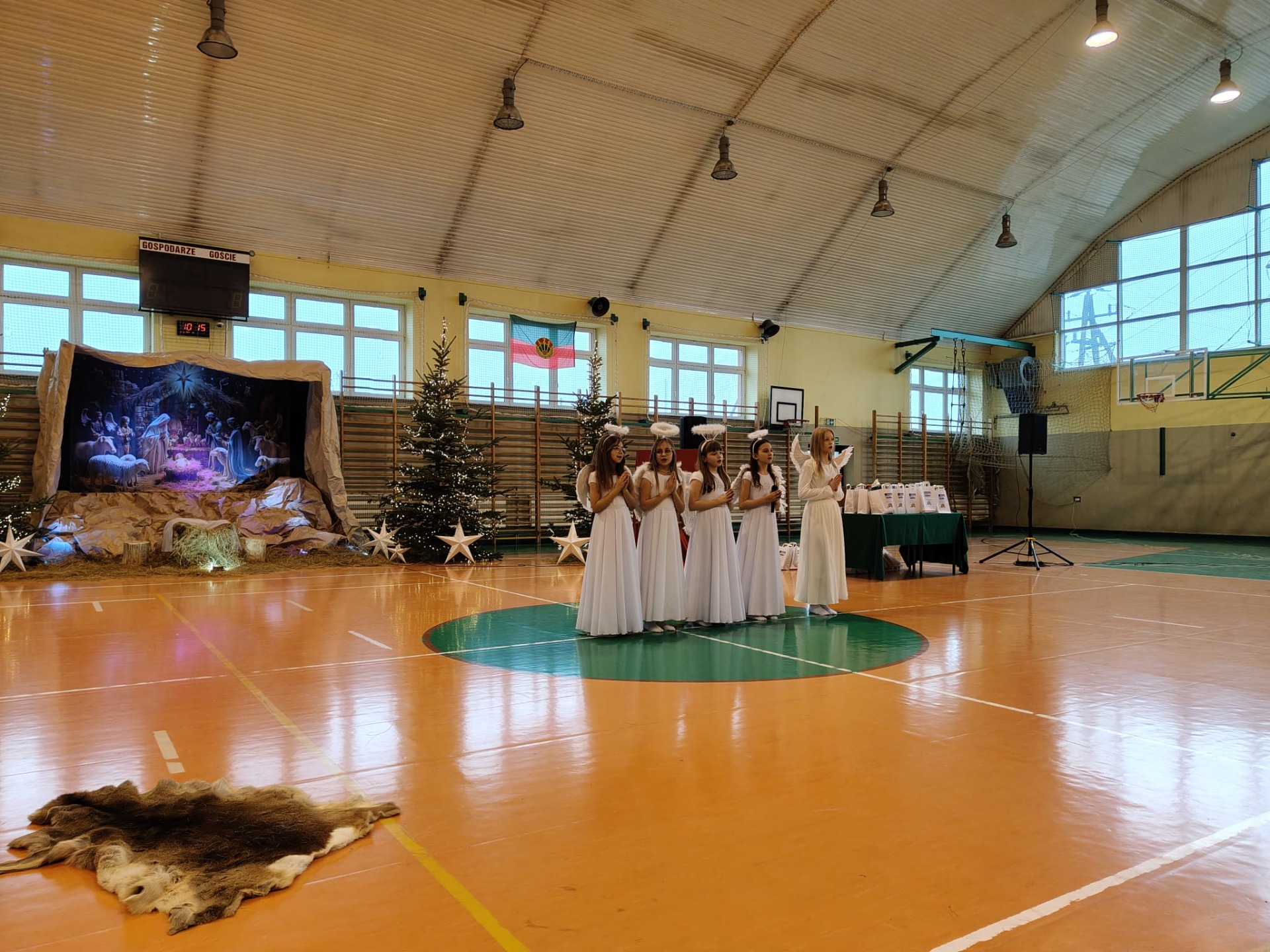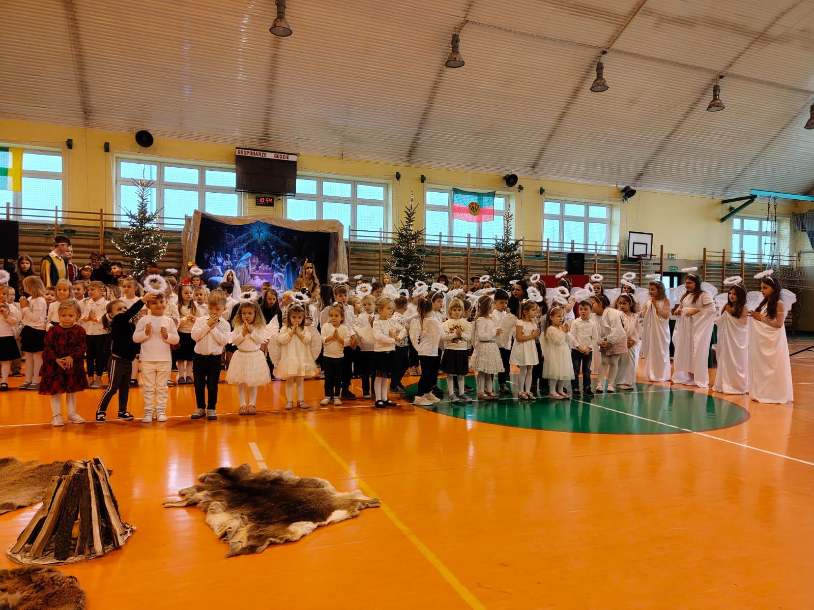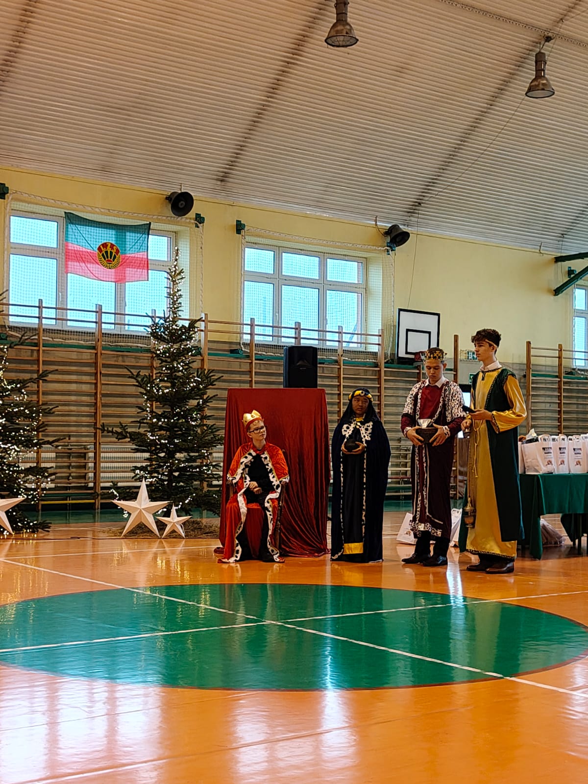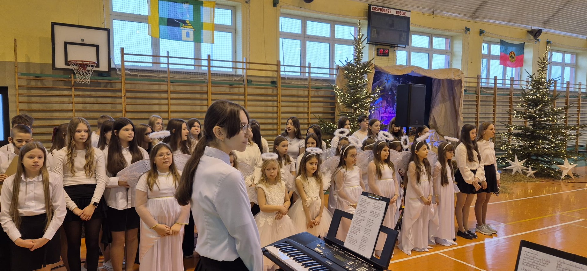 18 grudnia w naszej Szkole odbyły się tradycyjne jasełka przygotowane przez uczniów po opieką nauczycieli. Wydarzenie miało miejsce w hali sportowej, którą na tę okazję udekorowano świątecznymi ornamentami, gwiazdami oraz scenografią przedstawiającą Betlejem.